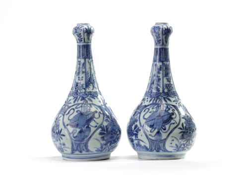 A pair of Chinese moulded blue and white 'Kraak' garlic neck vases