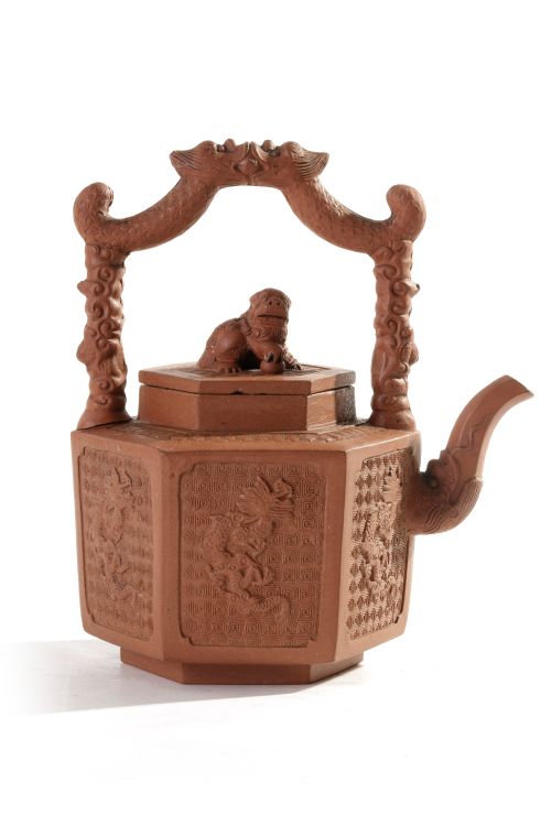 A Chinese yixing hexagonal 'dragon' teapot and cover