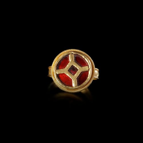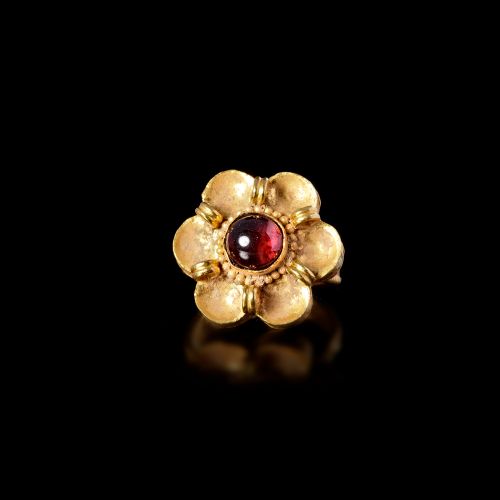 A GOLD GOTHIC RING WITH A GARNET INLAID BEZEL, 5TH CENTURY AD