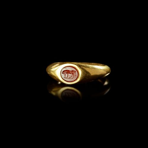 A LARGE ROMAN GOLD RING WITH AN INTAGLIO OF A COW, 1ST-2ND CENTURY AD