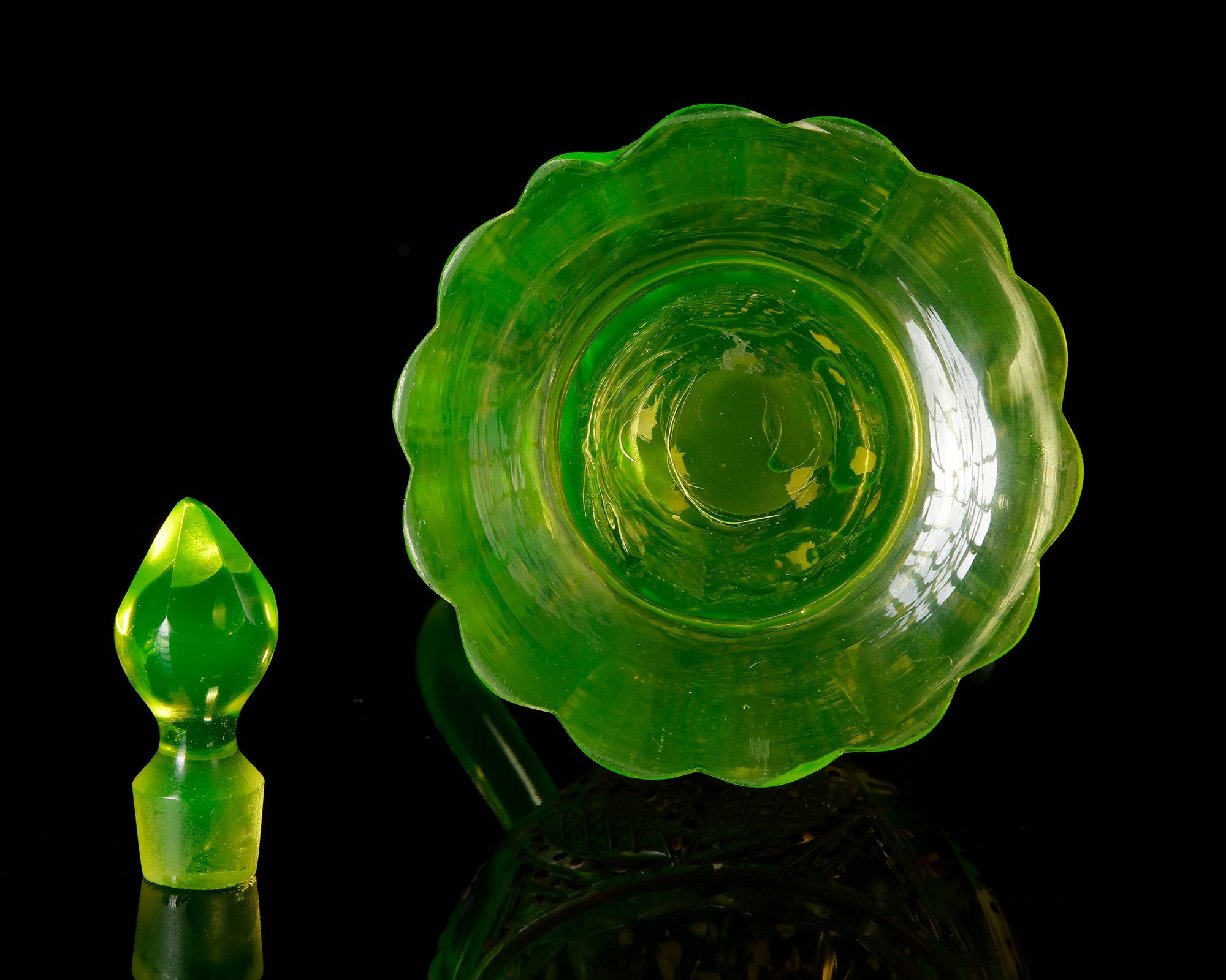 Of translucent uranium-green glass. The vessel stands on a broad scalloped circular foot and has a pear-shaped body rising to a tall, tapering neck, fitted with a long curved spout and an opposing loop handle. The mouth is closed with a matching stopper surmounted by a pointed finial.