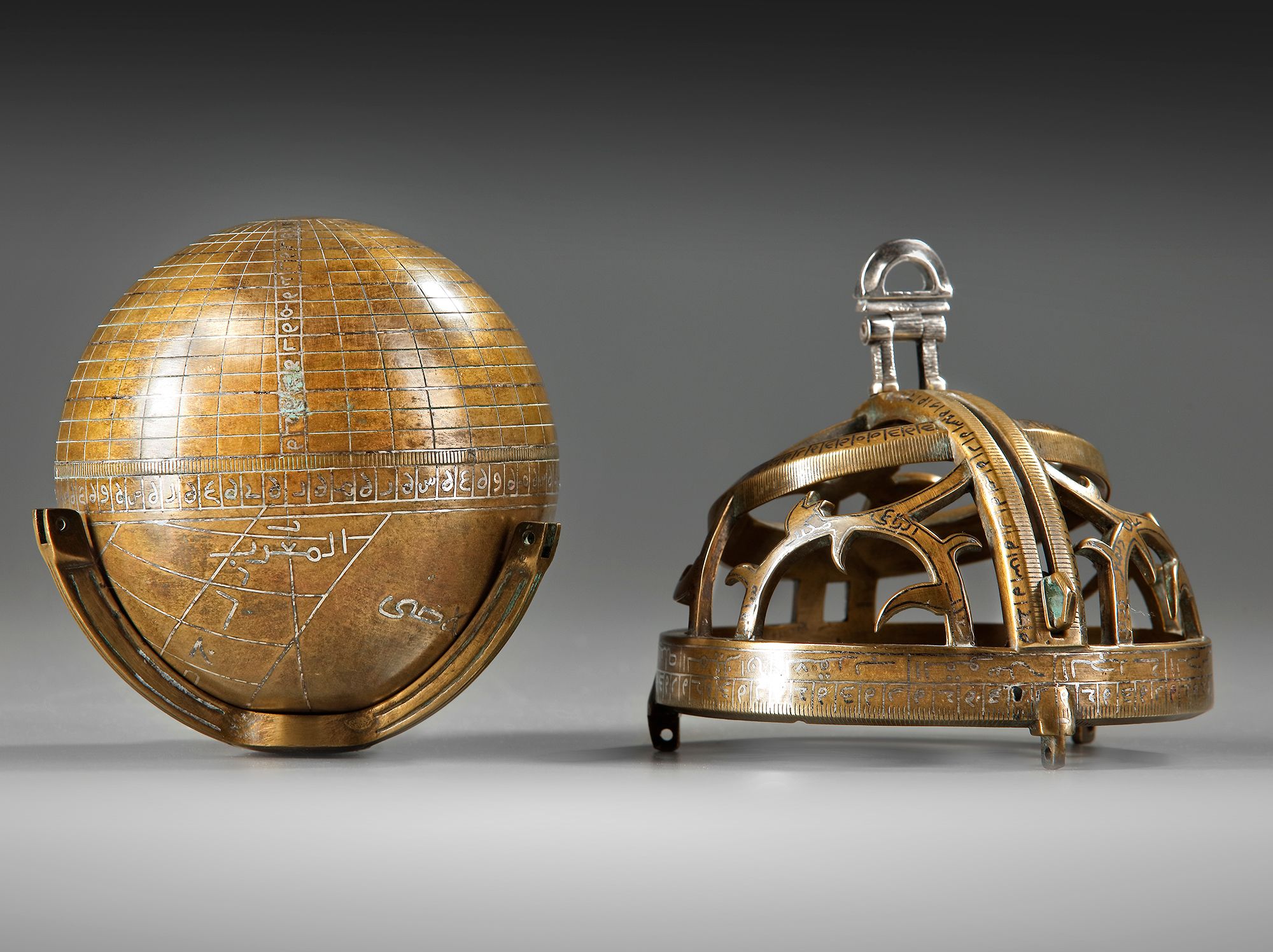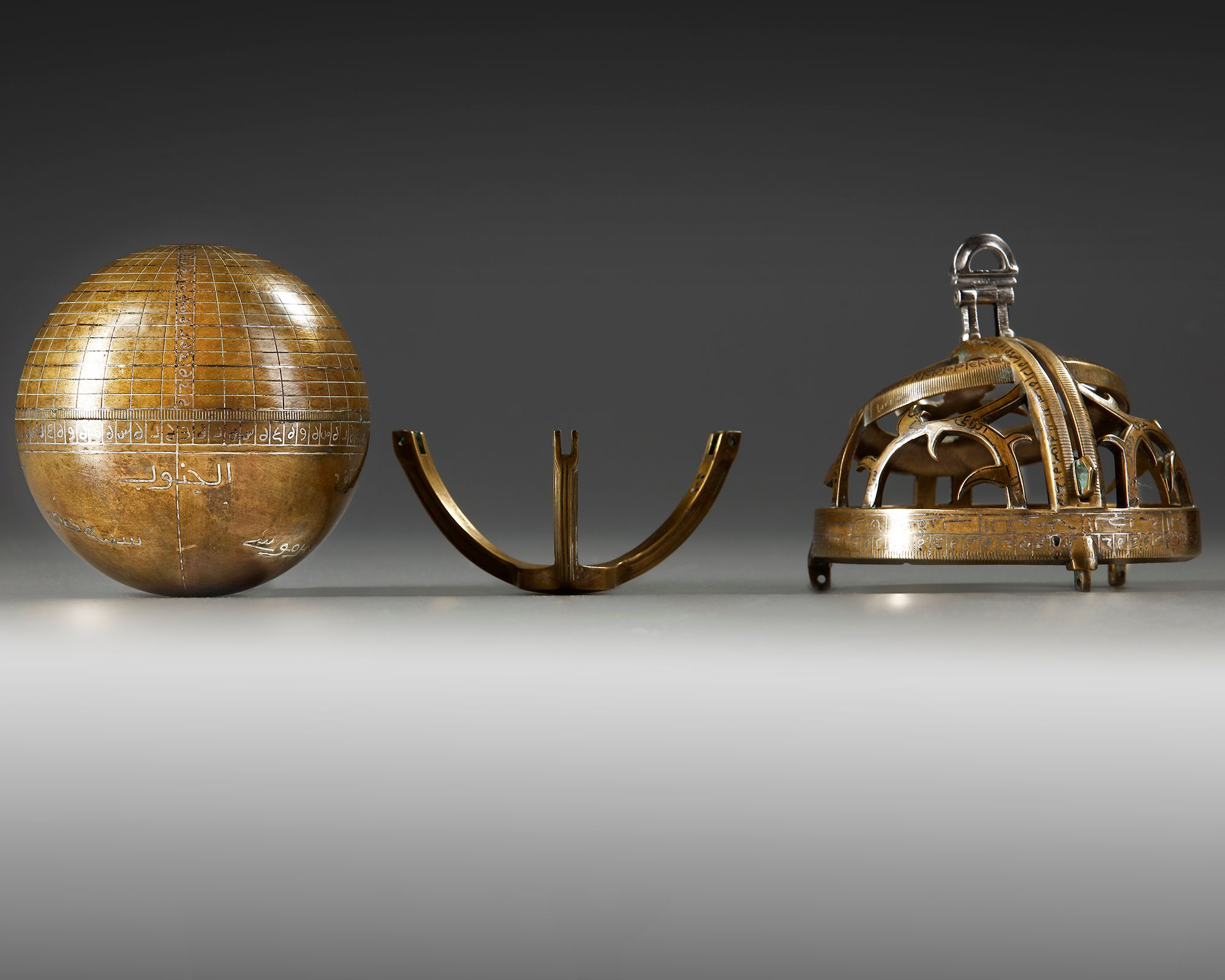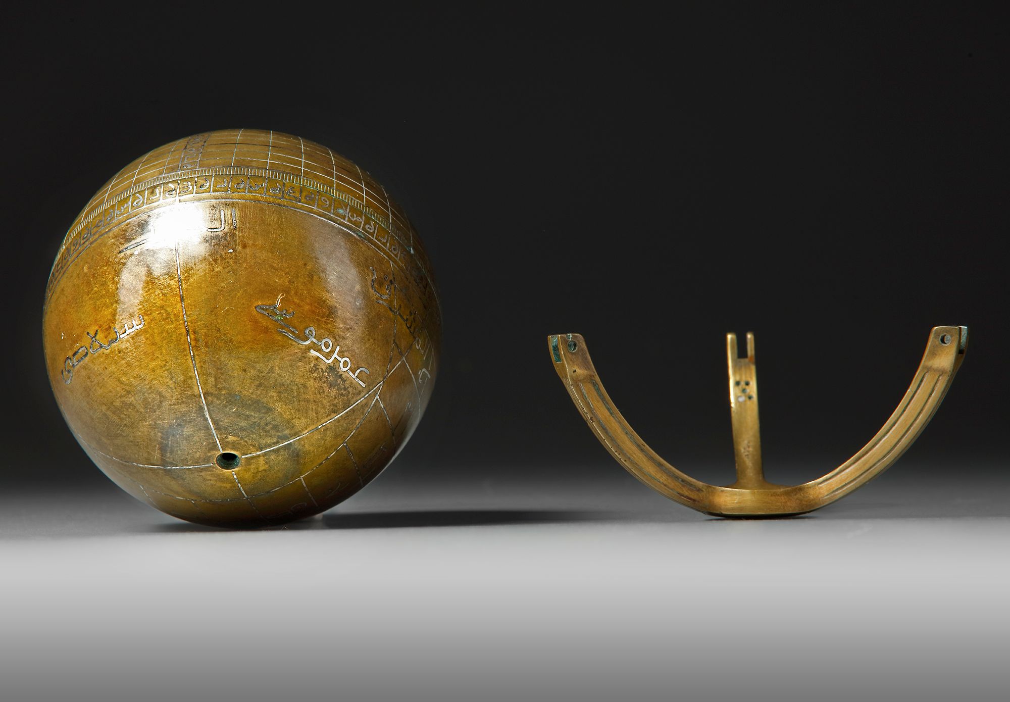 The ecliptic and celestial equator divided into degrees and minutes, with tropical and polar circles. The maker signed and dated the globe, “The work of Mūsa. Year 885.”