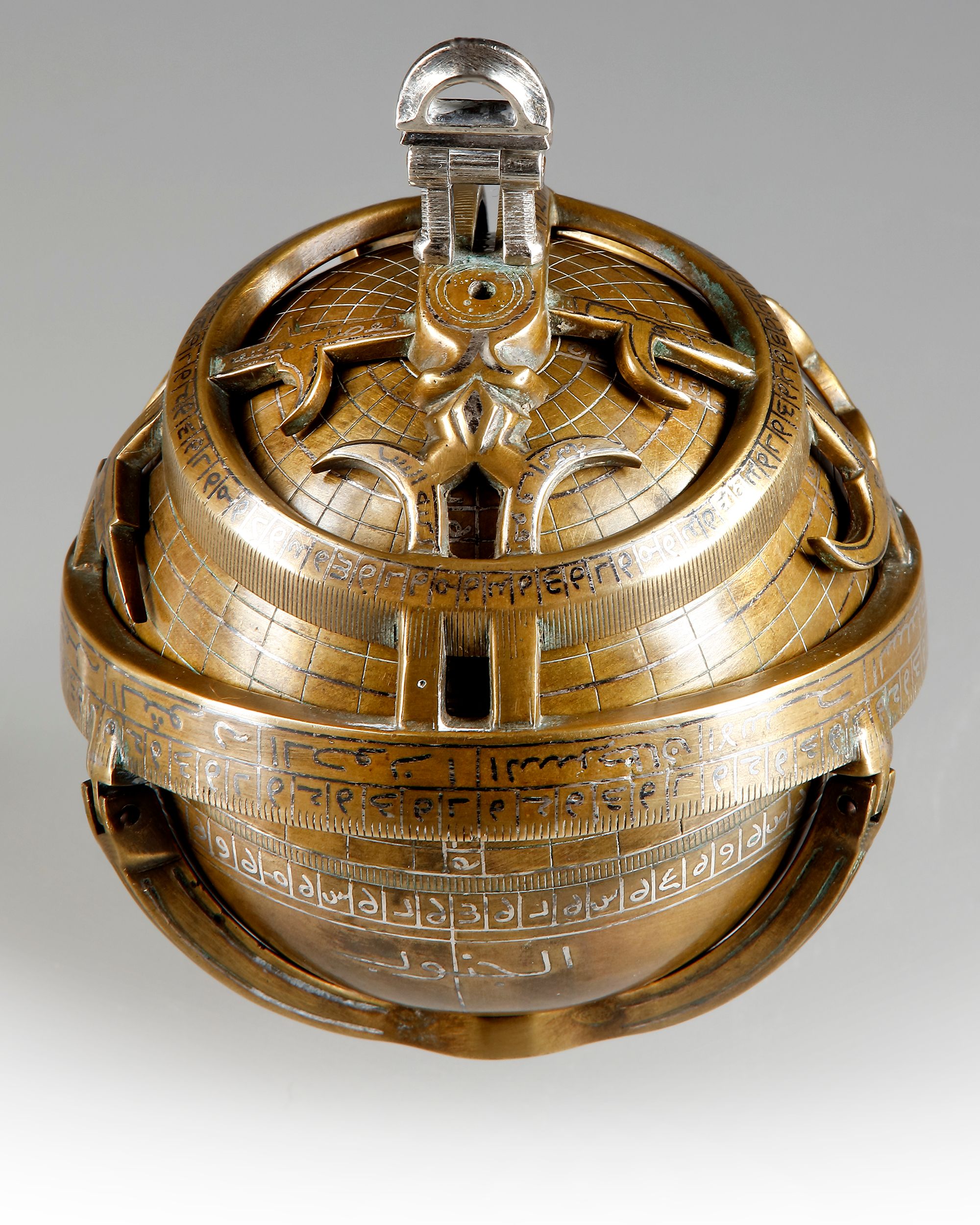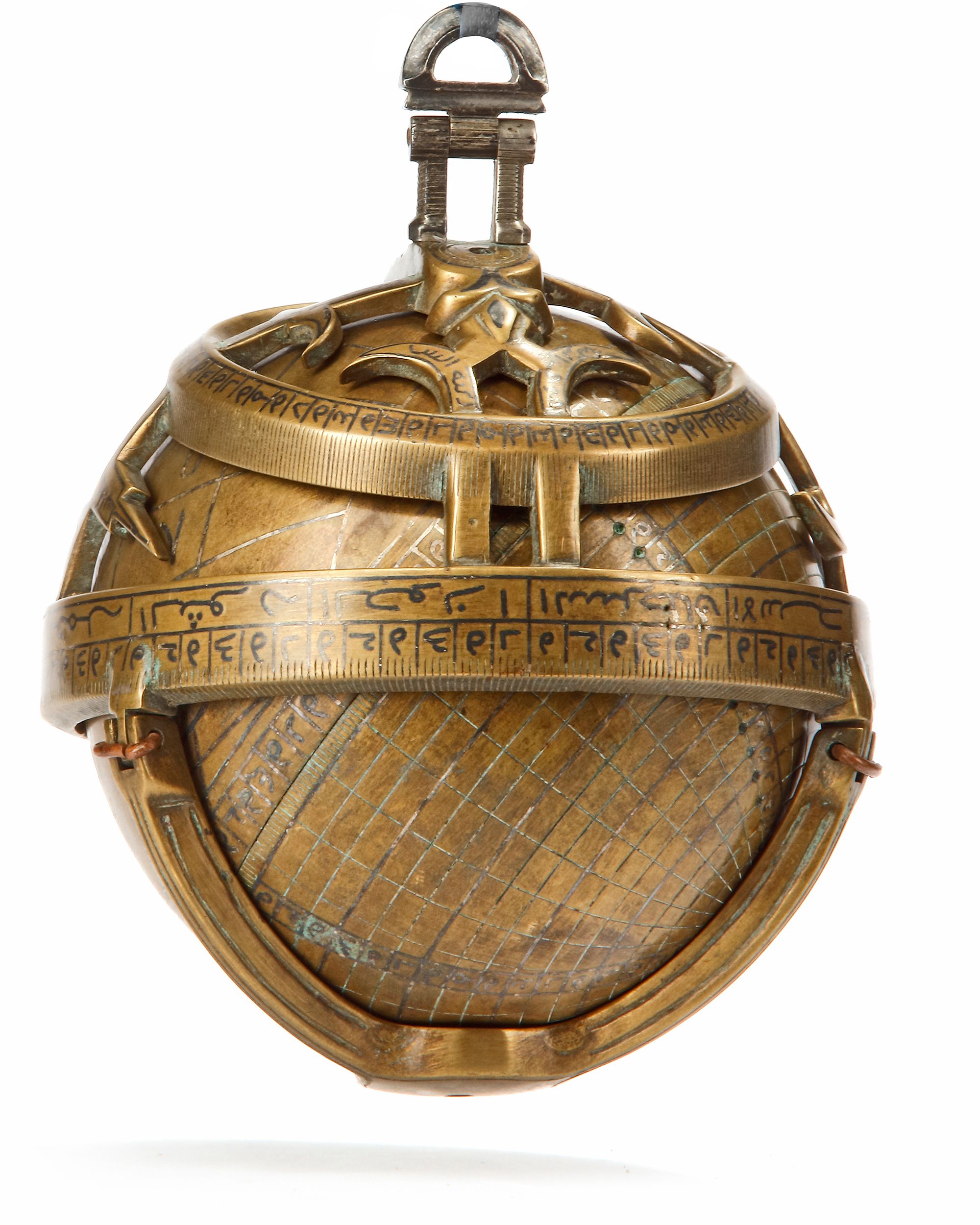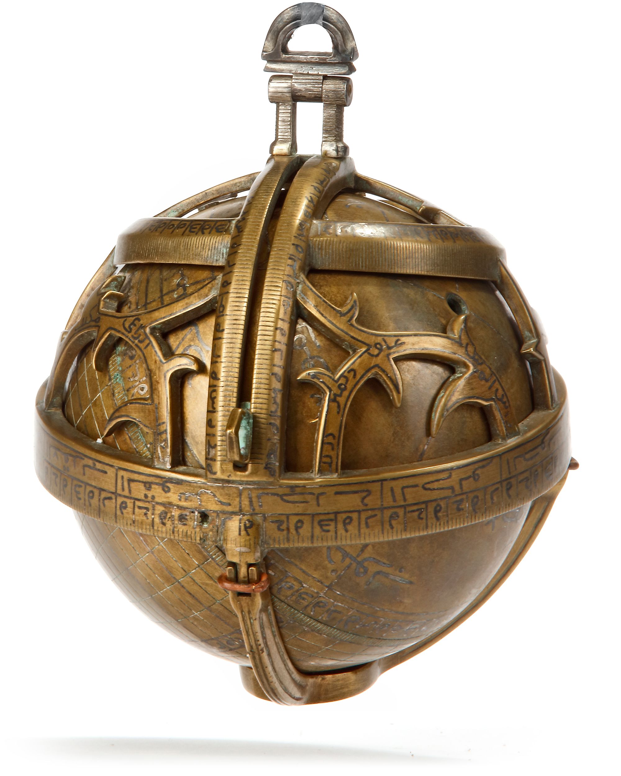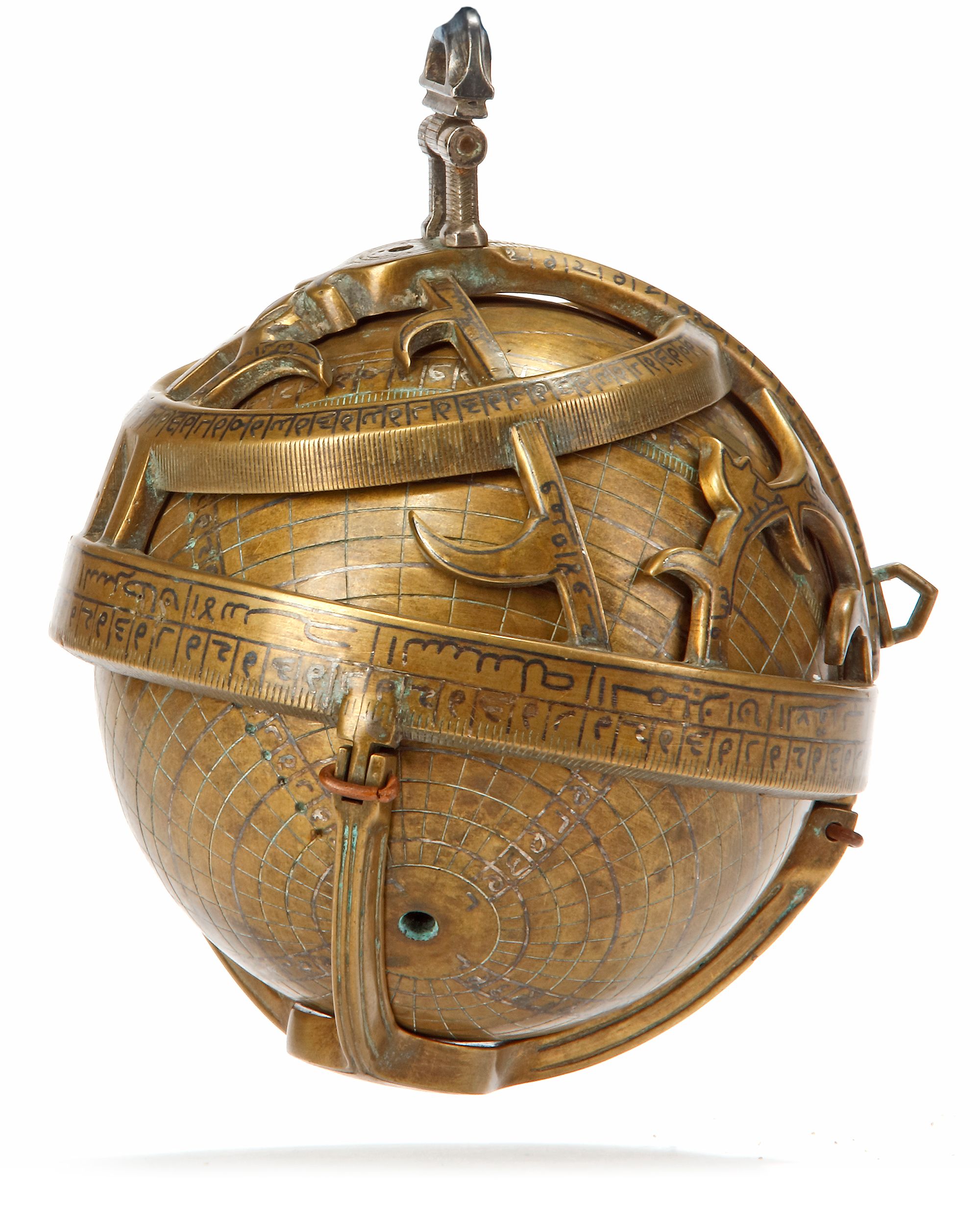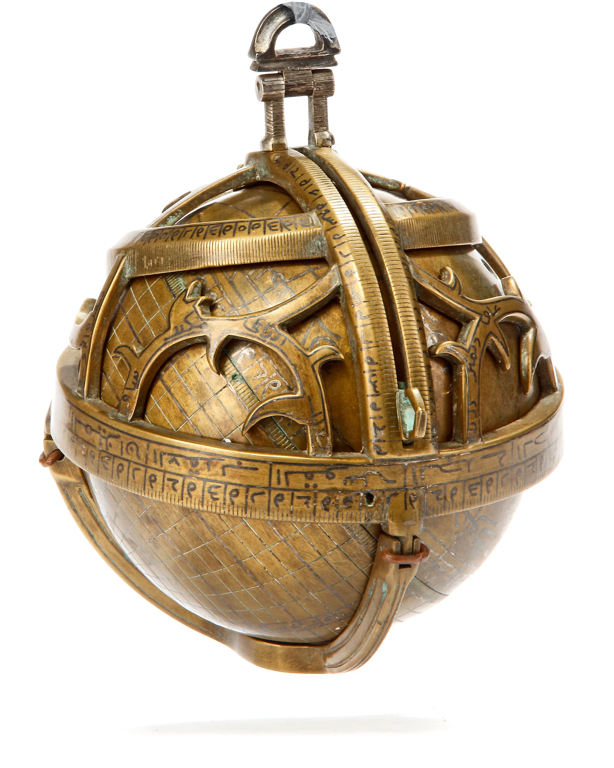Engraved brass sphere, indicating the lines of the ecliptic and the equator, the meridian lines, the two poles,  the twelve signs of the zodiac and the fixed stars with cursive inscriptions.