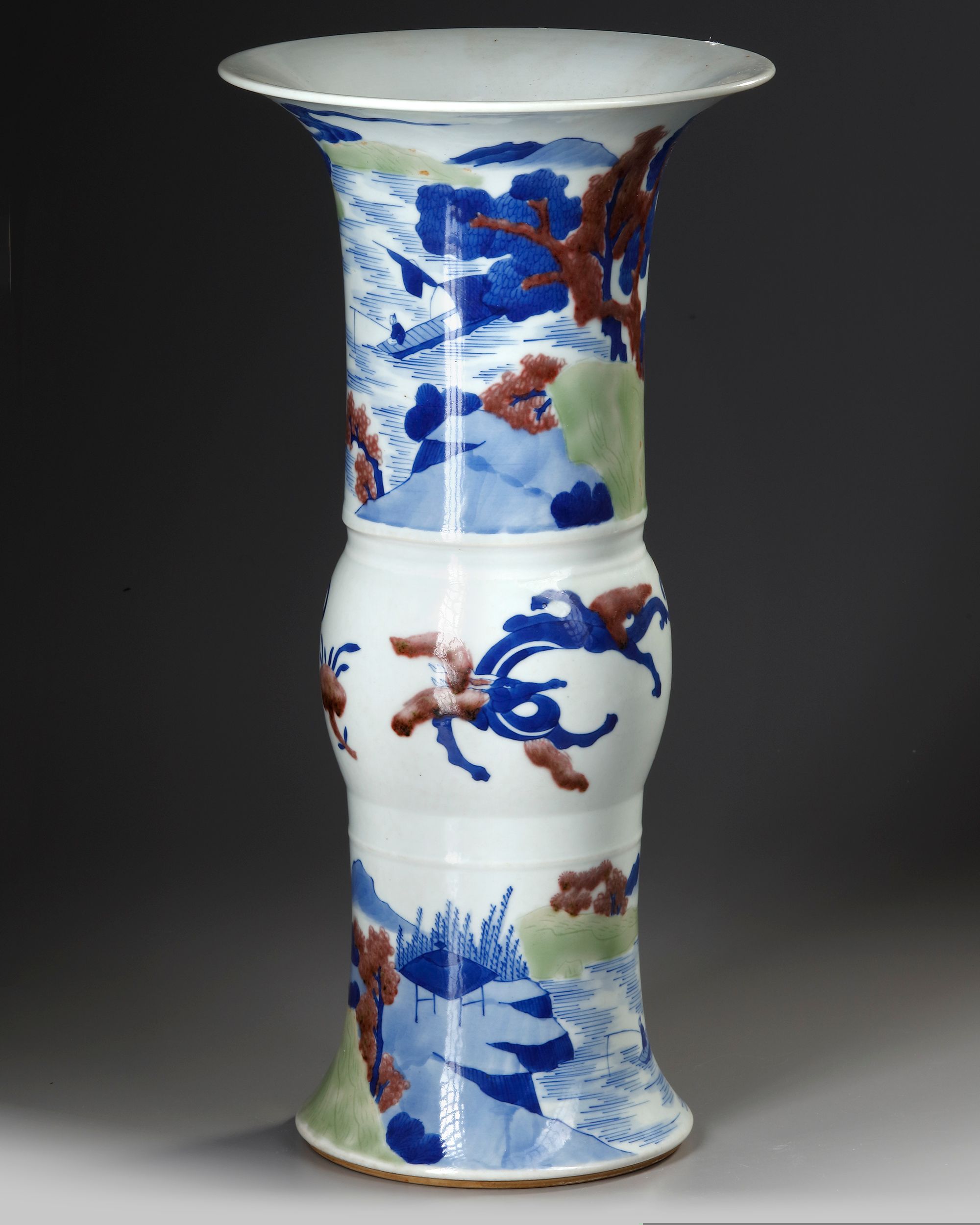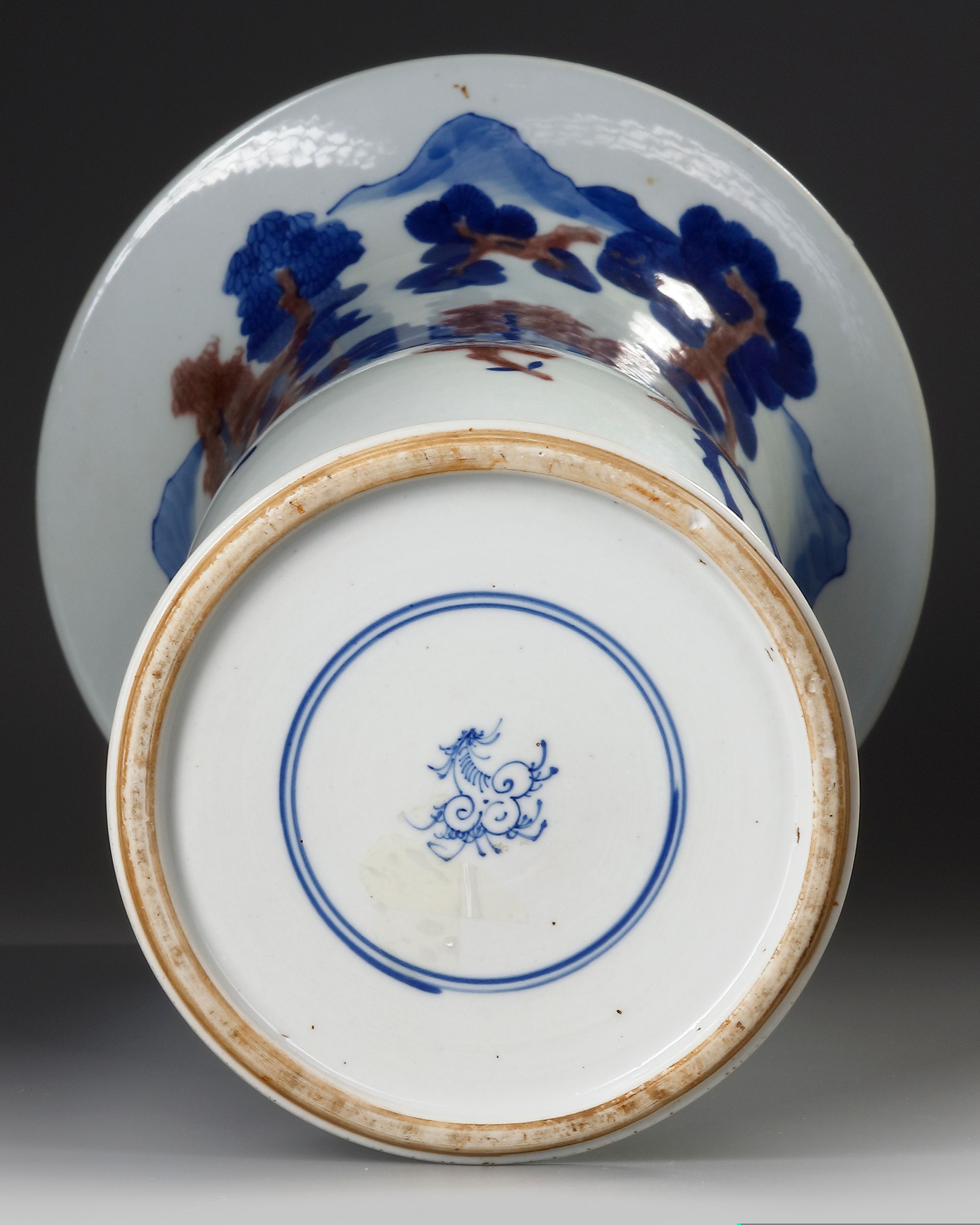 The upper and lower sections finely carved and decorated with riverscapes, including a scholar standing on a promontory near a pavilion as he looks out at the river, with a fisherman in his boat below, the design repeated in smaller format in the lower section, the middle section with two lively striding chilong separated by sprigs of lingzhi fungus.