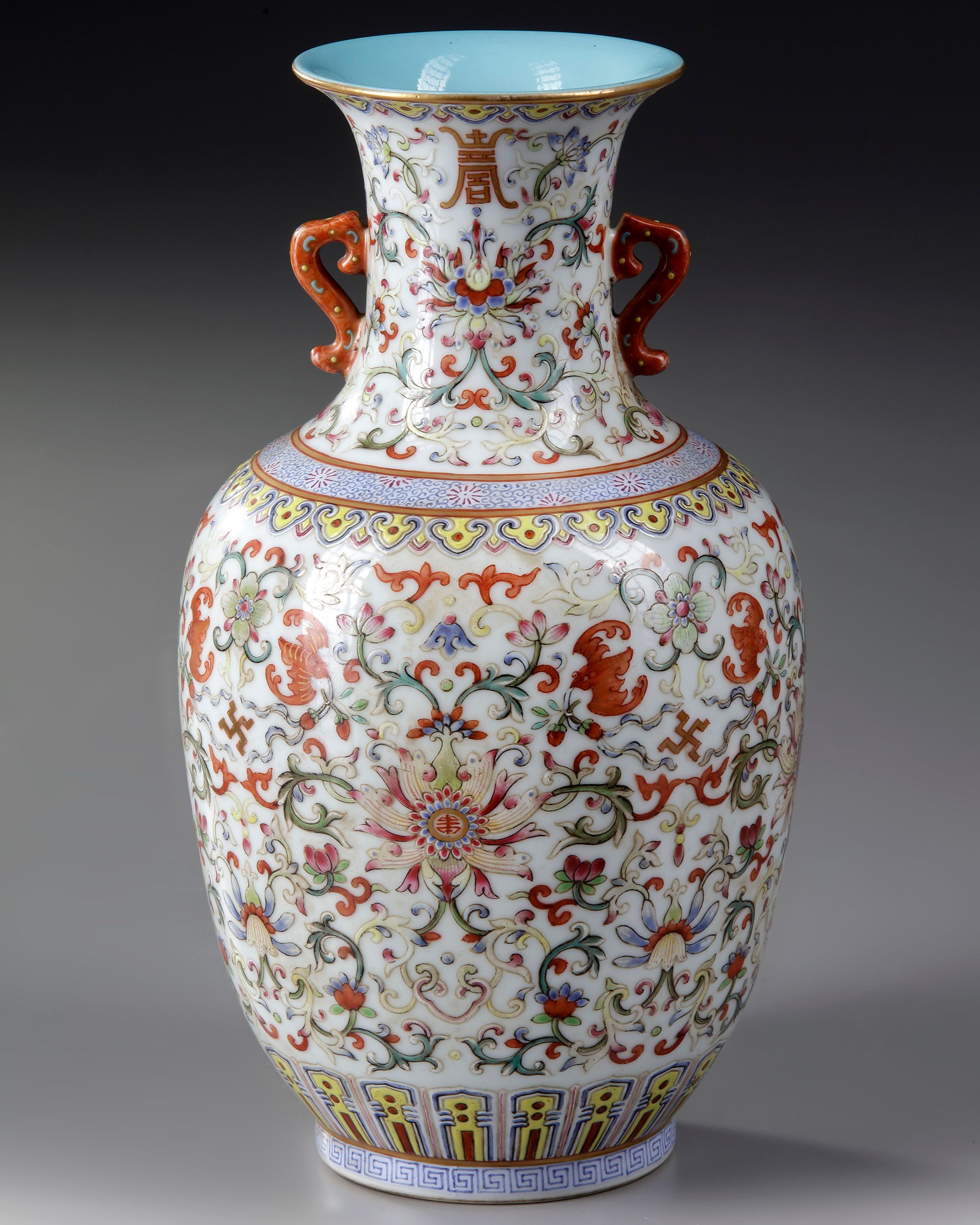 The exterior is decorated with characters, amongst densely scrolling lotus, all below a ruyi-head band at the rim. The everted rim is decorated with further scrolling lotus.