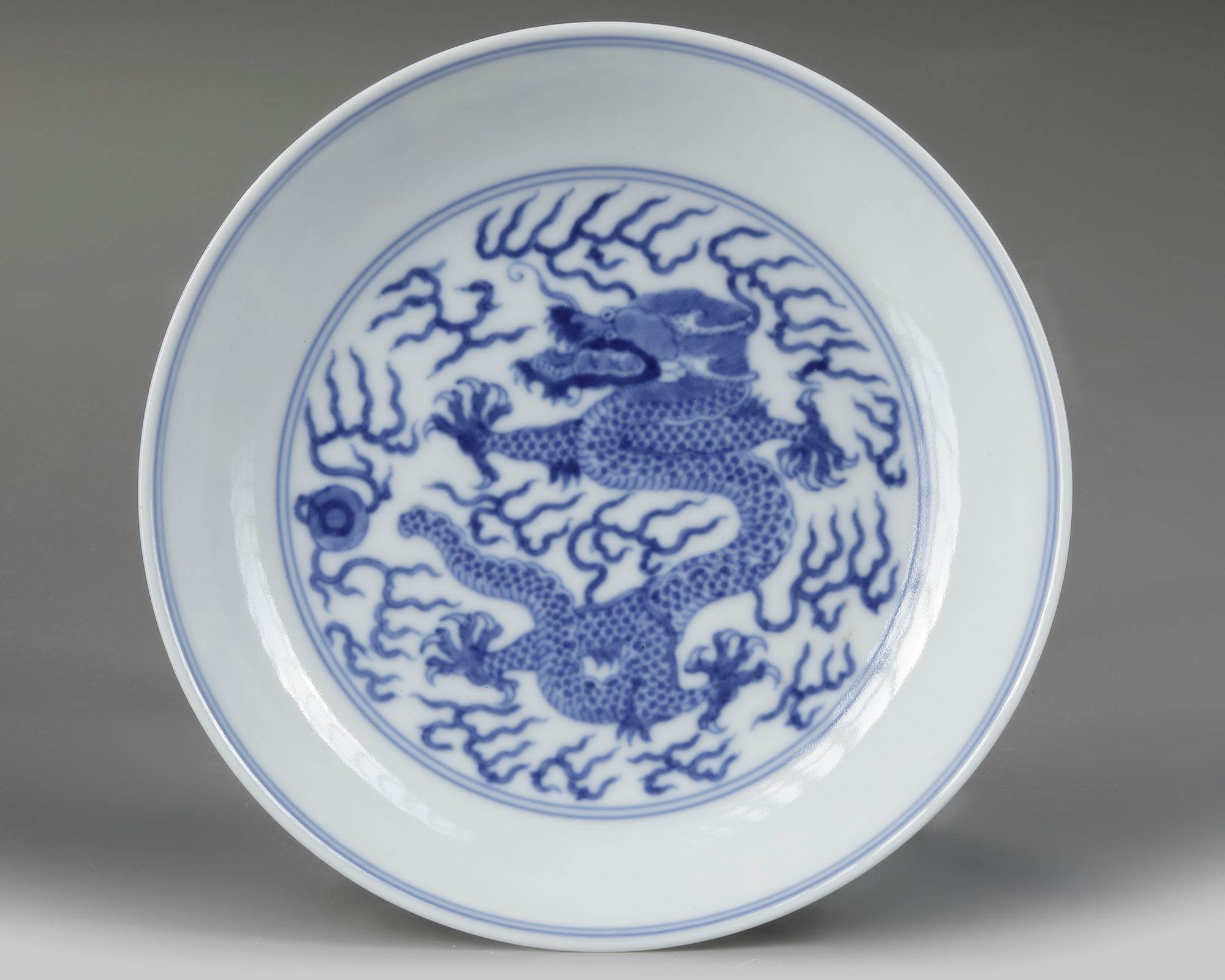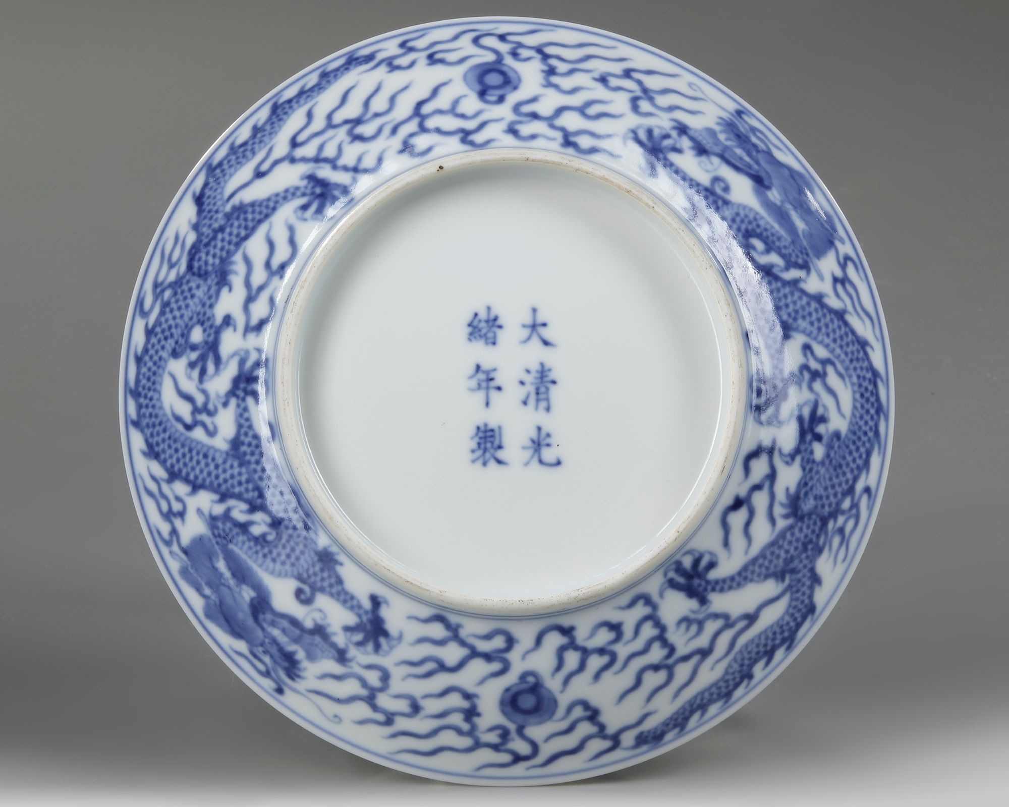 A Chinese blue and white dish decorated to the interior with a roundel enclosing a five-clawed dragon chasing a flaming pearl amongst clouds. The exterior with two dragons chasing a flaming pearl amongst clouds. The bottom with a Chinese Guangxu six character mark.
