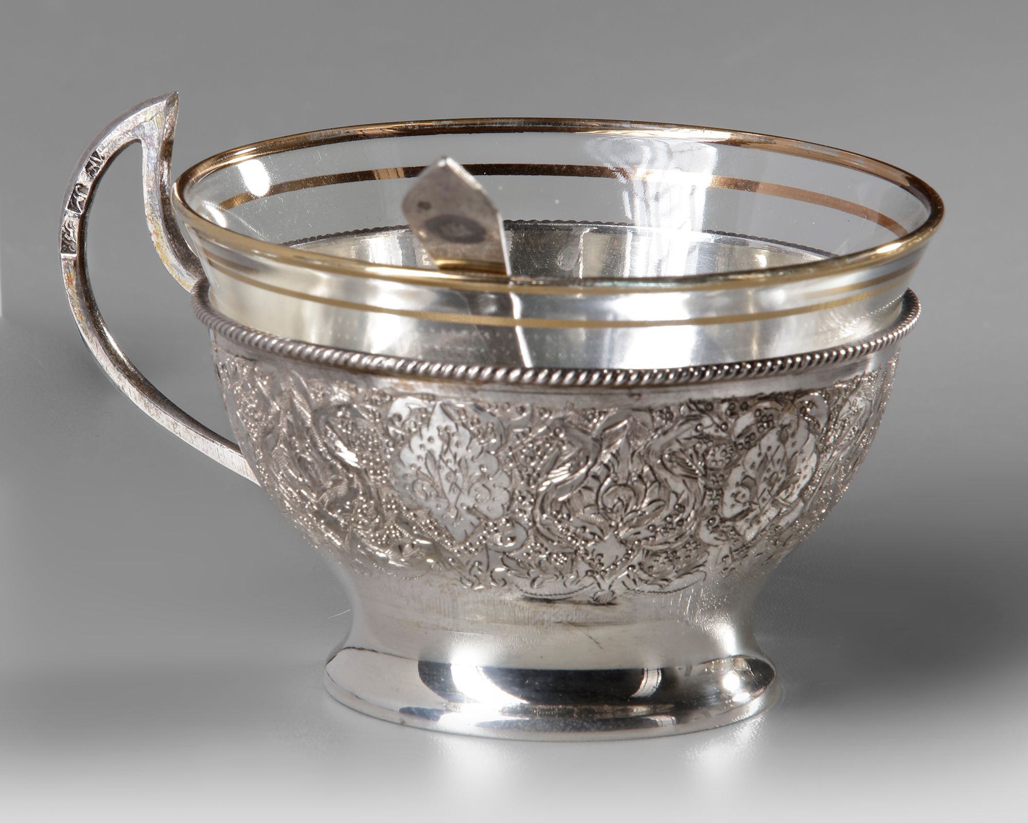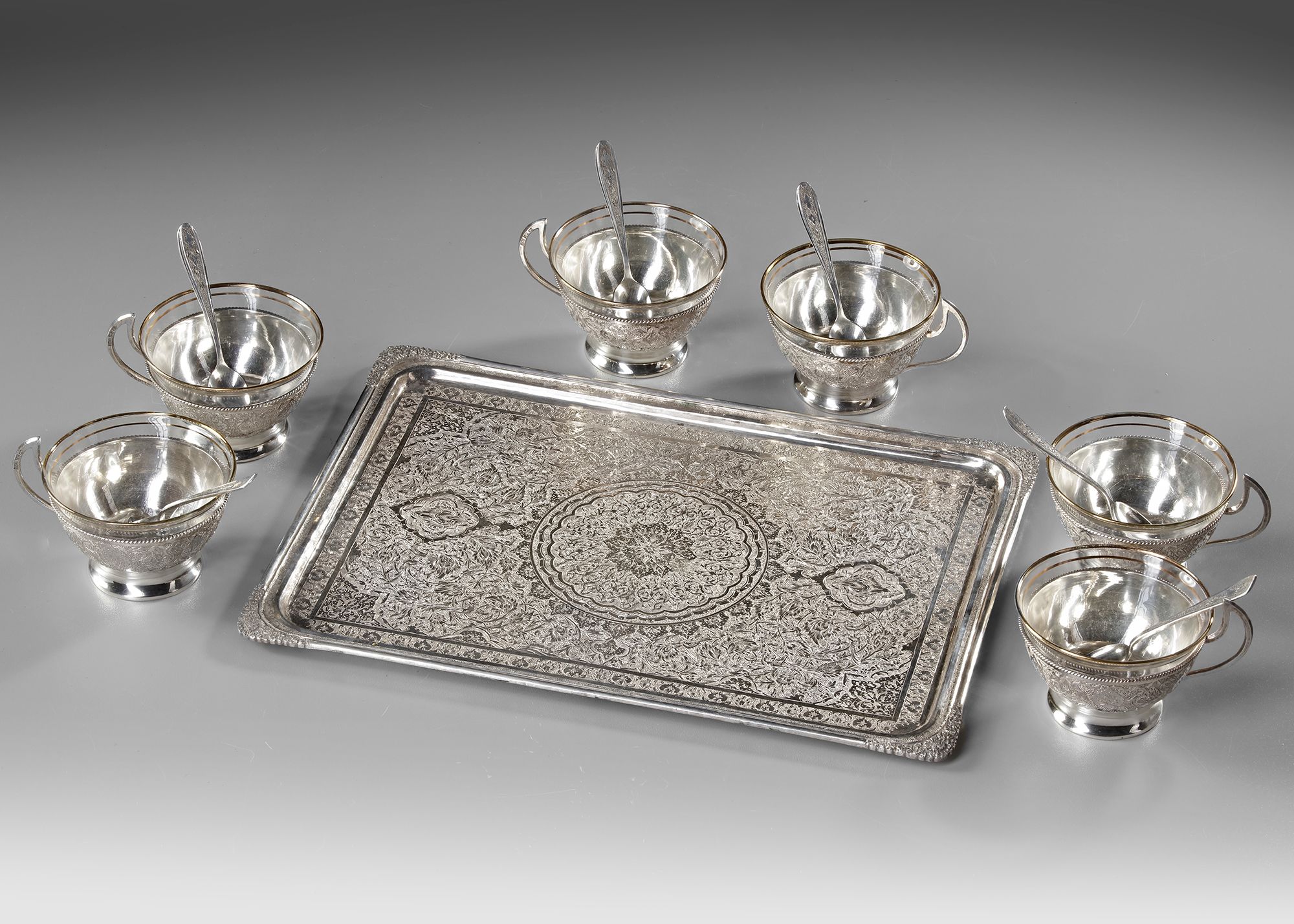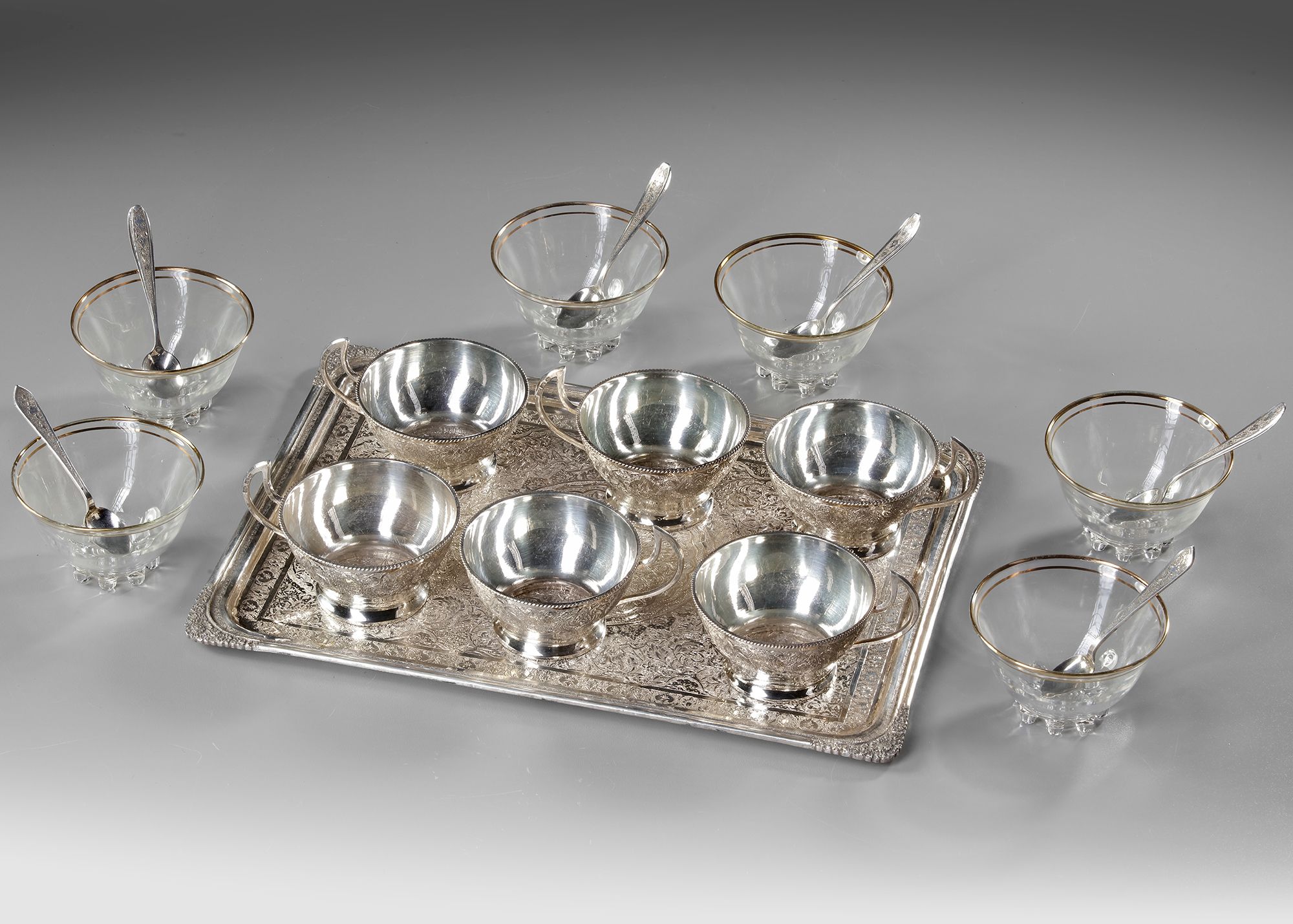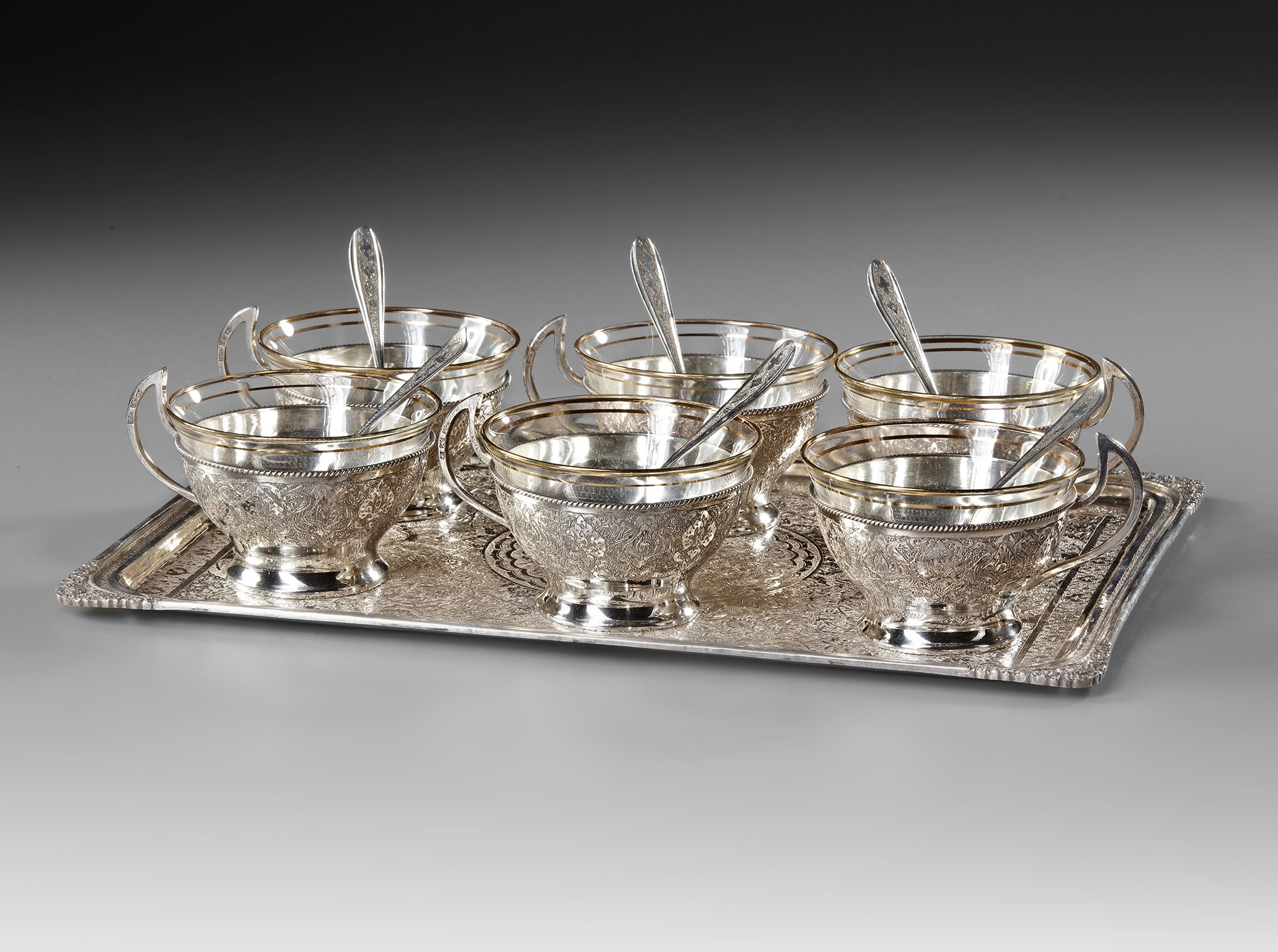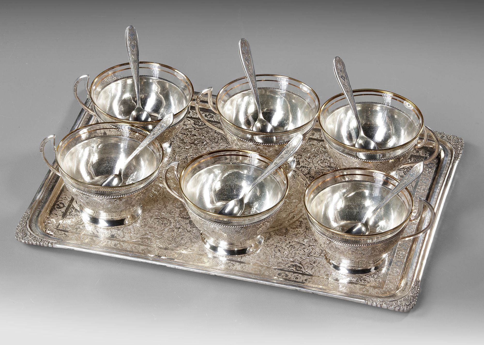 Six cups, six spoons. Netto weight without glass 1320 gr. Tray: 34.5 by 24.5 cm. Diameter cups: 9 cm. Height cups: 6 cm.