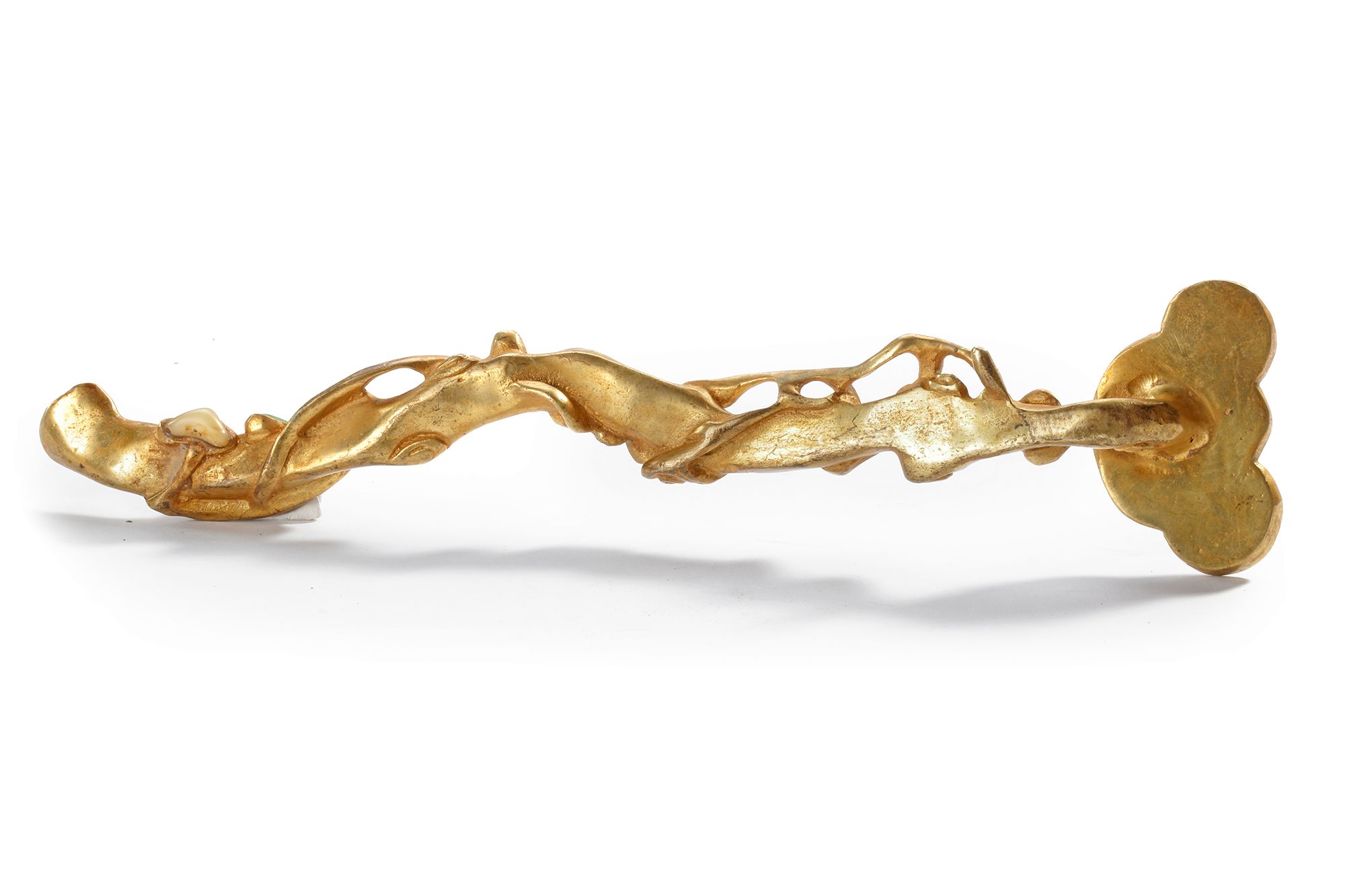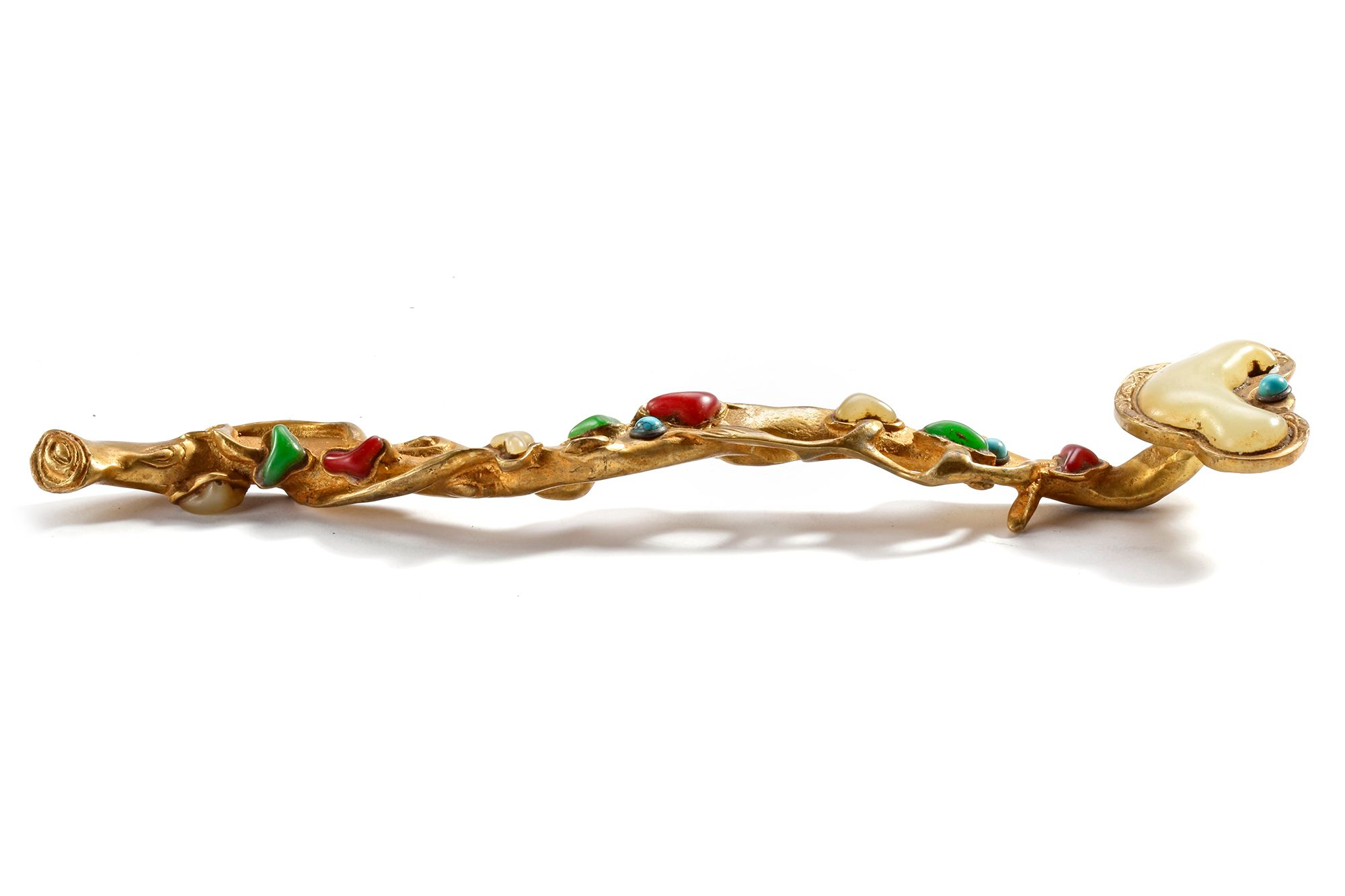 Inlaid Gilt-bronze Ruyi Scepter. Cast in the form of a gnarled ruyi branch entwined with variously colored gem-set stones. Length 26.5 cm.