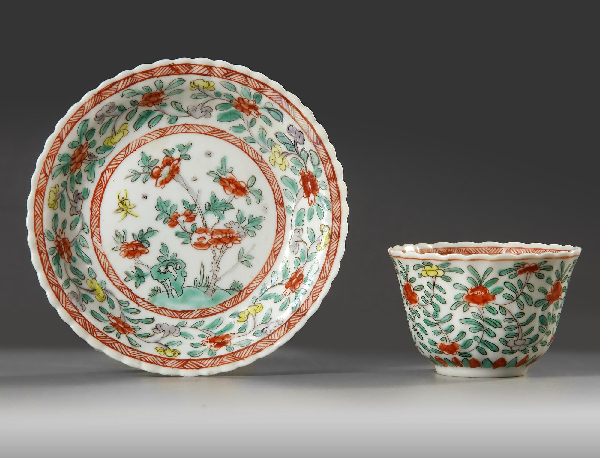 The piece cup is decorated with scrolling flowers above a lappet band, the interior is decorated with a flower spray. The saucer is decorated with a central roundel enclosing flowers, rocks and a bee in flight, all surrounded by a band of further scrolling flowers. The bases with a yu (jade) mark in underglaze blue. 12.8 cm. diam.