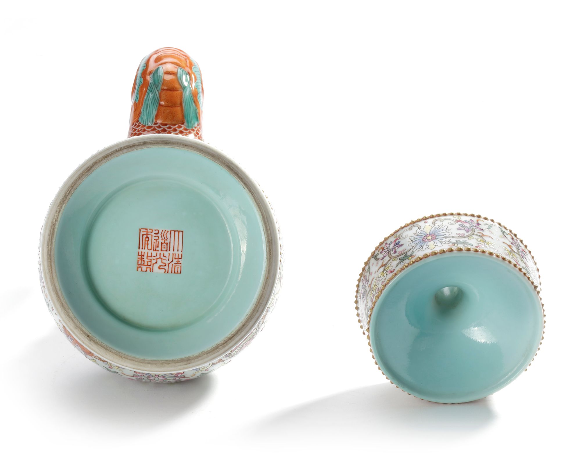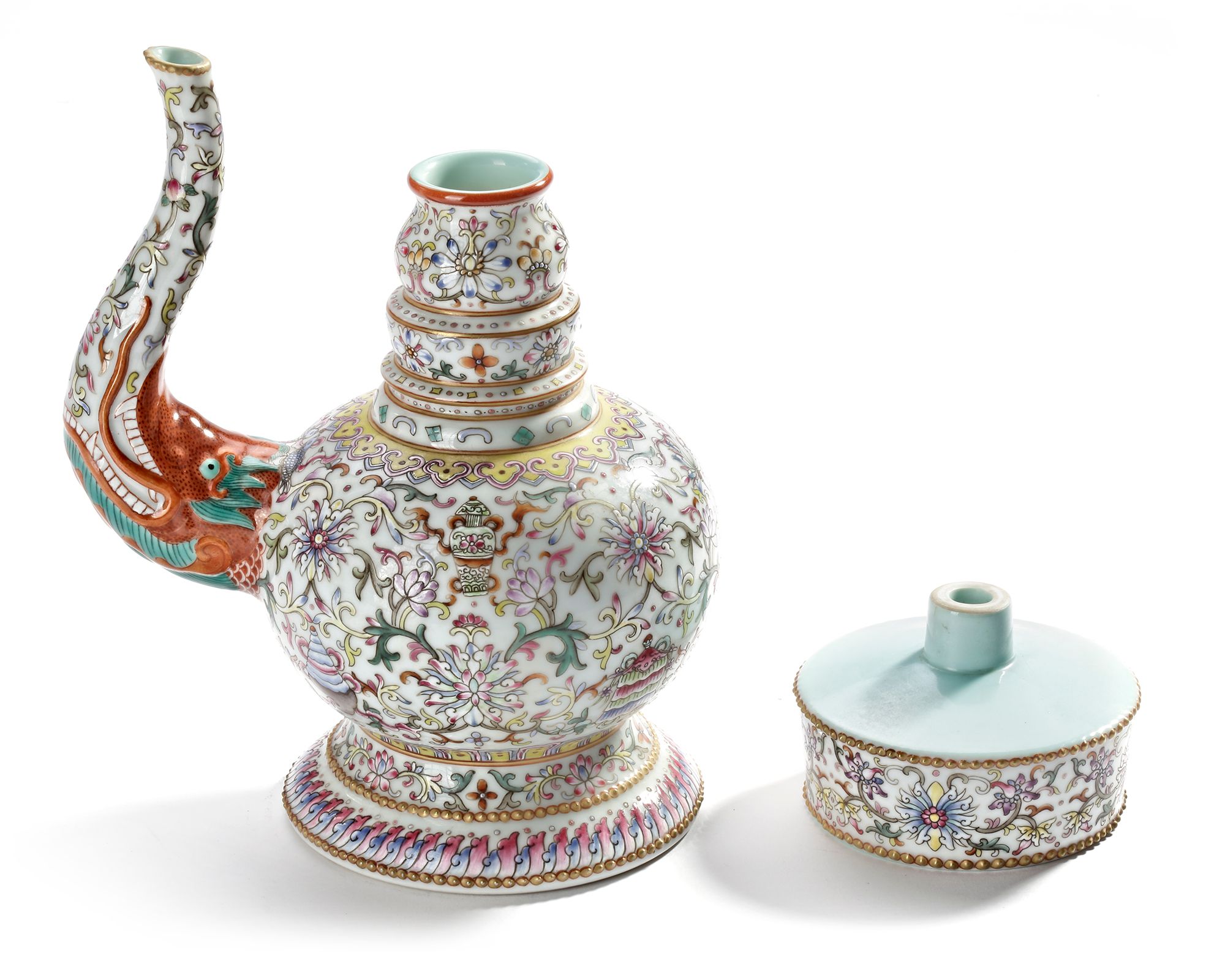 A Chinese porcelain teapot, the globular body rising from a high spreading foot ring, surmounted by an elaborately knopped neck below a thick disc-shaped mouth curving inwards towards a narrow opening, the applied s-shaped spout issuing from the gaping jaws of a moulded makara head, all painted with the bajixiang (Eight Buddhist Emblems) in famille rose, interspersed by leafy lotus flowers and scrolling and intertwining tendrils, framed by lotus lappets, ruyi-head motifs and segmented flower head motifs, the interior of the mouth and the base turquoise enamelled, stopping to reveal a Chinese iron-red Daoguang seal mark.