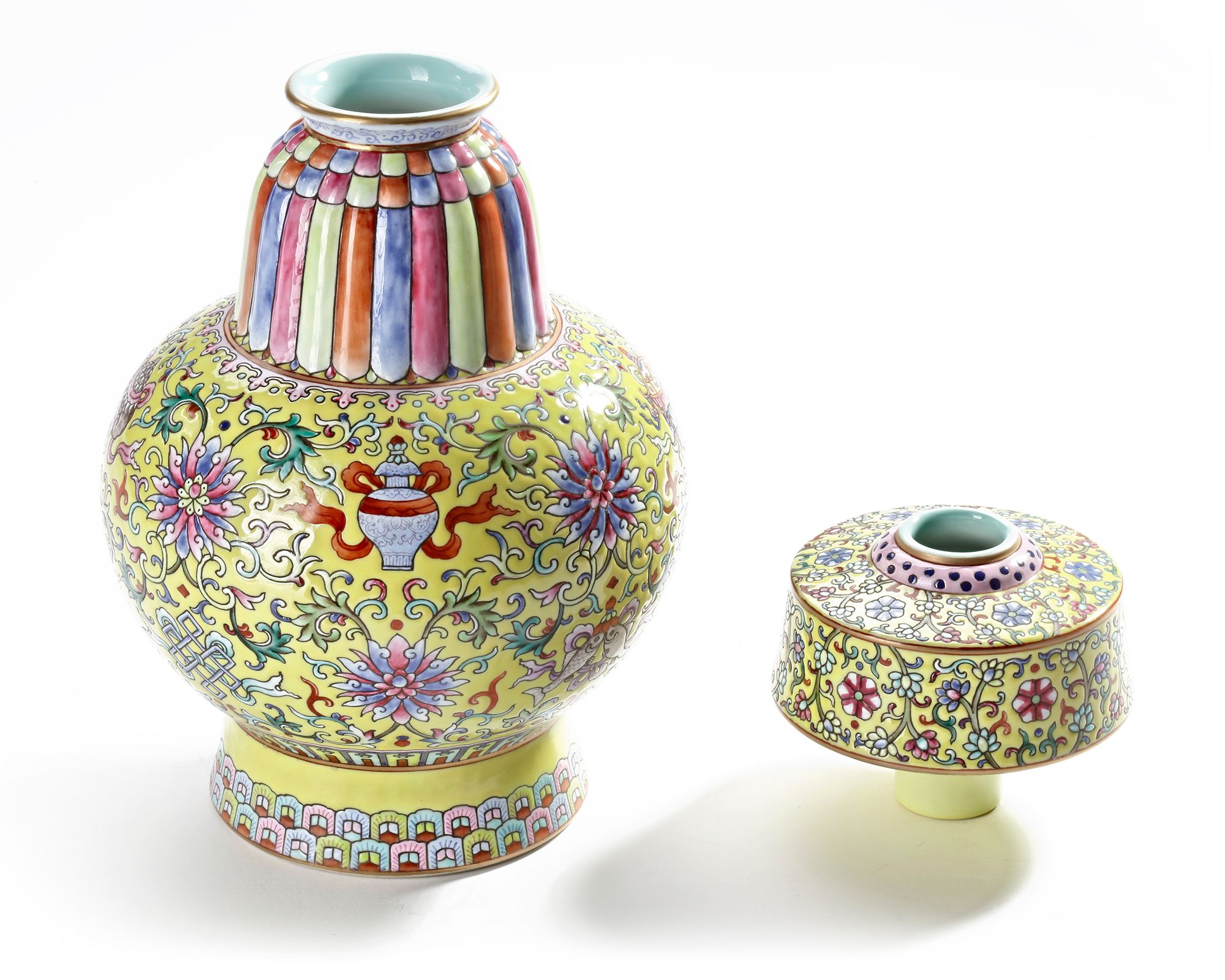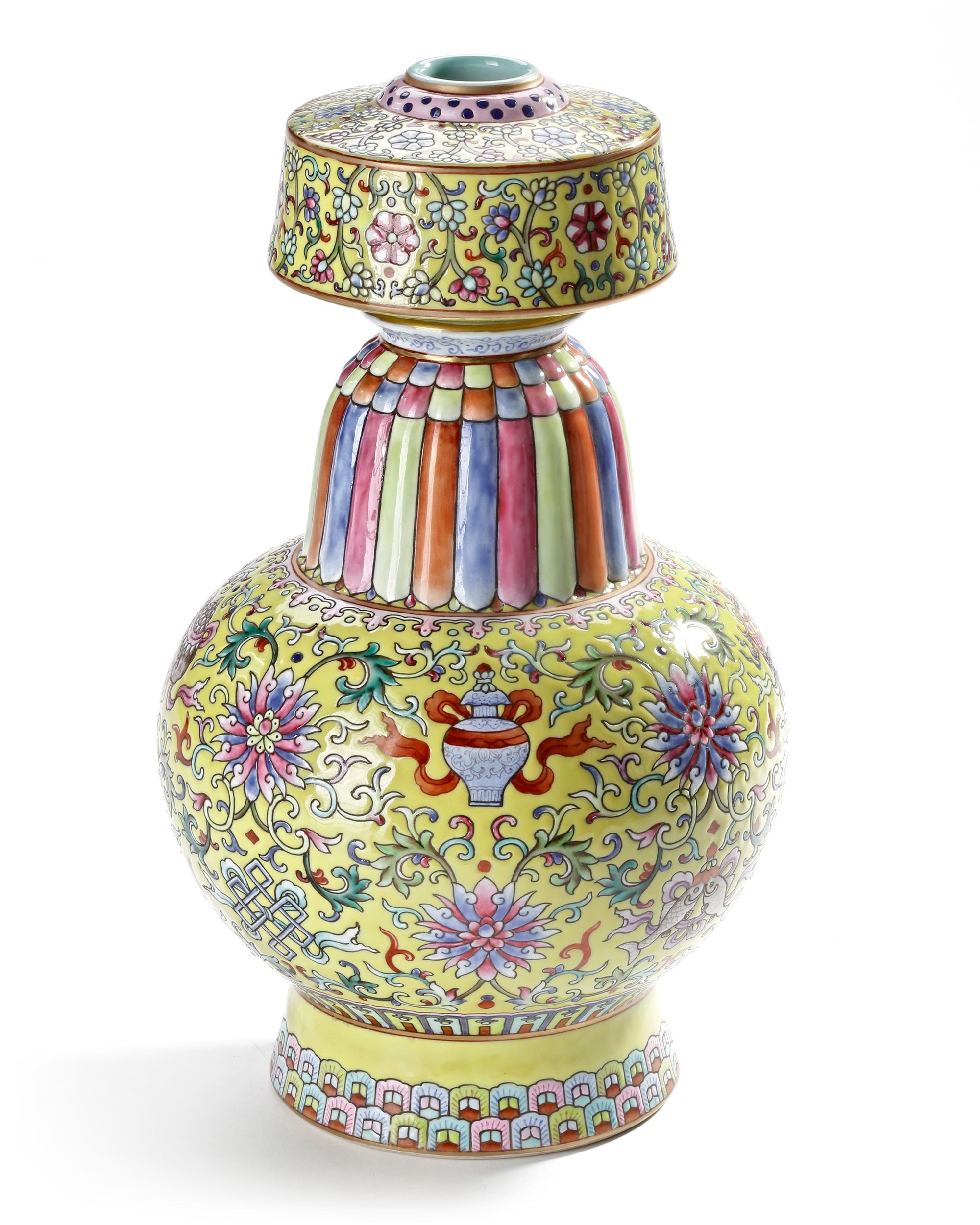 The body is of slightly compressed spherical shape, surmounted by a fluted domed neck and drum-shaped top, brightly enamelled with the Eight Buddhist Emblems, bajixiang, alternating with stylised lotus blooms on a lemon-yellow ground. The colourful decoration to the neck imitates a Tibetan banner, below the top with florets enclosed by flower scrolls. The base, enamelled in turquoise, bears a Chinese Qianlong seal mark.