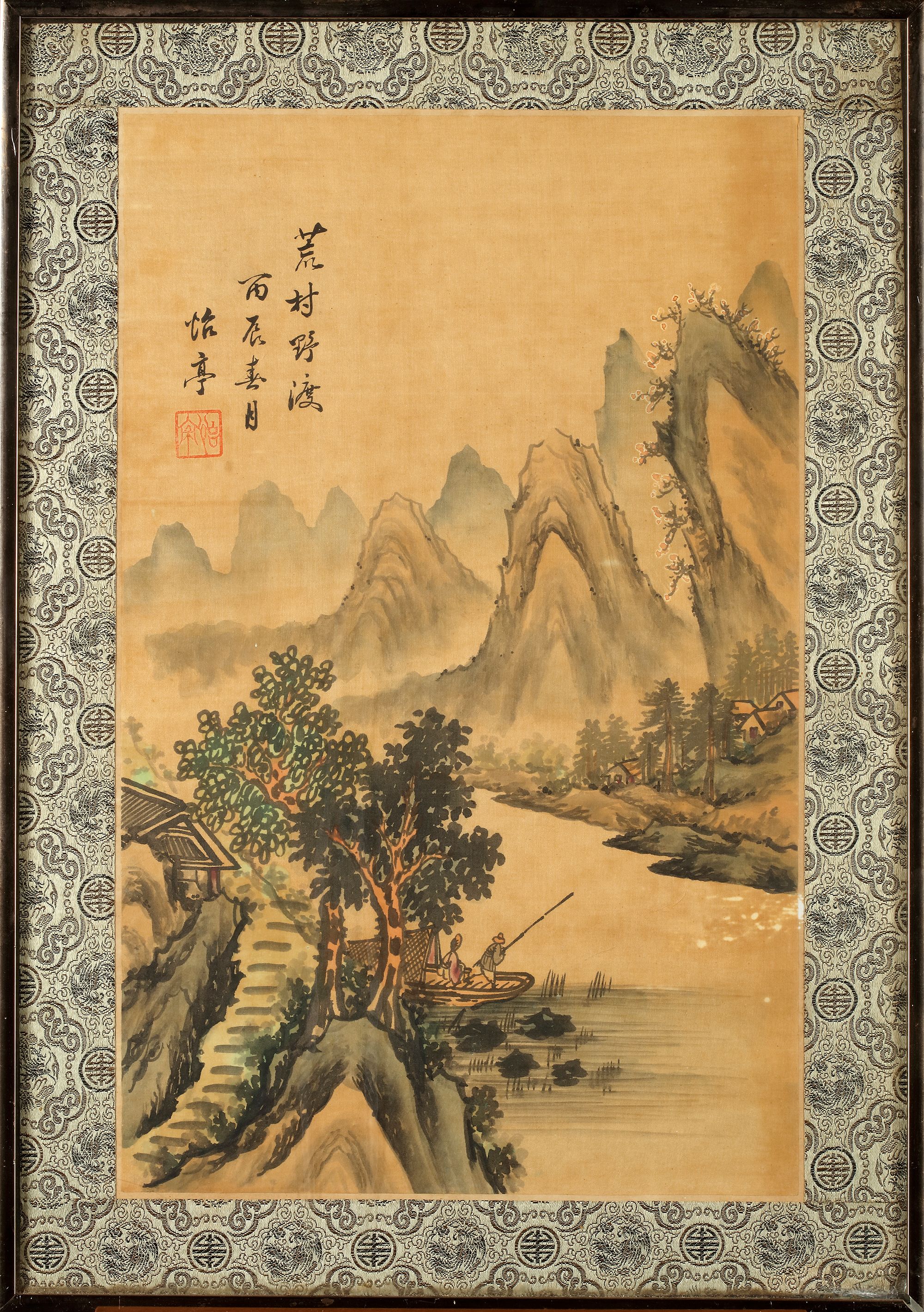 Traditional Chinese ink and watercolor painting on silk, depicting fishermen in a boat beneath towering mountains and riverside homes. Framed with ornate silk brocade border.