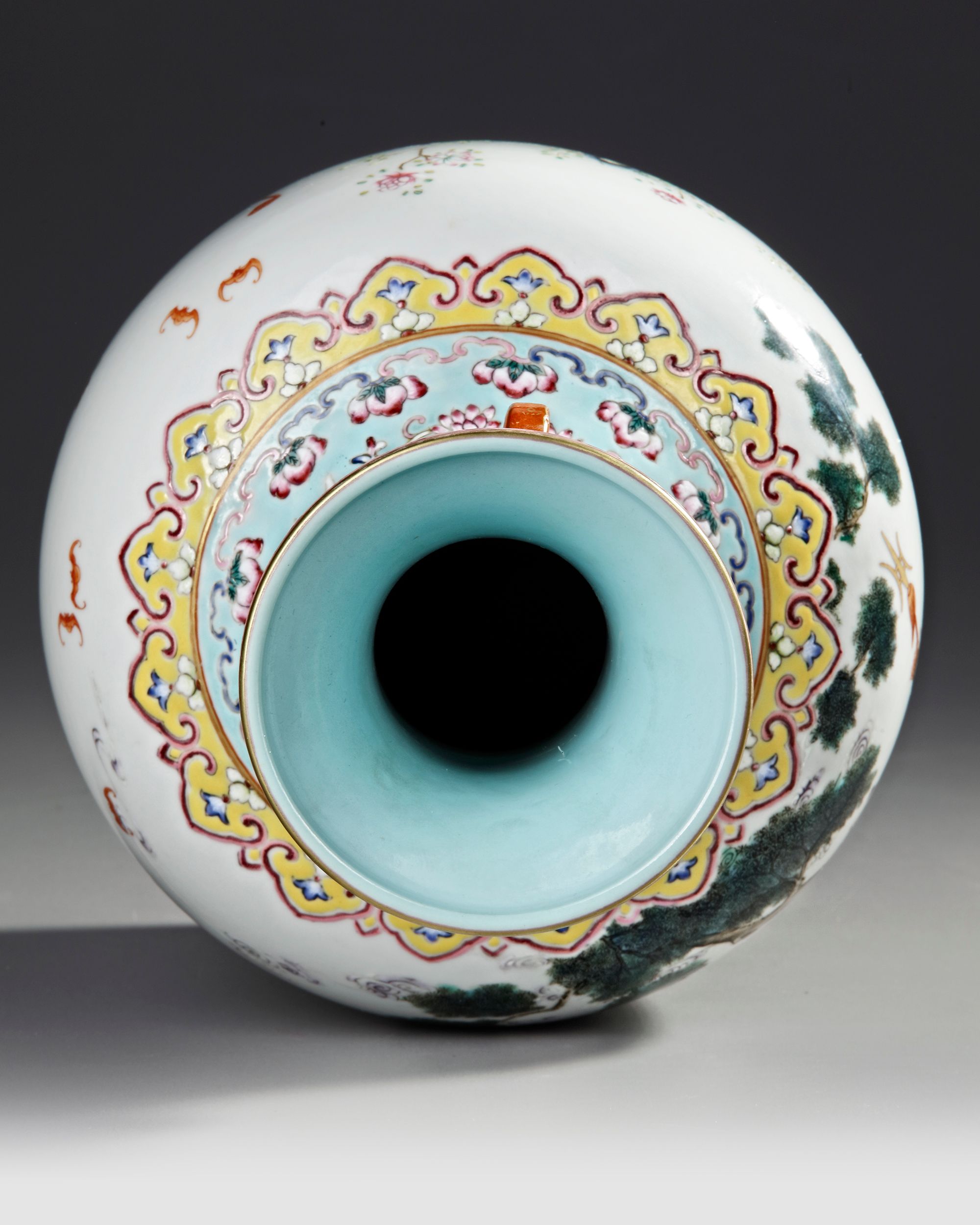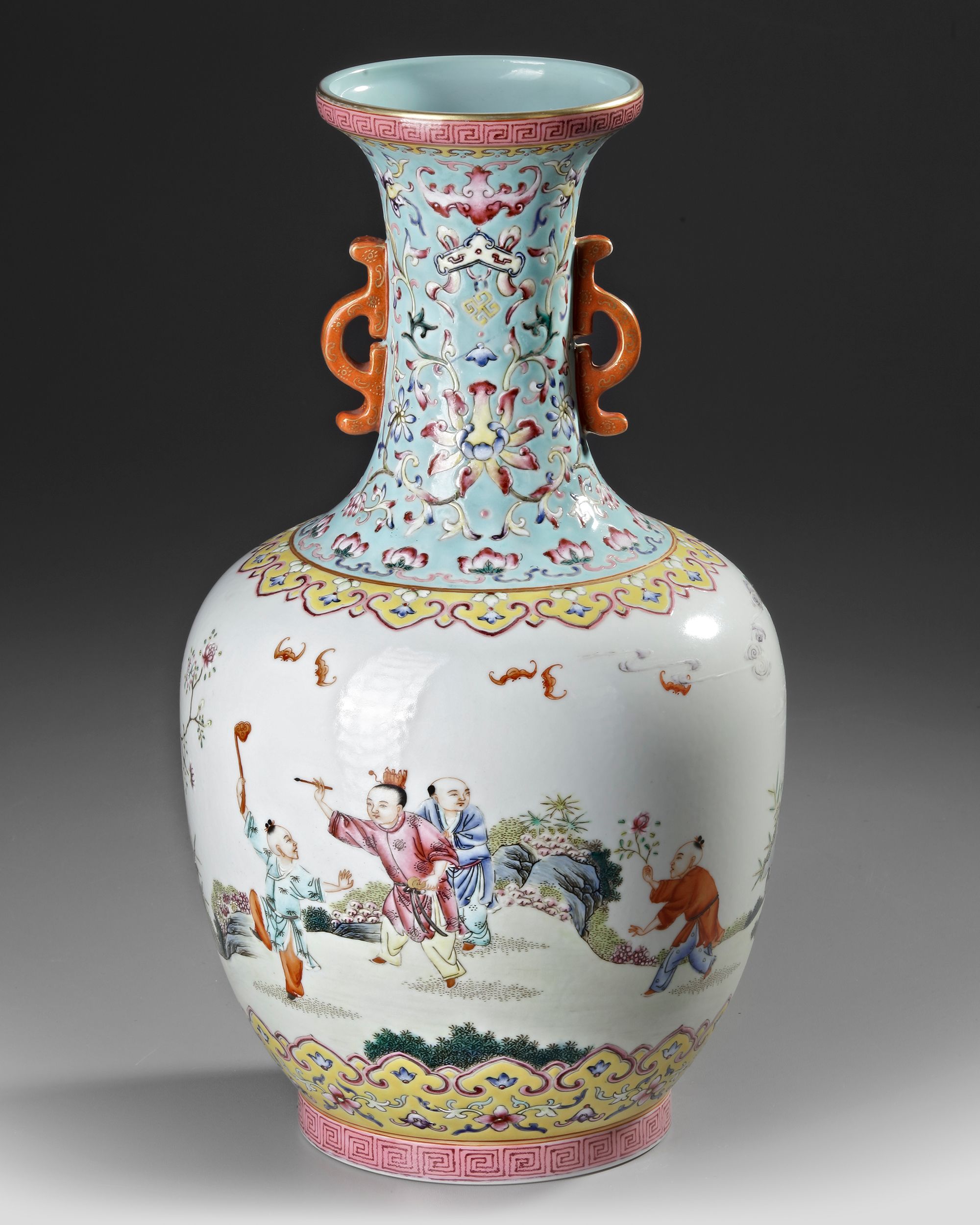 A Chinese porcelain famille rose bottle vase, stylized with coral-red handles. The baluster-shaped body is decorated in famille rose enamels with children at play in a fenced garden under a pine tree, set between two bands of ruyi heads enclosing floral scrolls on a yellow ground, above a key-fret band at the base. The neck is narrow and flares at the top, decorated with a frieze of leaves topped with foliated scrolls embellished with emblems, lotus flowers, and Fu bats in polychrome enamels on a turquoise background. The base bears a Chinese Jiaqing seal mark on a turquoise-glazed ground. Height: 32 cm