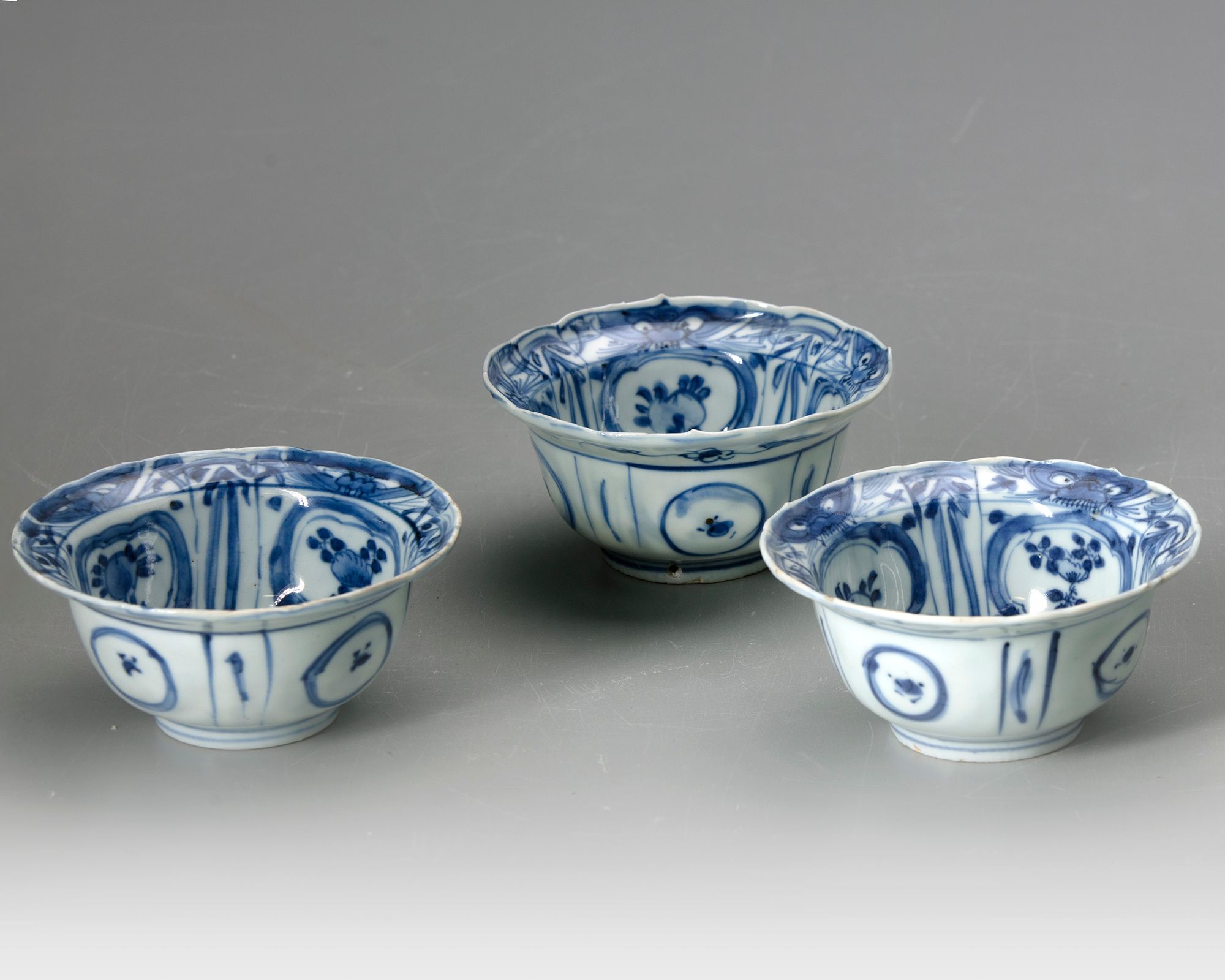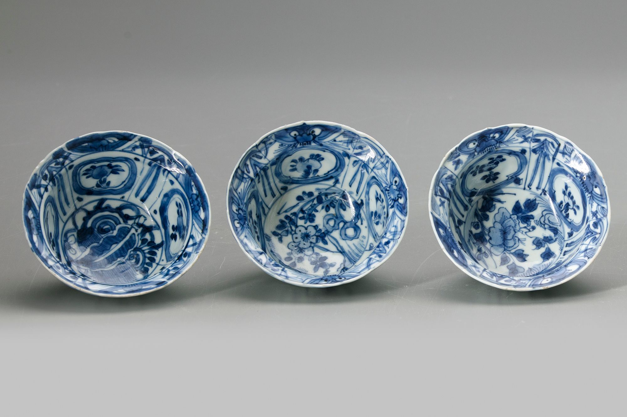 Each with small foot and slightly everted rim, decorated with panels enclosing flowers growing from ornamental rocks. Diameter 10 cm. Height 5 cm.