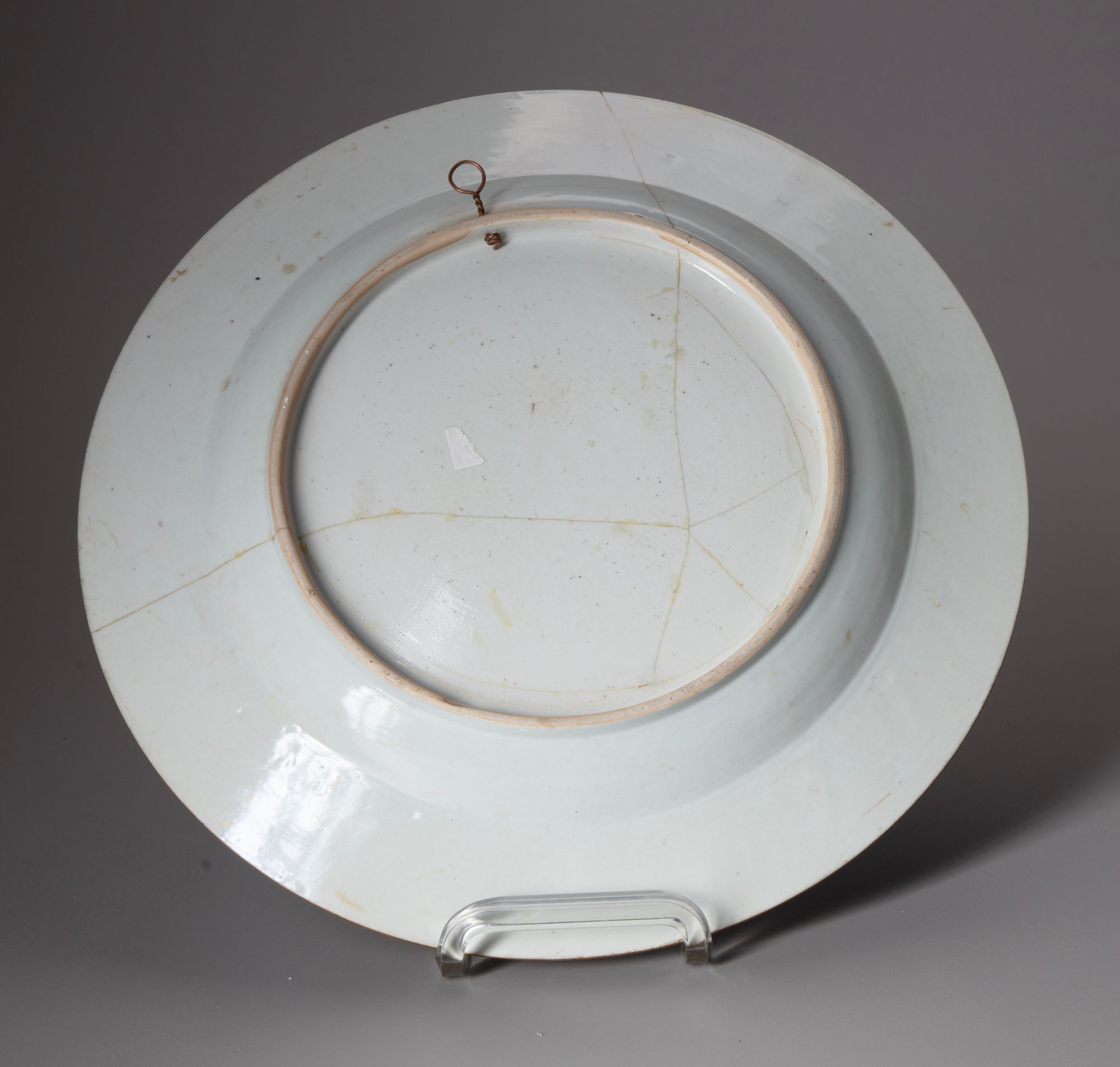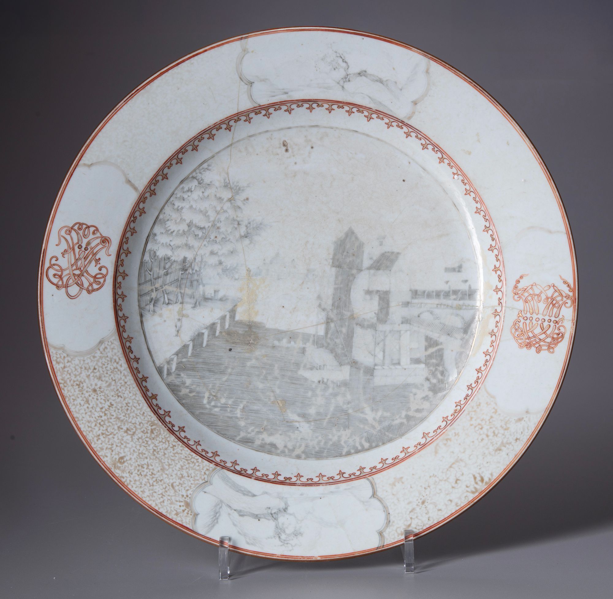 Decorated in grisaille depicting a water mill along a canal on the foreground and a river with a large building or church in the background, possibly a scene of Batavia.