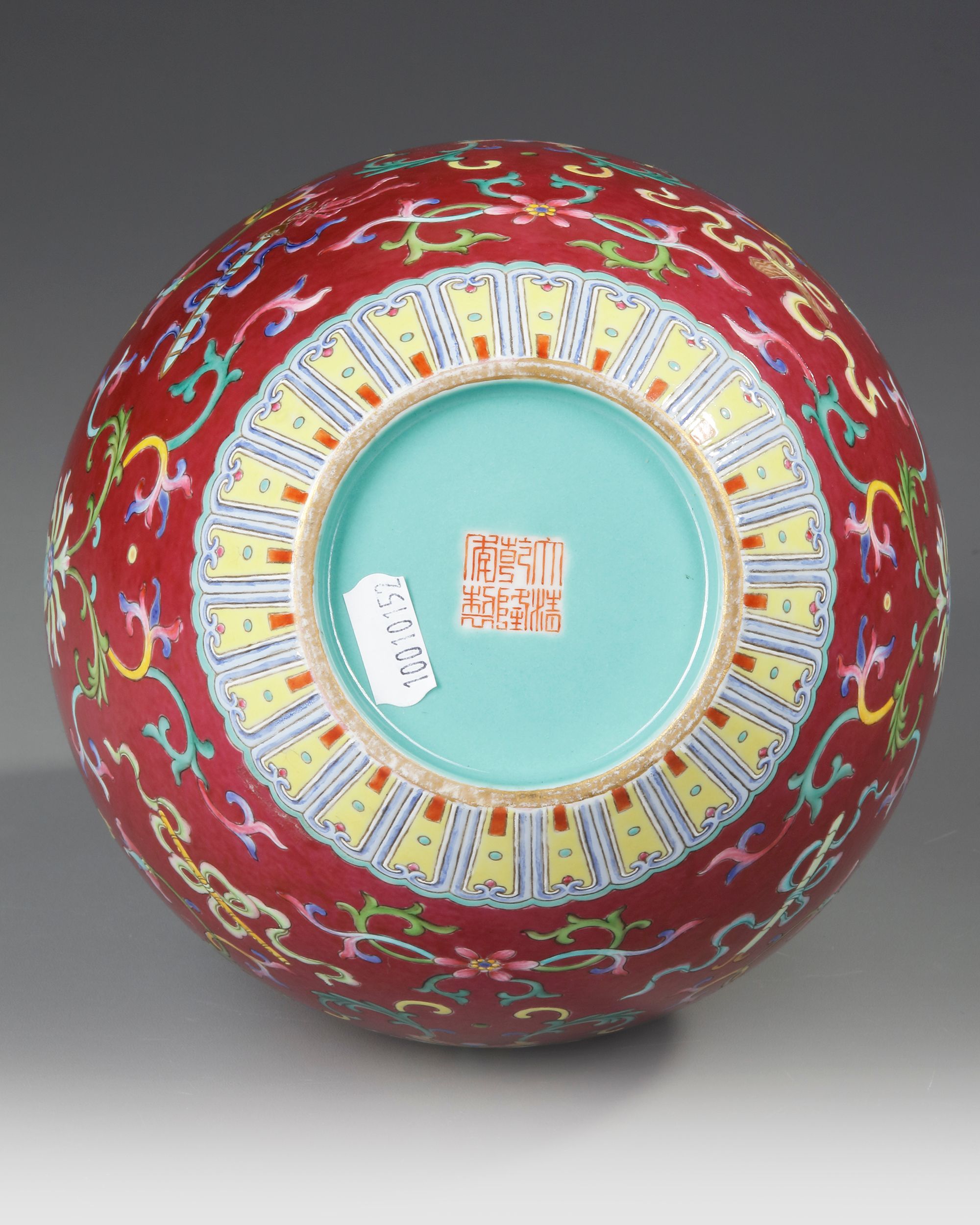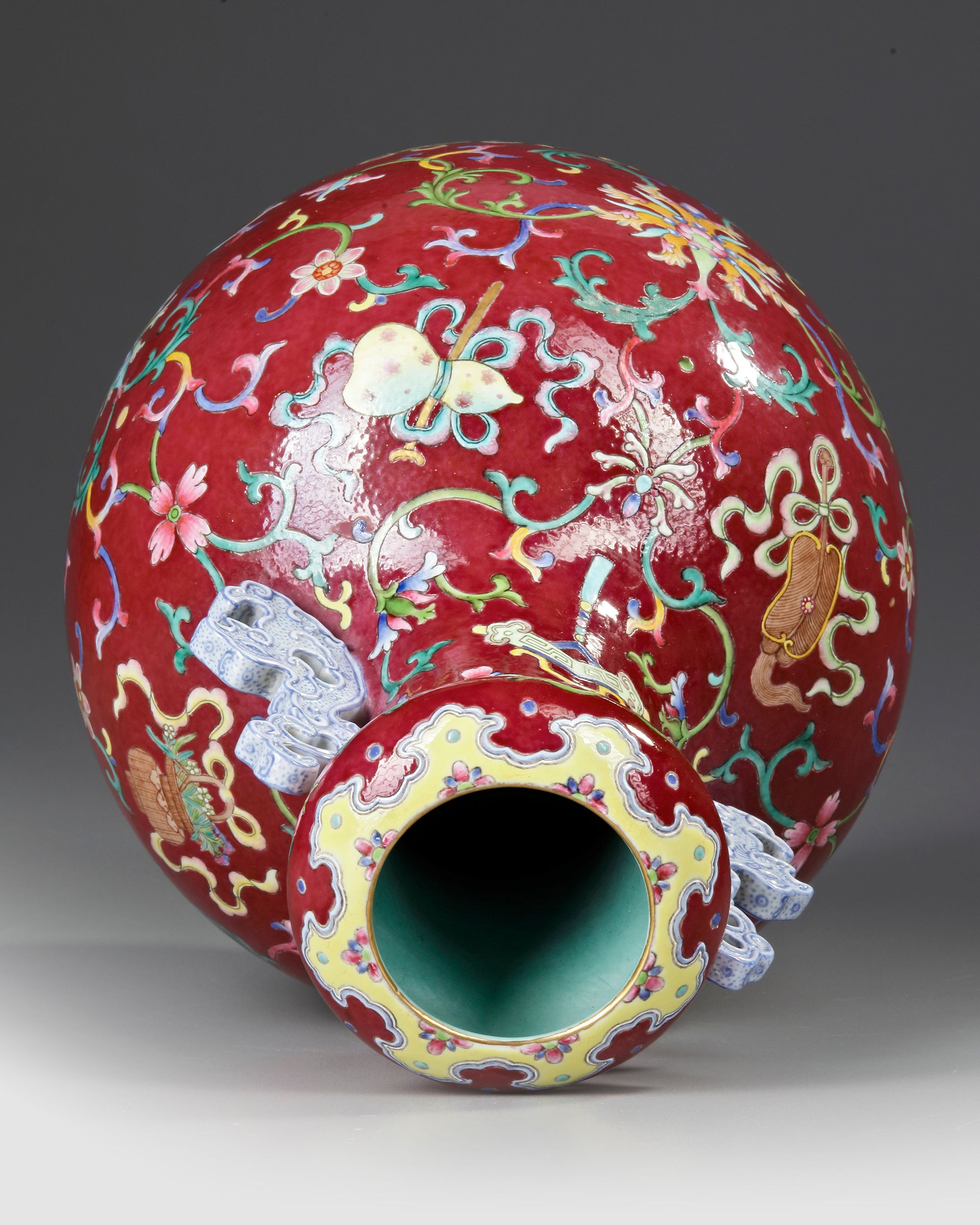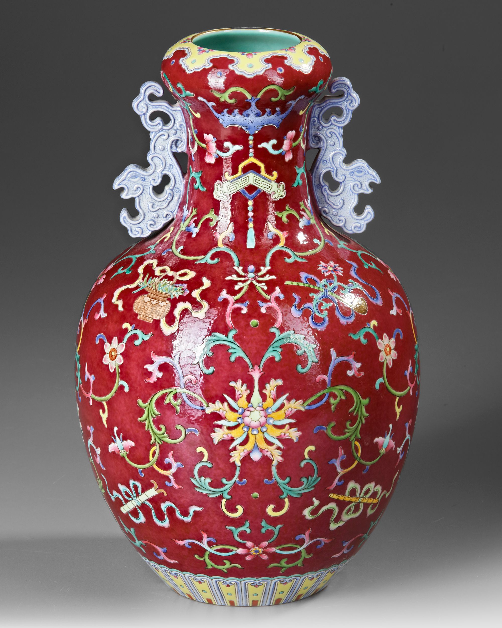 A Chinese porcelain vase, the broad-shouldered baluster body rising to a waisted neck, flanked by stylized phoenix-shaped handles glazed in pale blue. The exterior is brightly enameled with large lotus blossoms borne on leafy strapwork stems, interspersed with bajixiang emblems. The rim is adorned with ruyi heads enclosing floral motifs, above a plantain-lappet border at the base, all reserved against a rich ruby-red ground. The base is covered in turquoise glaze and inscribed in iron red with a six-character Qianlong mark.