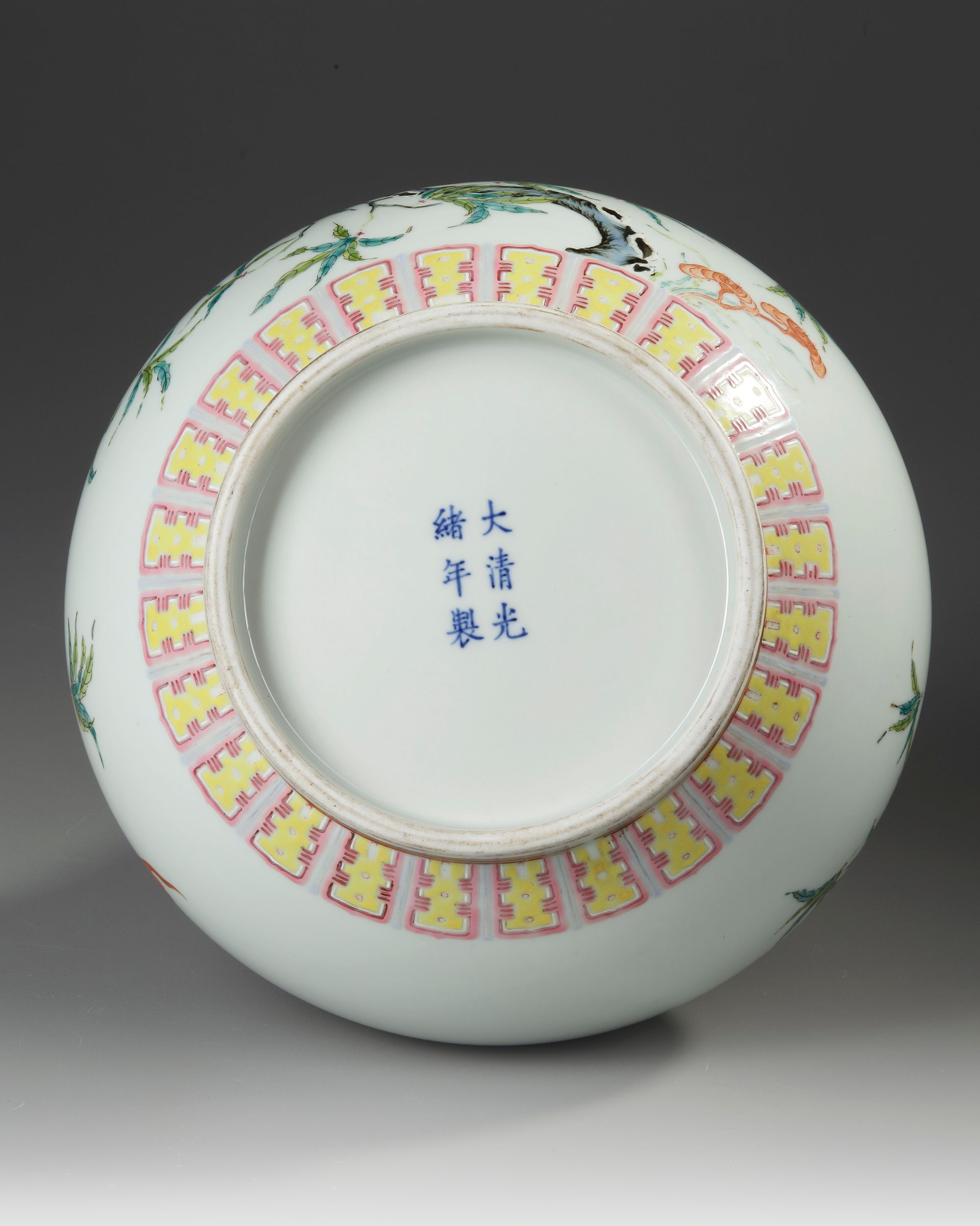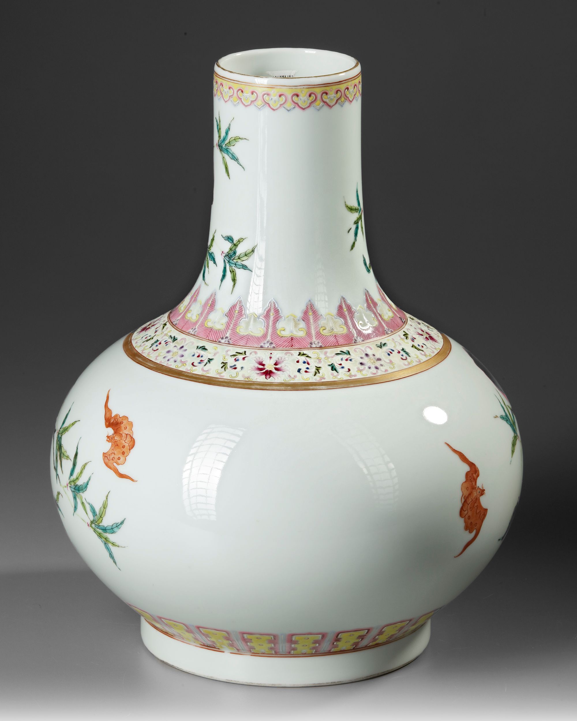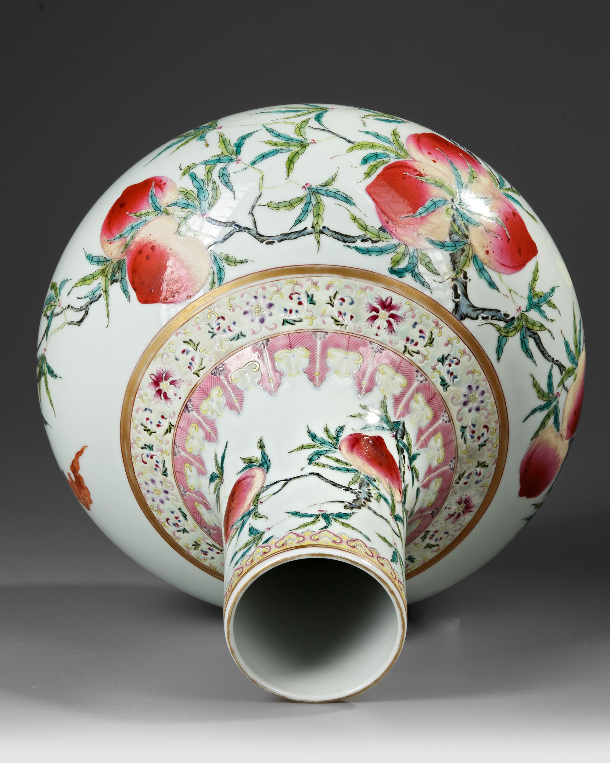 A Chinese porcelain bottle vase, decorated in famille rose enamels with nine blossoming peaches and Fu bats, set between a band of ruyi heads at the rim and a petal-lappet border at the base. The neck is encircled by a band of lotus blossoms beneath upright stiff leaves. The base bears a six-character Guangxu mark.