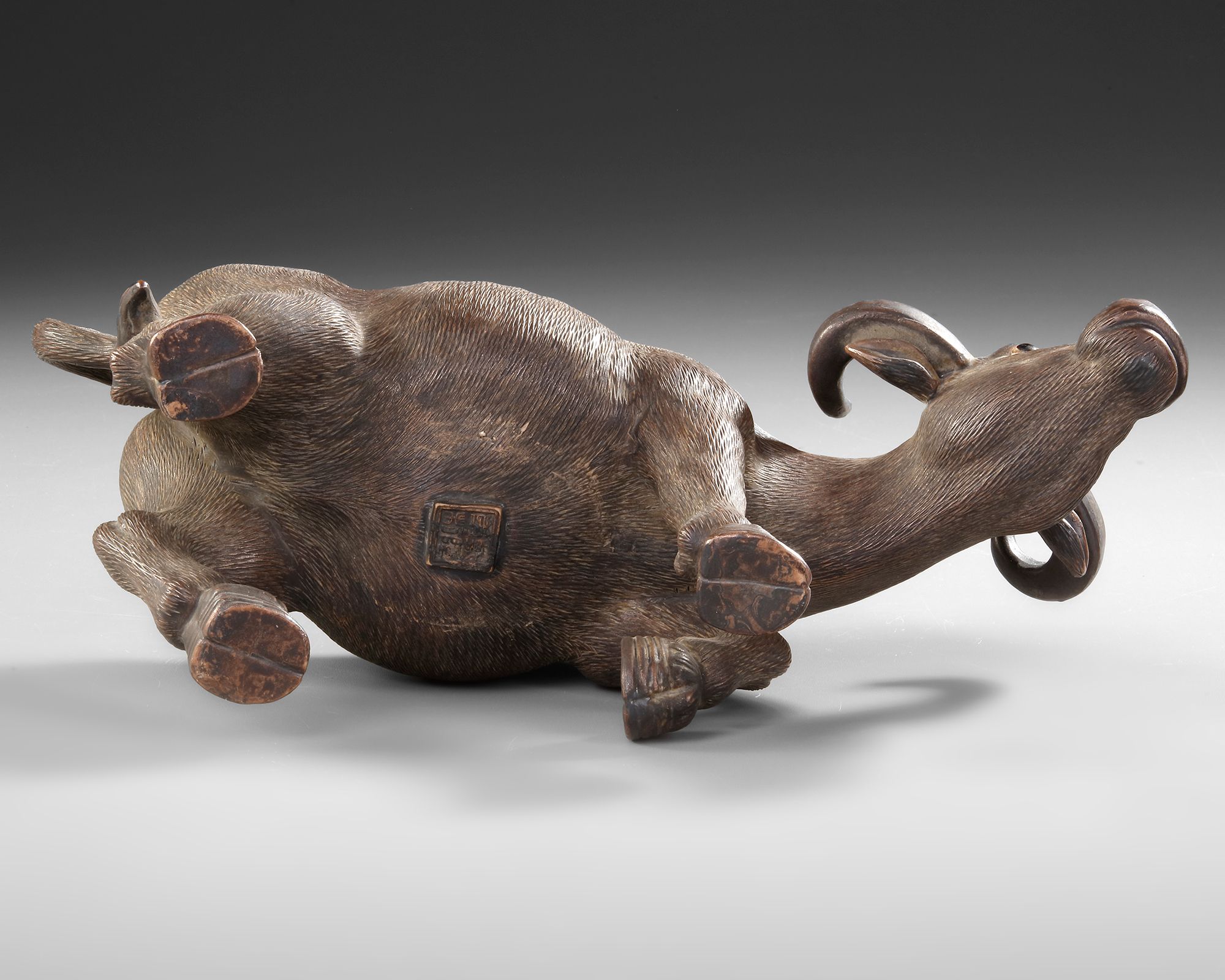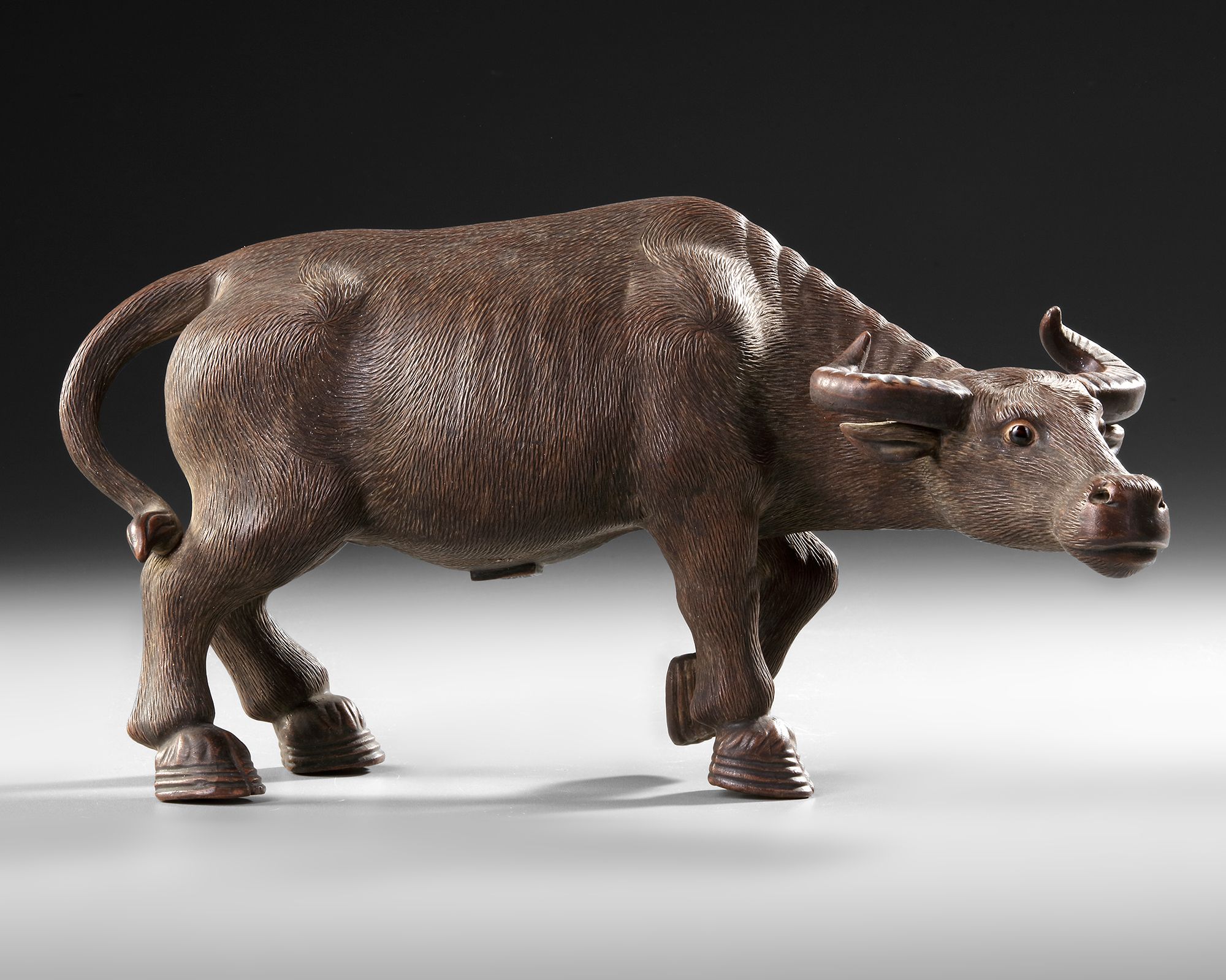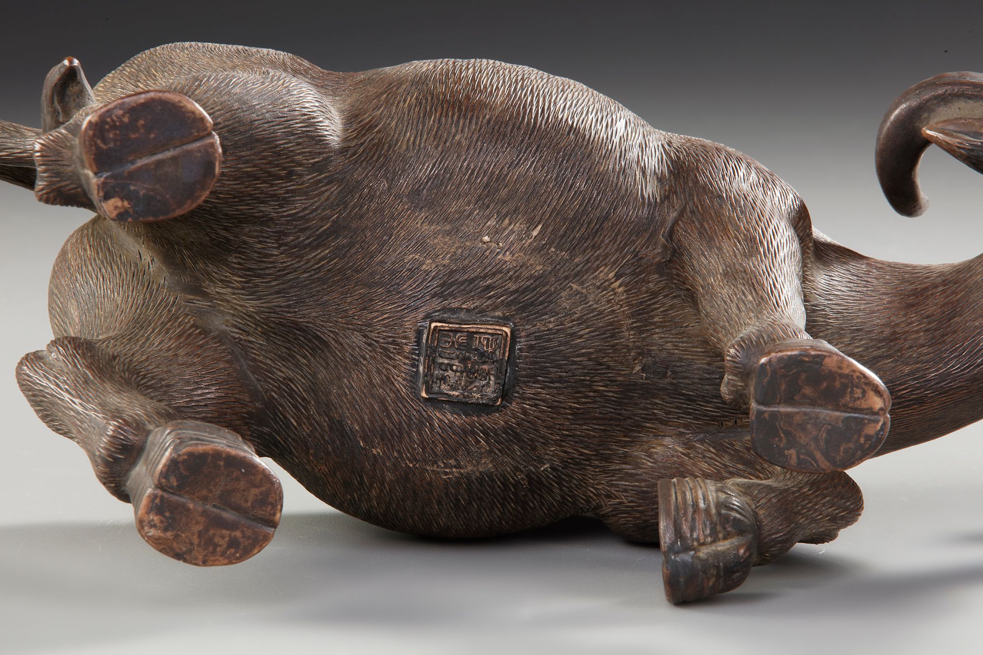 A finely modeled terracotta bull with naturalistic detail, expressive features, and a warm patina, bearing a maker’s seal on the underside.