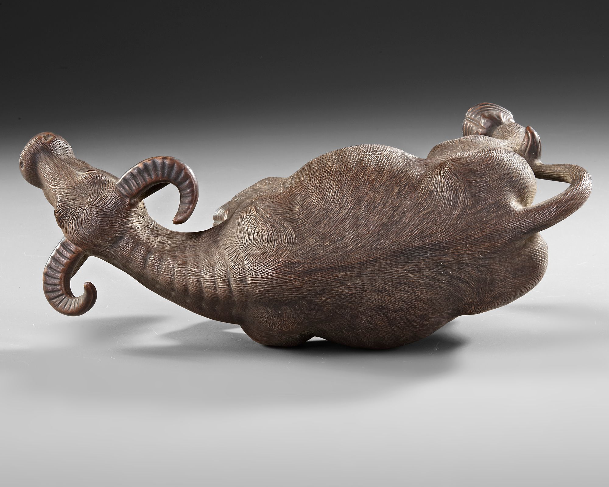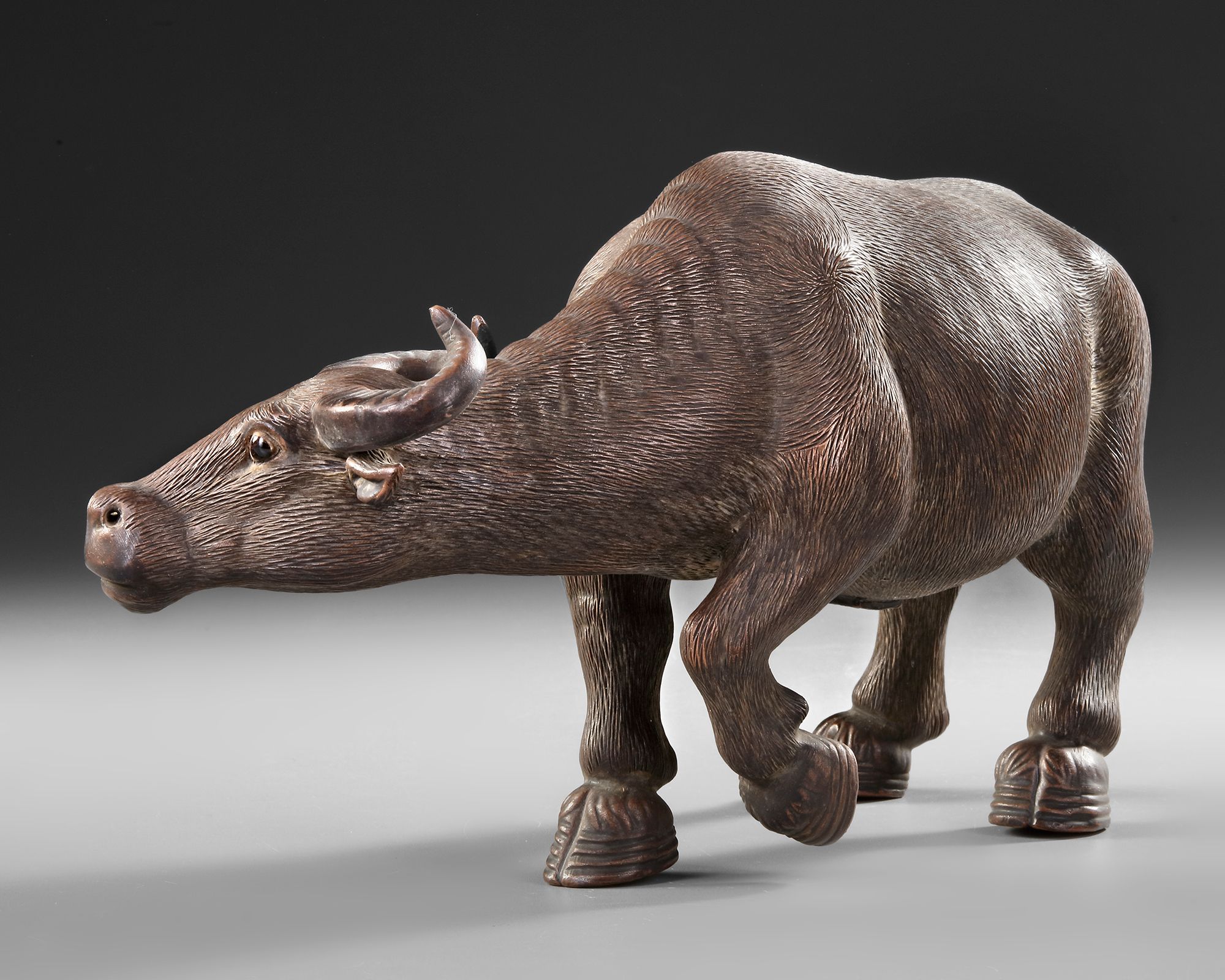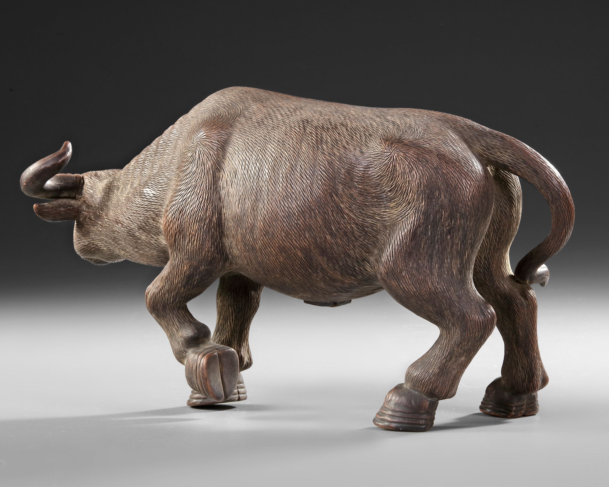 A finely modeled terracotta bull with naturalistic detail, expressive features, and a warm patina, bearing a maker’s seal on the underside.