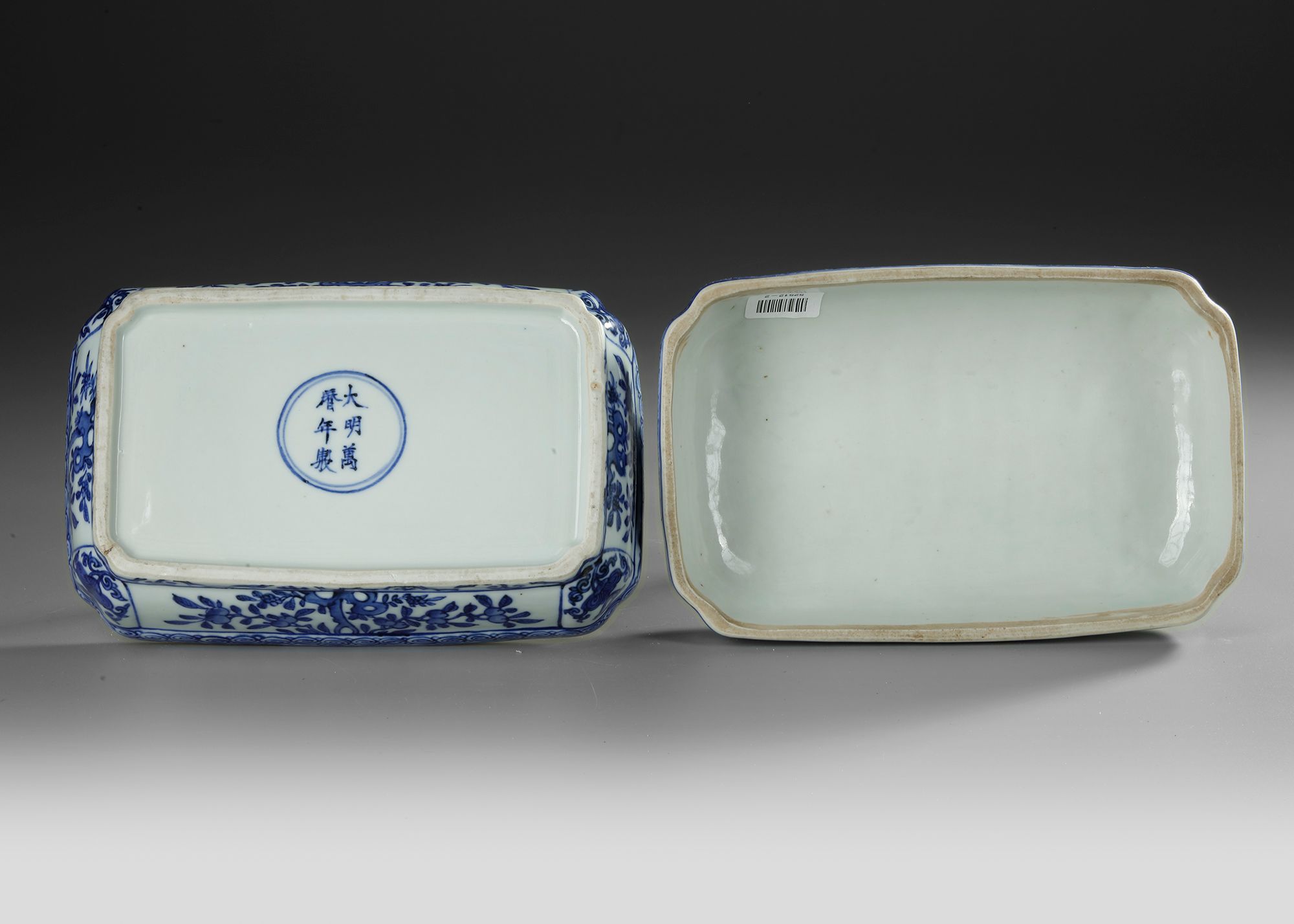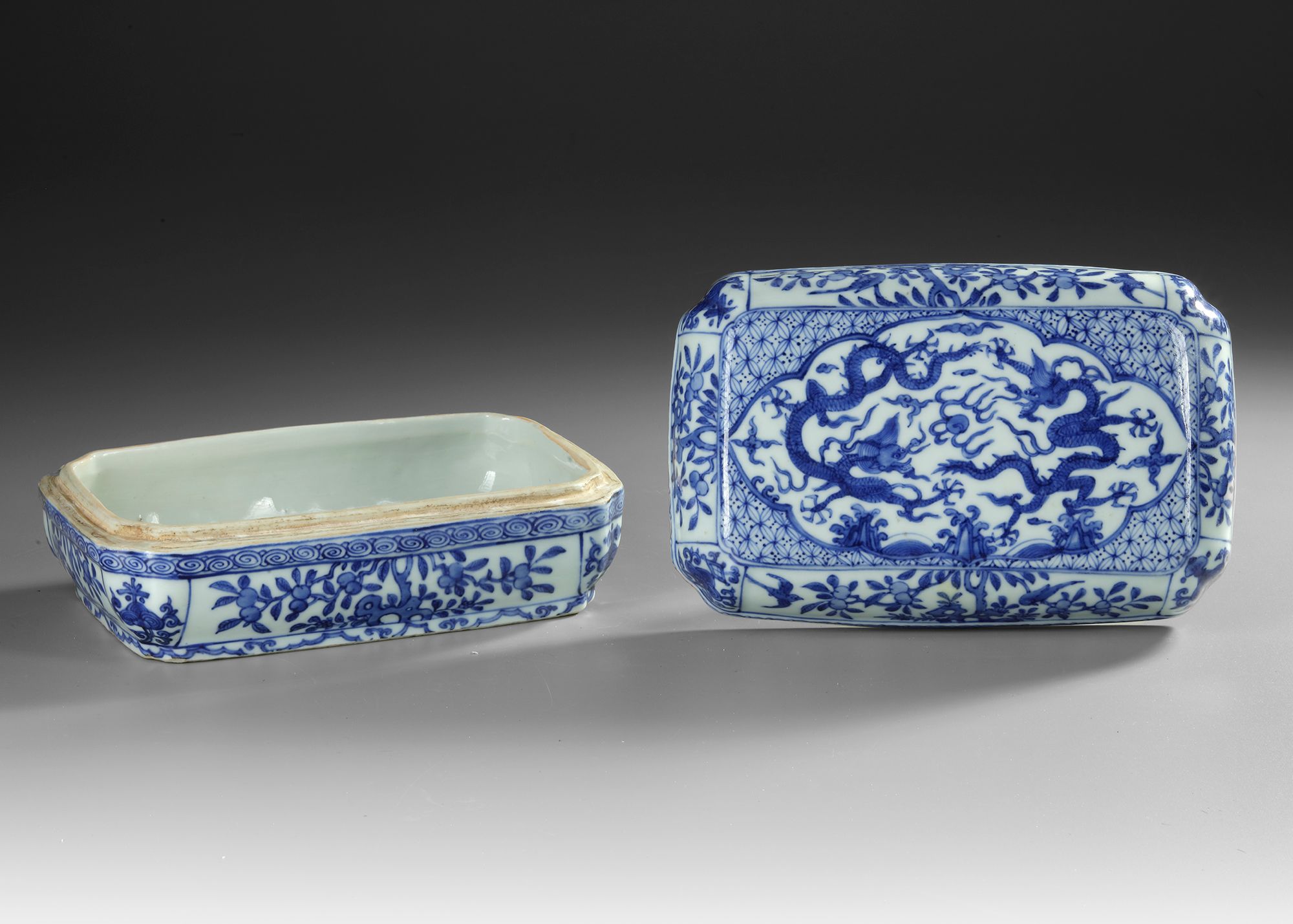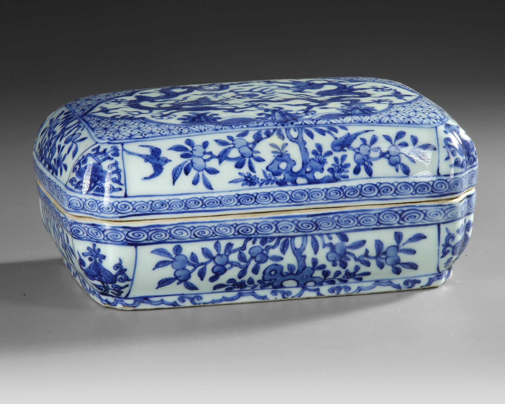 Of rectangular form with canted corners, decorated in vibrant tones of cobalt-blue to the cover with a rectangular panel enclosing two five-clawed dragons in mutual pursuit of a 'flaming pearl' amidst cloud swirls and above rolling waves crashing against rockwork, the rounded sides of the box and cover with stylised birds amidst peony scrolls at the sides, the rims encircled by classic band. The bottom with a Chinese Wanli six character mark.
