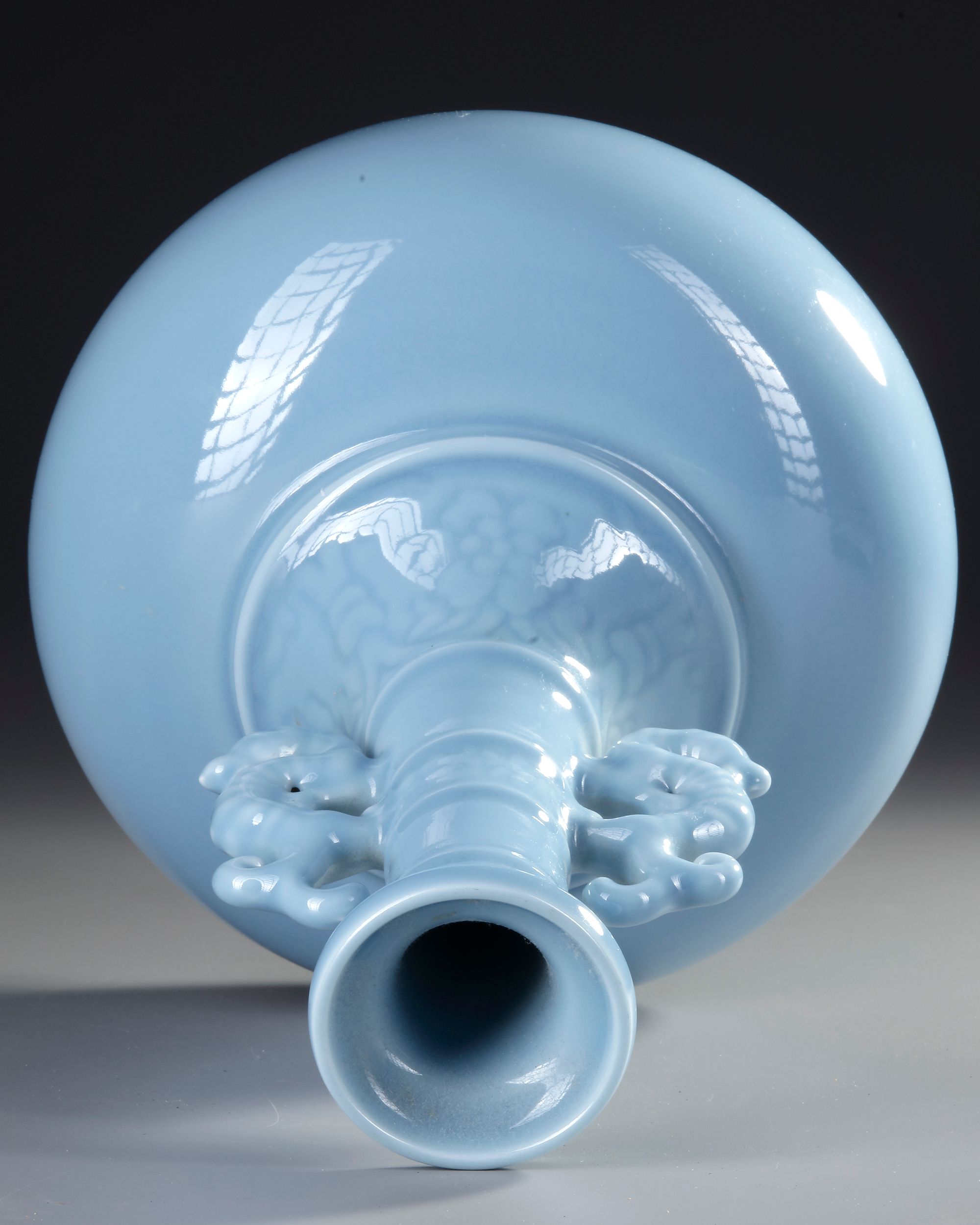 A Chinese porcelain bottle vase, featuring a compressed globular body rising to a bamboo-moulded neck and adorned with chilong-shaped handles. The exterior is covered in a pale blue, semi-translucent glaze. The base bears a Chinese Qianlong seal mark. Height: 32 cm