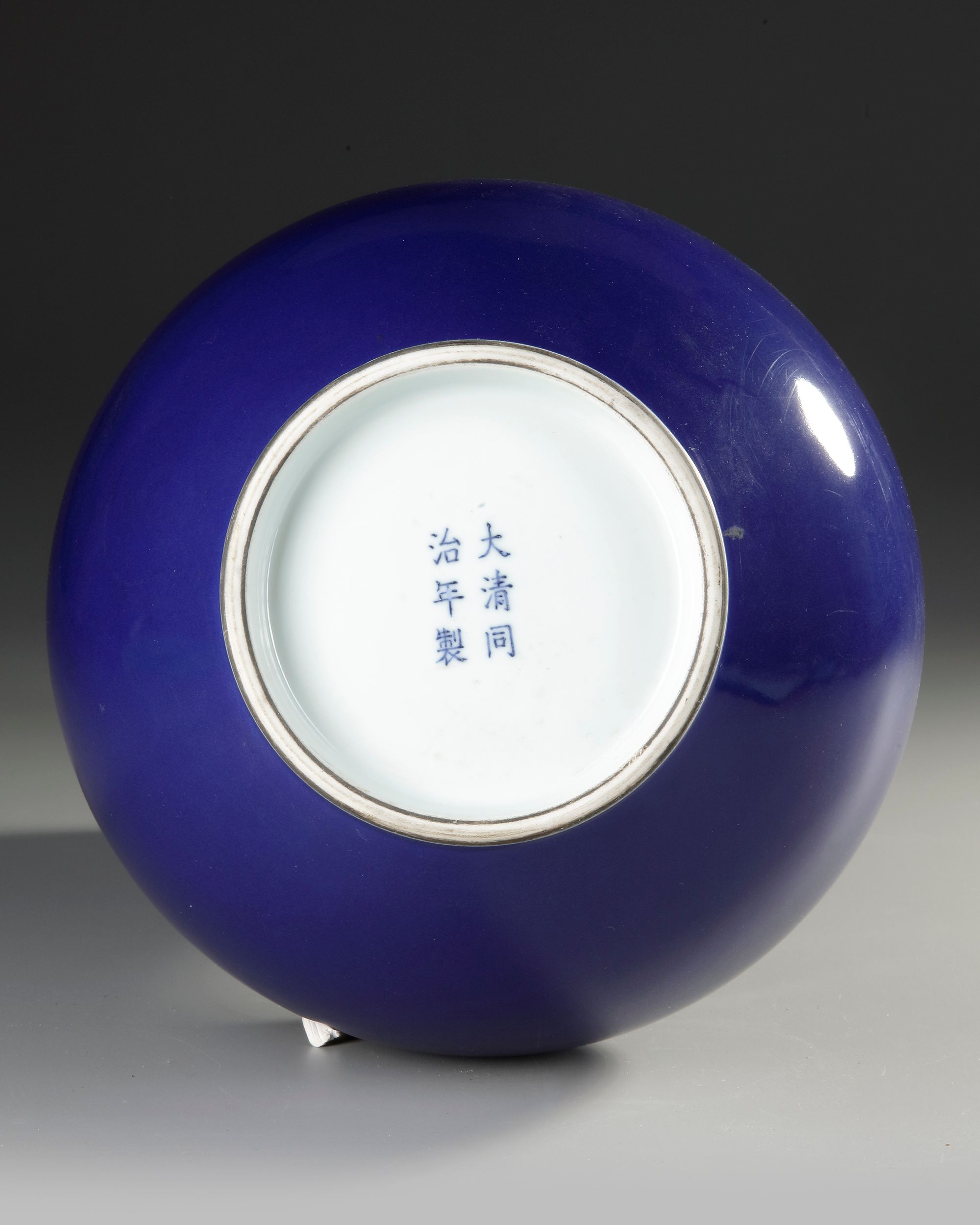 A Chinese porcelain vase of ovoid form, resting on a straight foot and covered in a delicate powder-blue glaze that stops just above the base. The underside bears a Chinese Tongzhi six-character mark