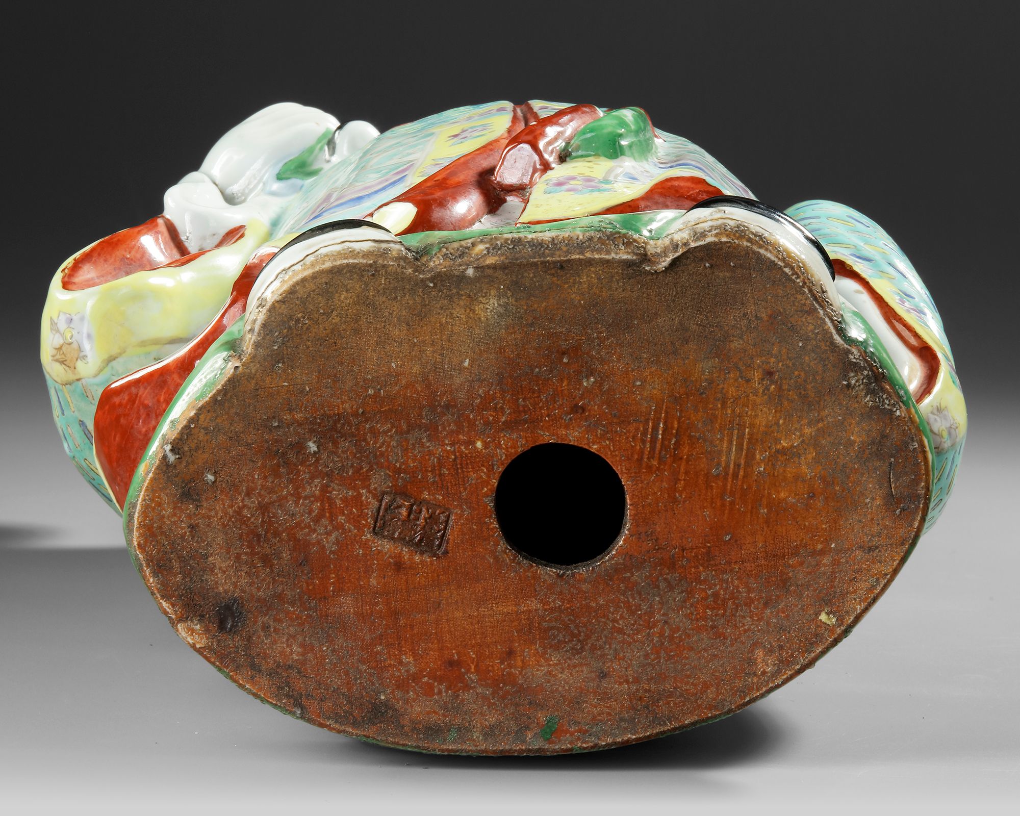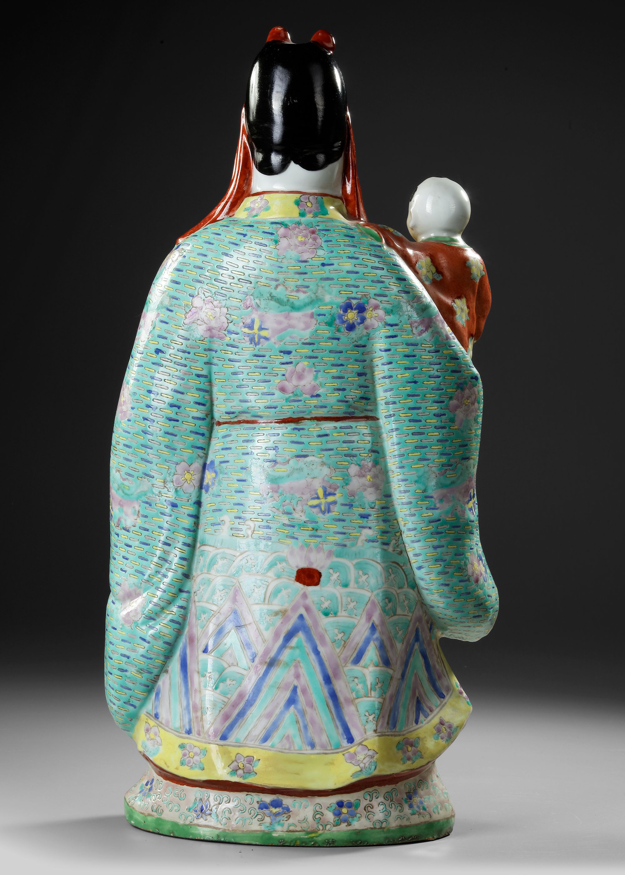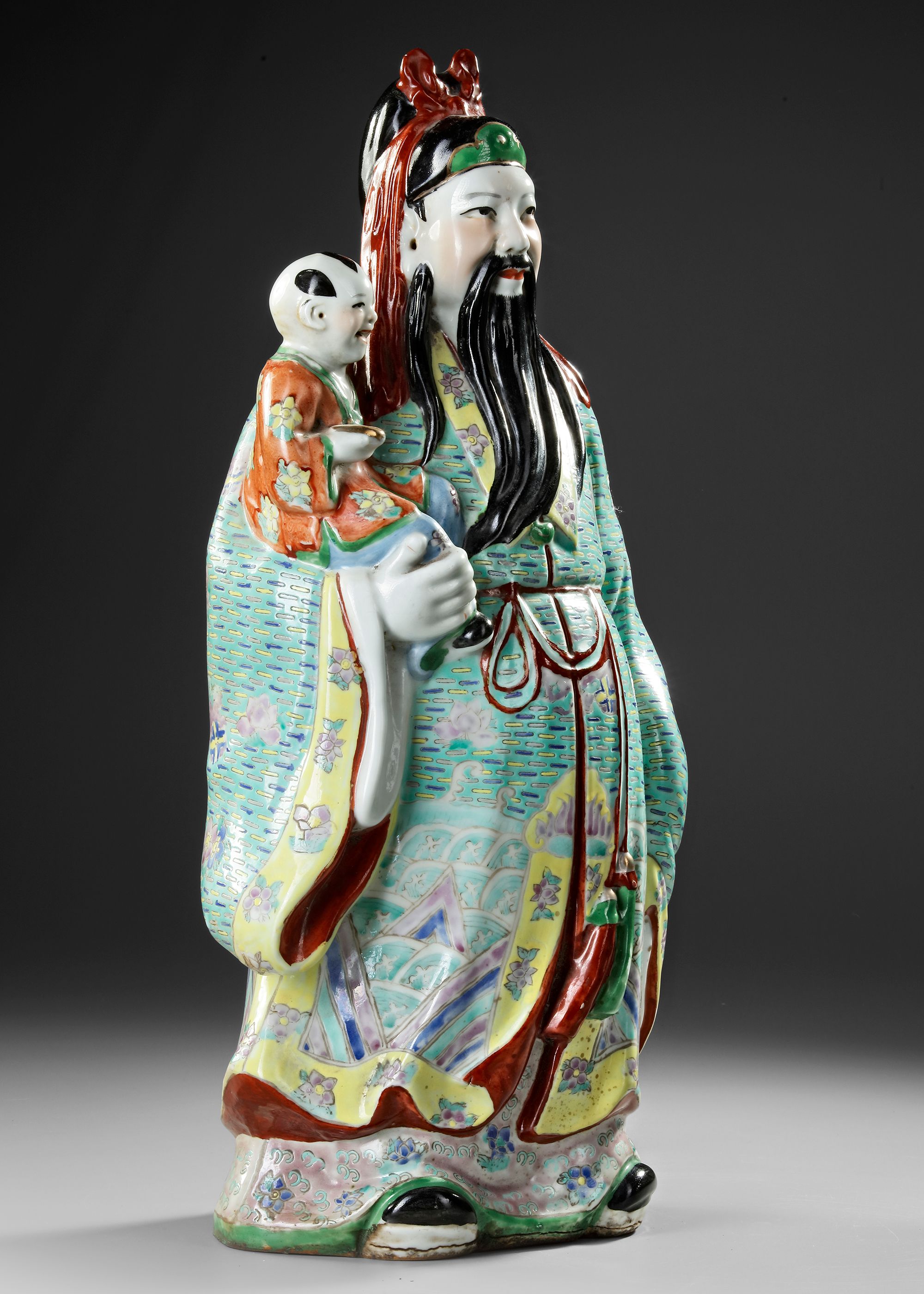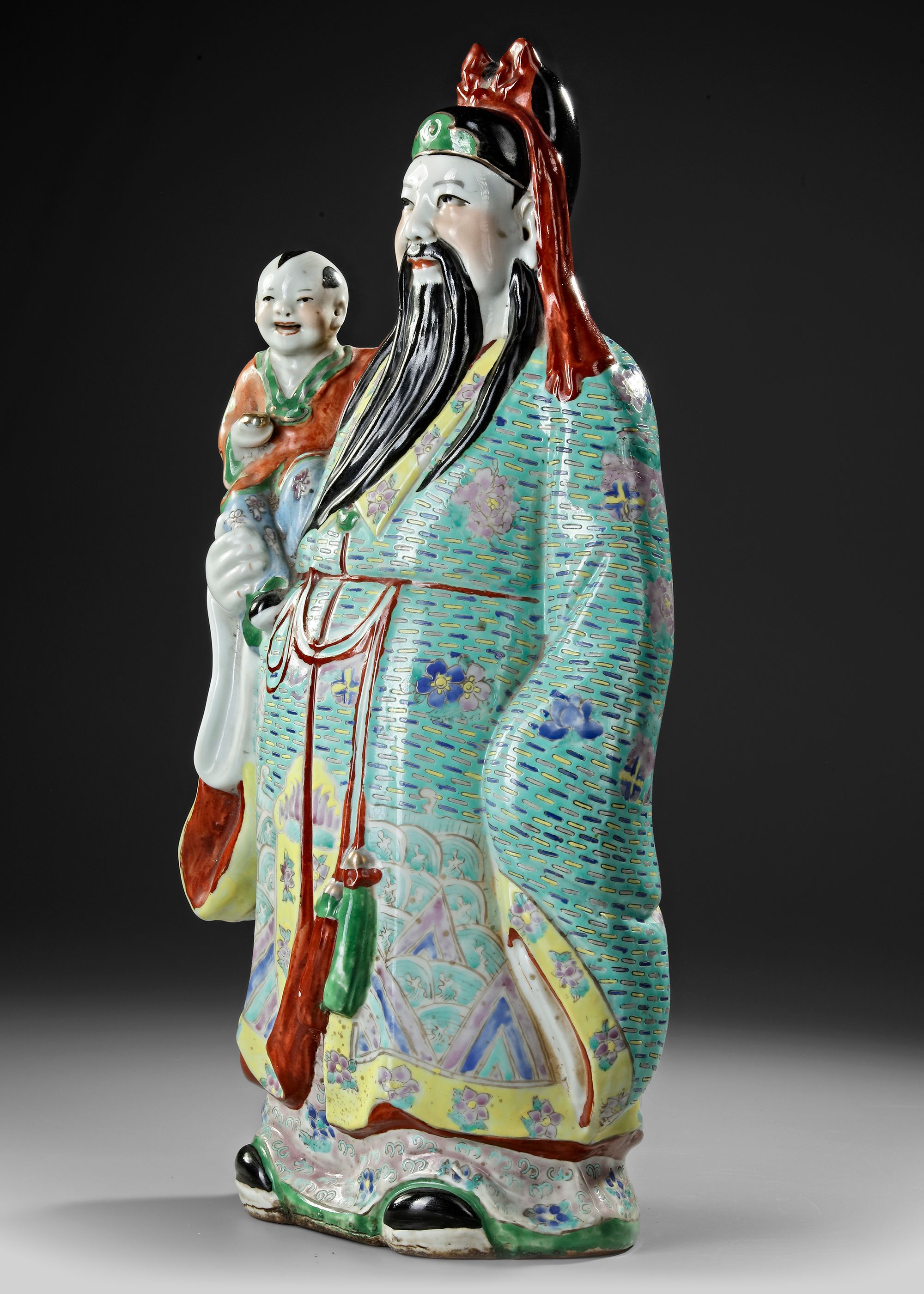A finely enameled porcelain figure depicting Fuxing, the God of Happiness, shown holding a smiling child in his arms — a traditional symbol of prosperity and family blessing. The figure is richly detailed in vibrant famille rose enamels with intricate floral and geometric robe patterns. H. 53 cm.