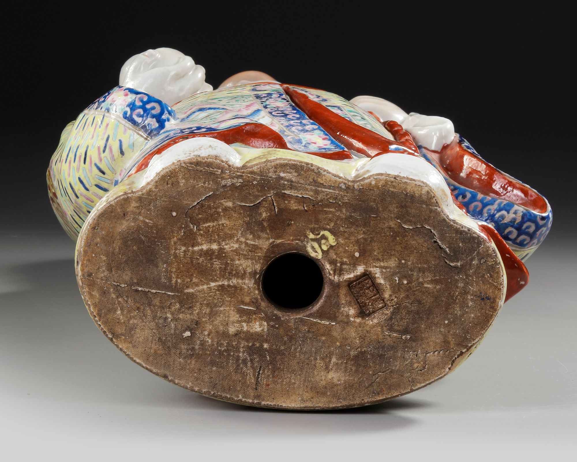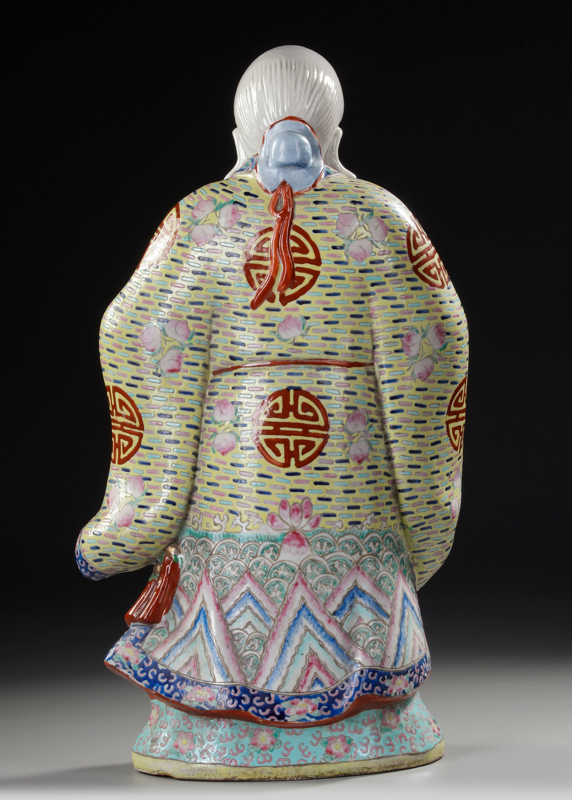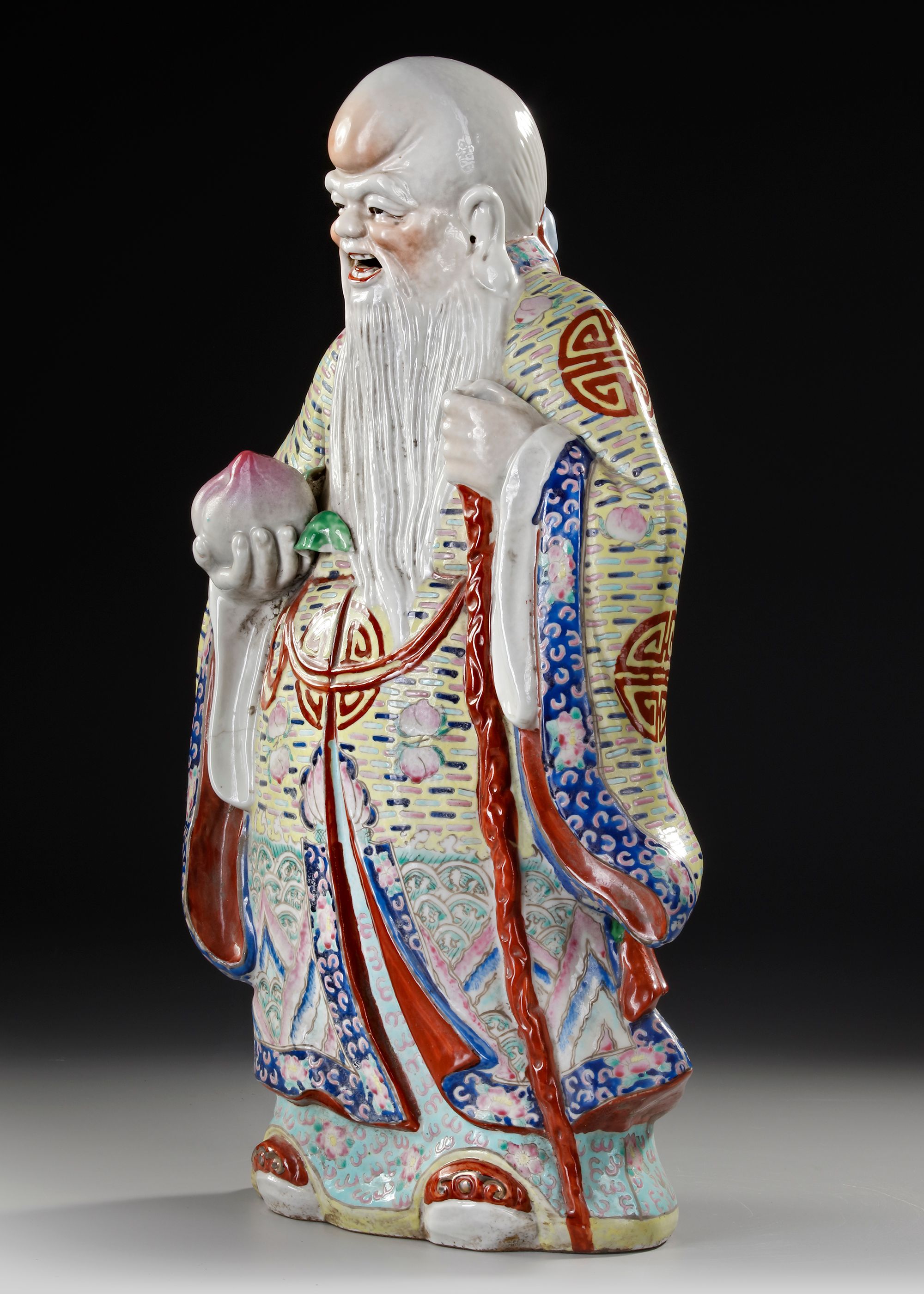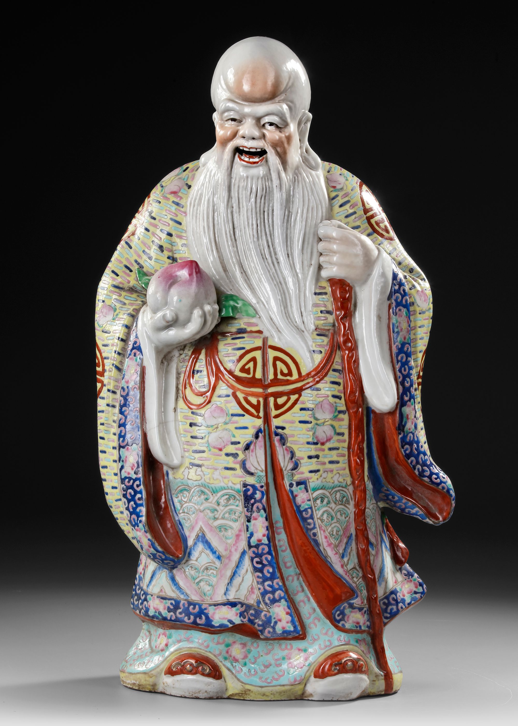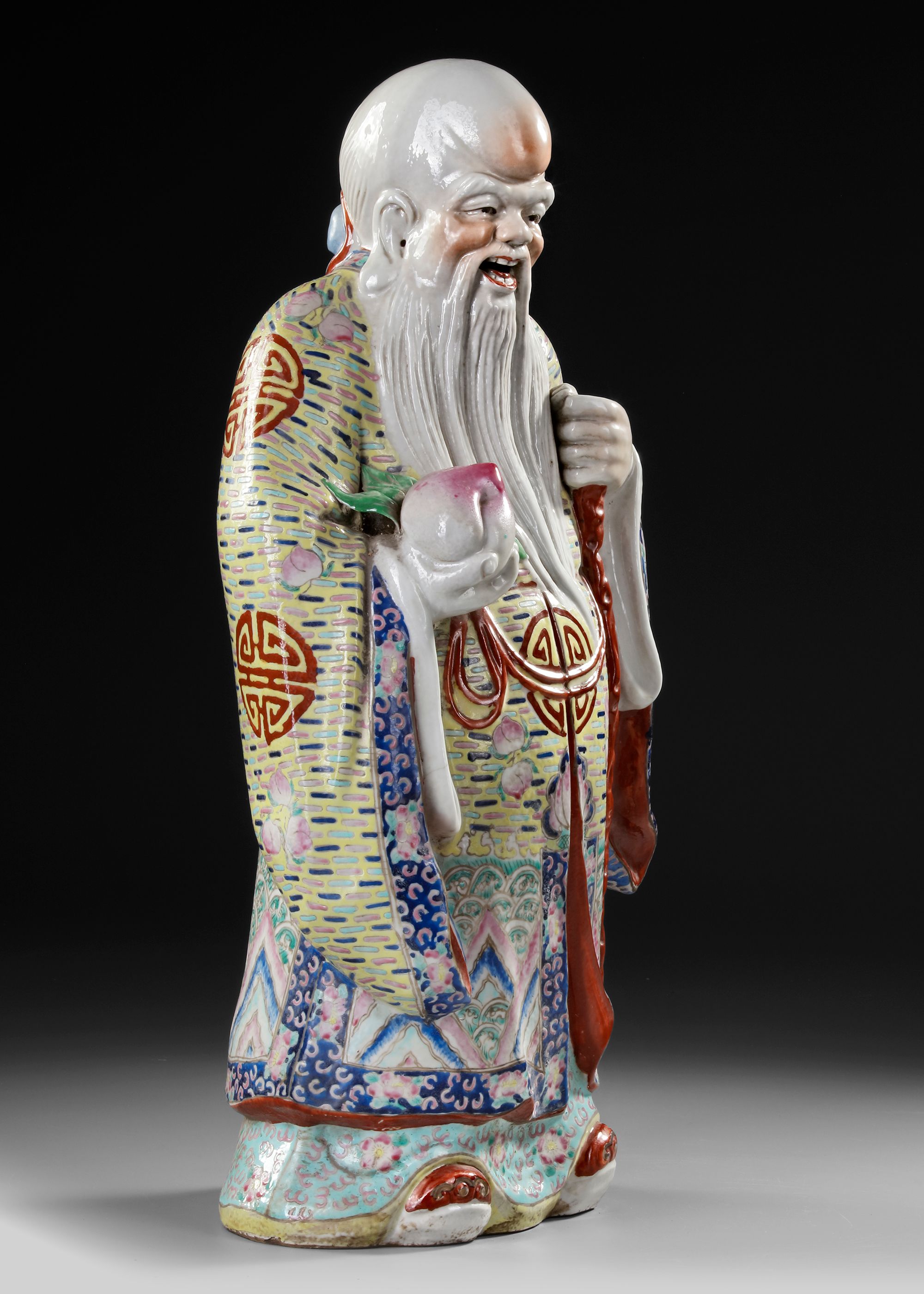 A finely modeled and brightly enameled porcelain figure of Shoulao, the Chinese god of longevity, depicted holding a peach of immortality and a staff. His flowing robes are richly decorated with auspicious symbols and intricate geometric patterns in vivid famille rose enamels. H. 50 cm.