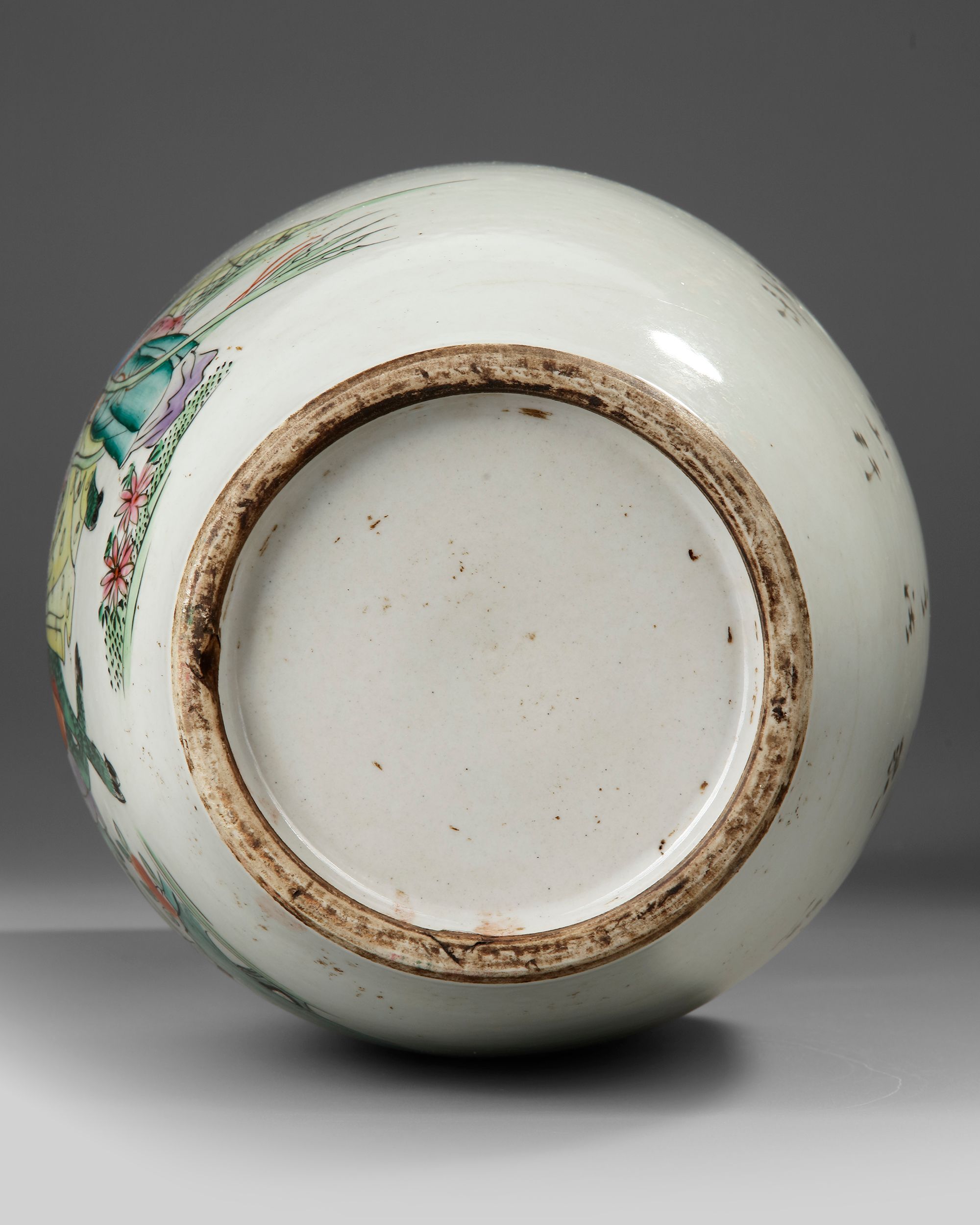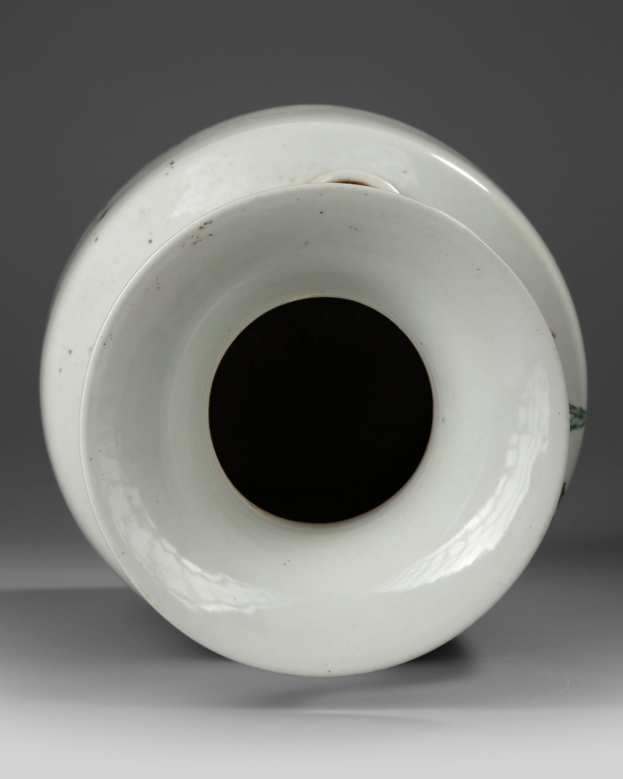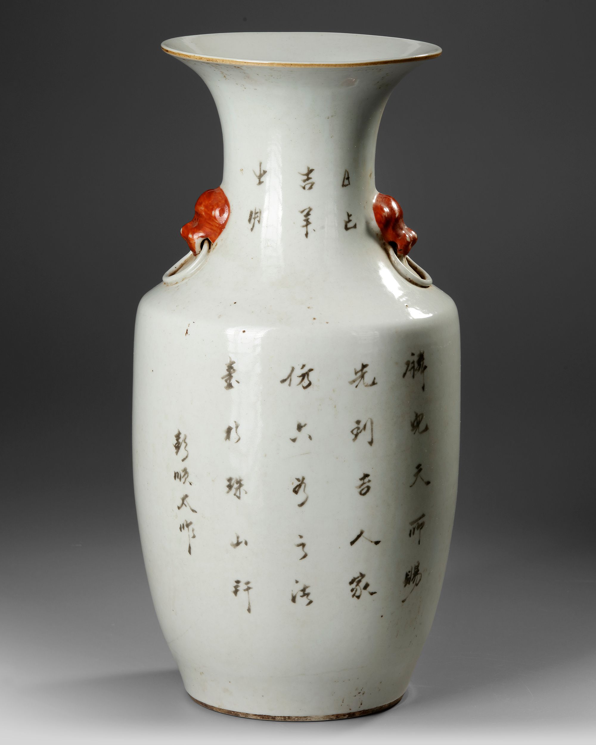 A finely painted porcelain vase decorated in vivid famille rose enamels, depicting figures in a garden scene with mythical creatures and attendants. The reverse features a poetic inscription in calligraphy. Applied red elephant-head handles complete the elegant design. H. 43 cm.