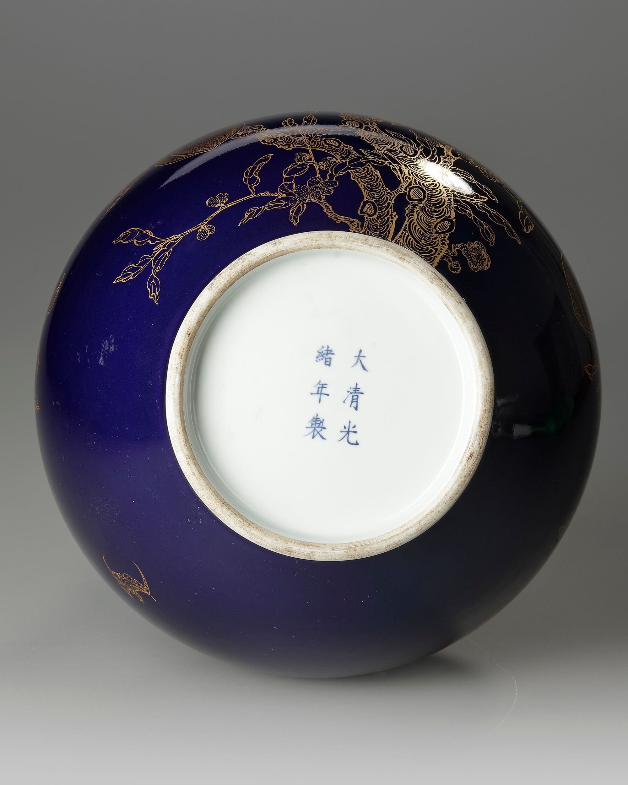 An elegant Chinese porcelain vase with a rich cobalt-blue glaze finely decorated in gilt with blossoming peach branches and bats, symbolizing longevity and prosperity. The base bears a six-character Guangxu mark.