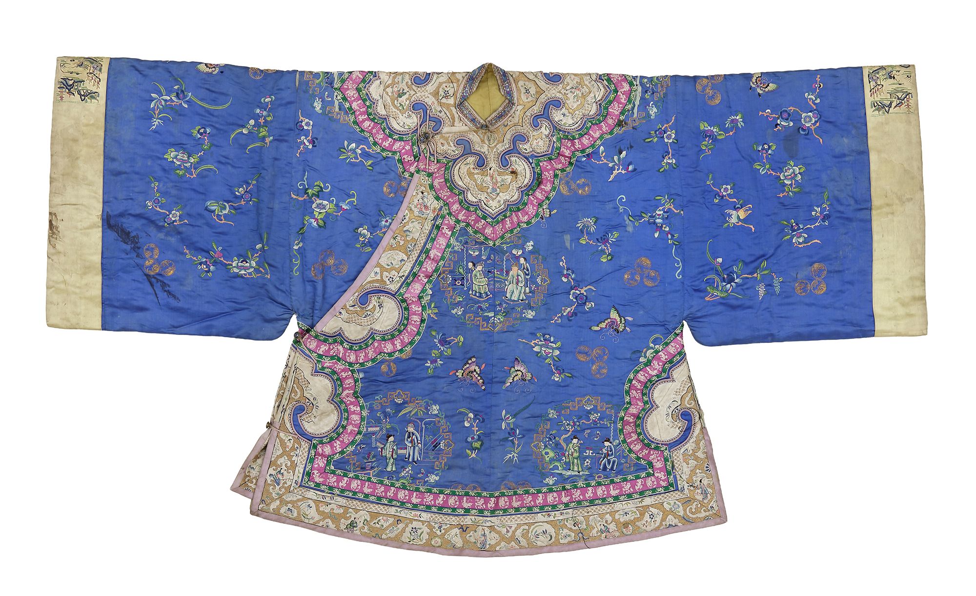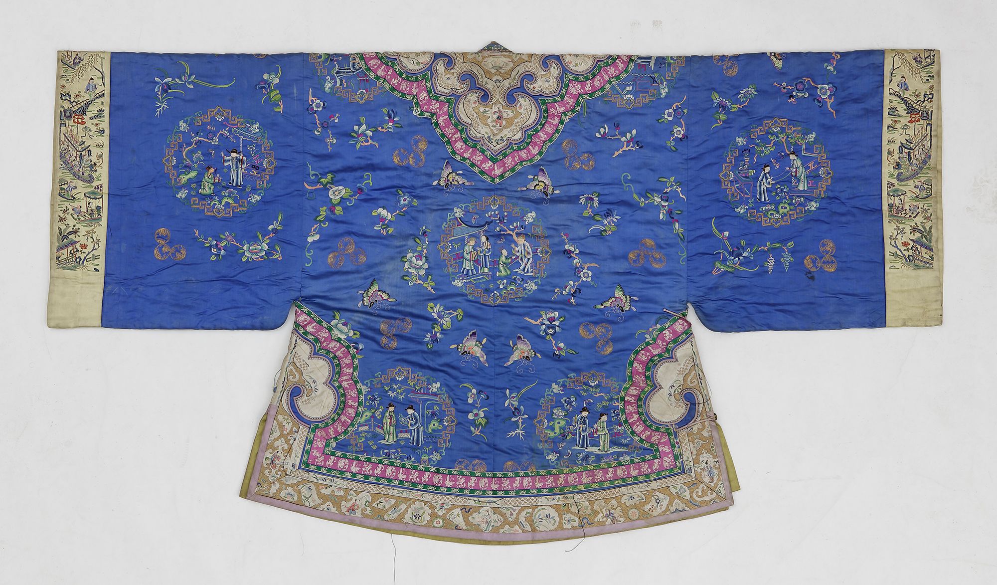 A finely embroidered Chinese silk robe of rich blue ground, decorated with detailed scenes of figures, flowers, and auspicious motifs in vibrant silk threads. The borders and cuffs are adorned with intricate floral and geometric patter