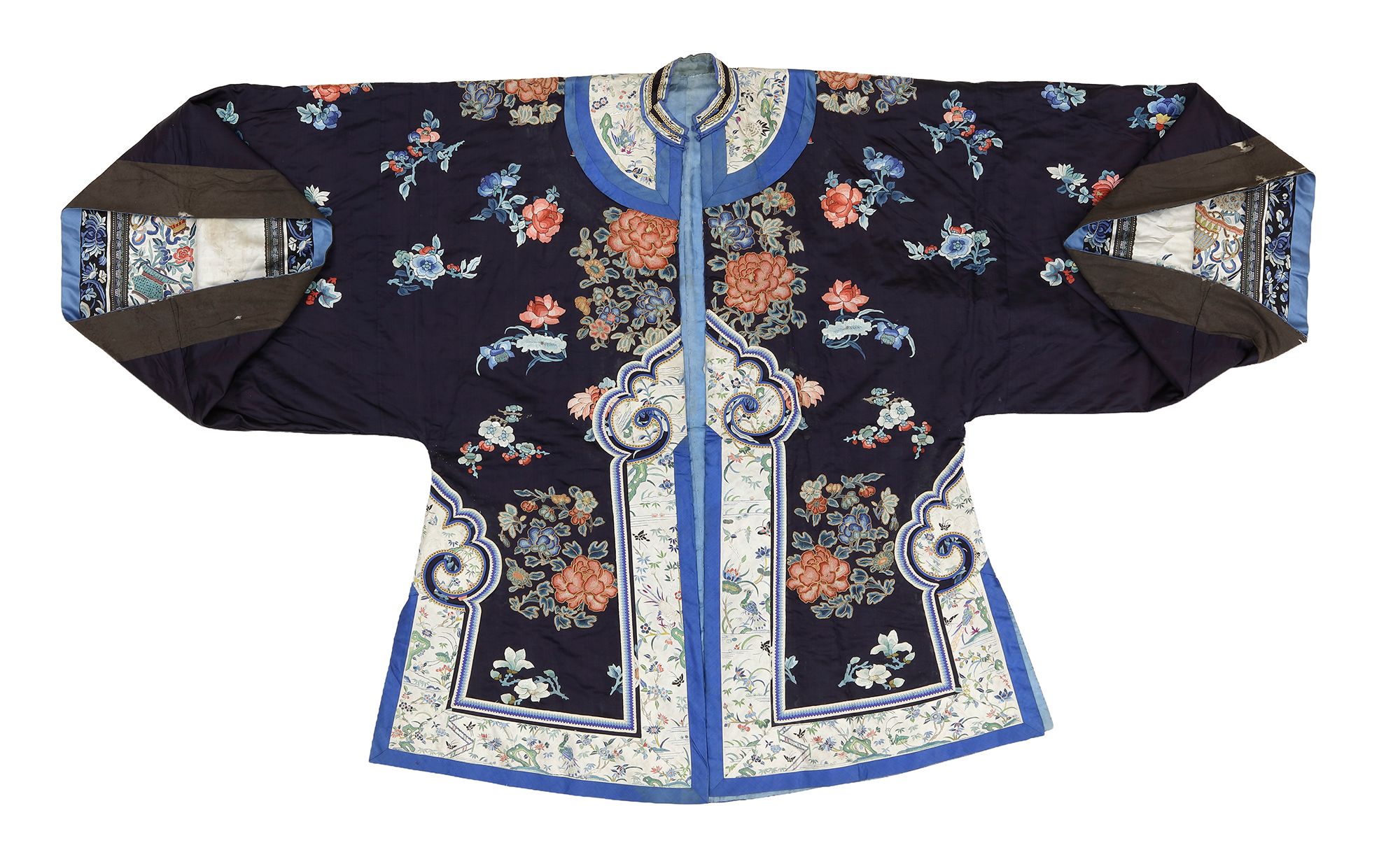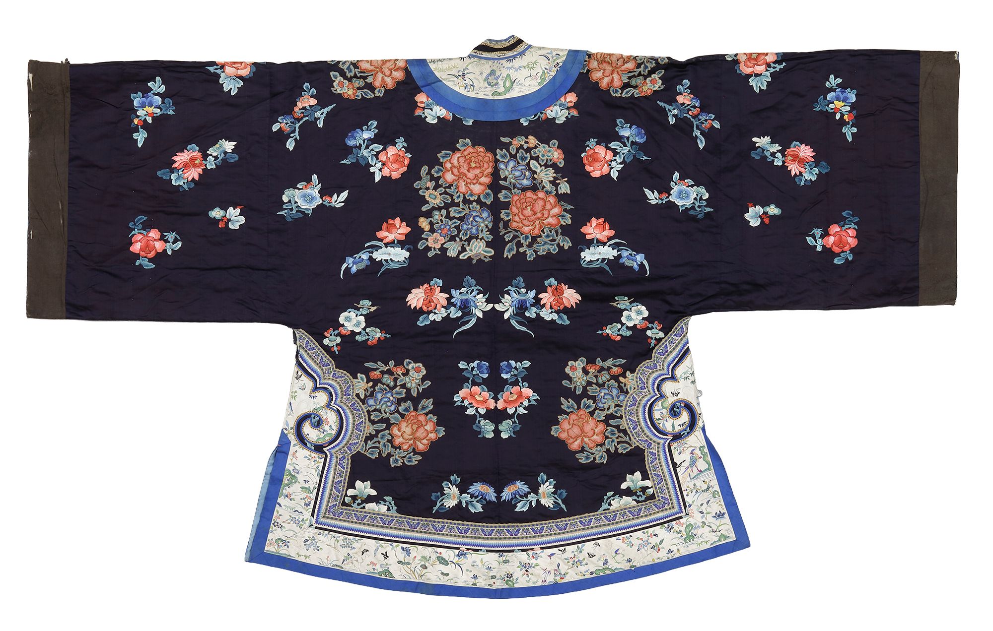 An elegant Chinese woman’s silk robe, finely embroidered with vibrant floral motifs in shades of red, blue, and green on a dark navy ground. The borders are richly detailed with floral scrolls and geometric designs, framed by blue and white silk trims. L. 100 cm.