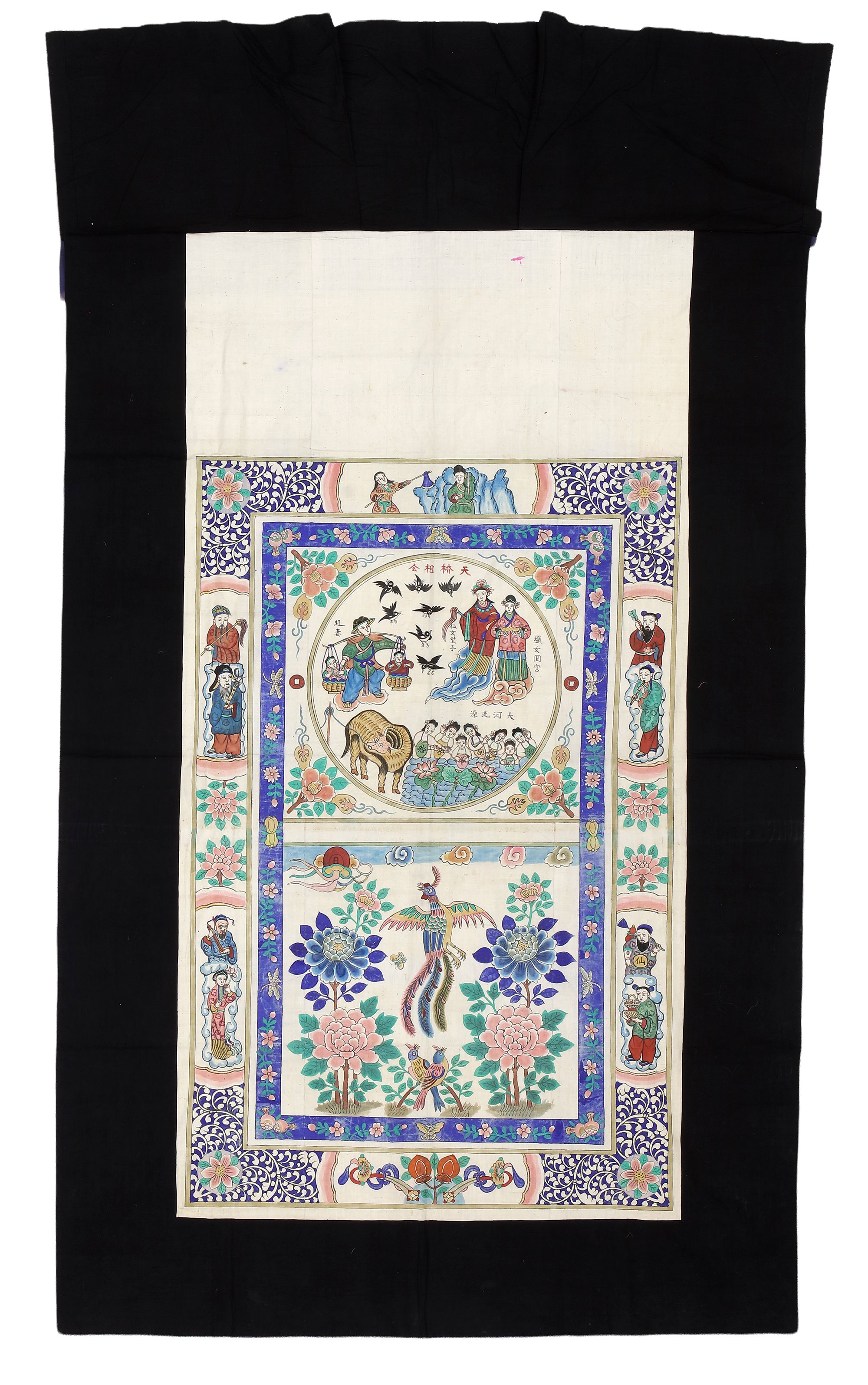 A finely detailed Chinese painting on fabric depicting celestial figures, mythical animals, and floral motifs in vivid colors. The composition features elegant borders with symbolic designs,