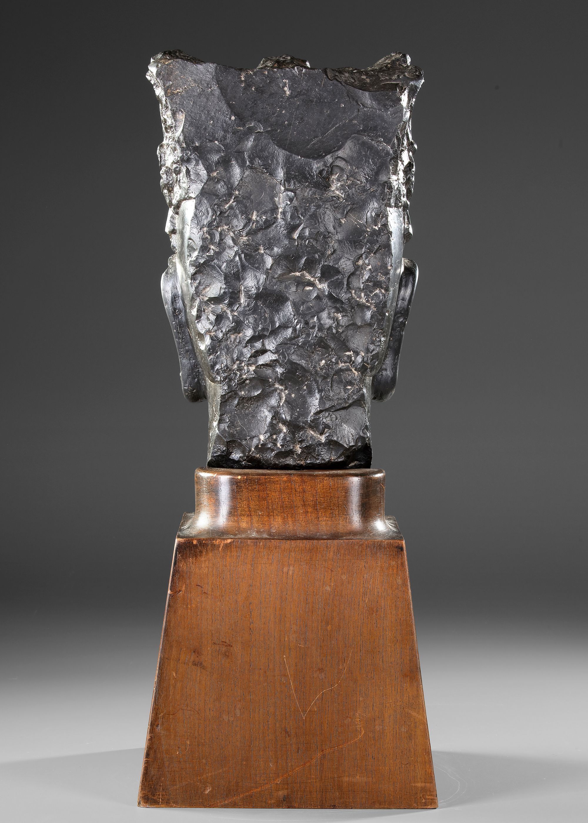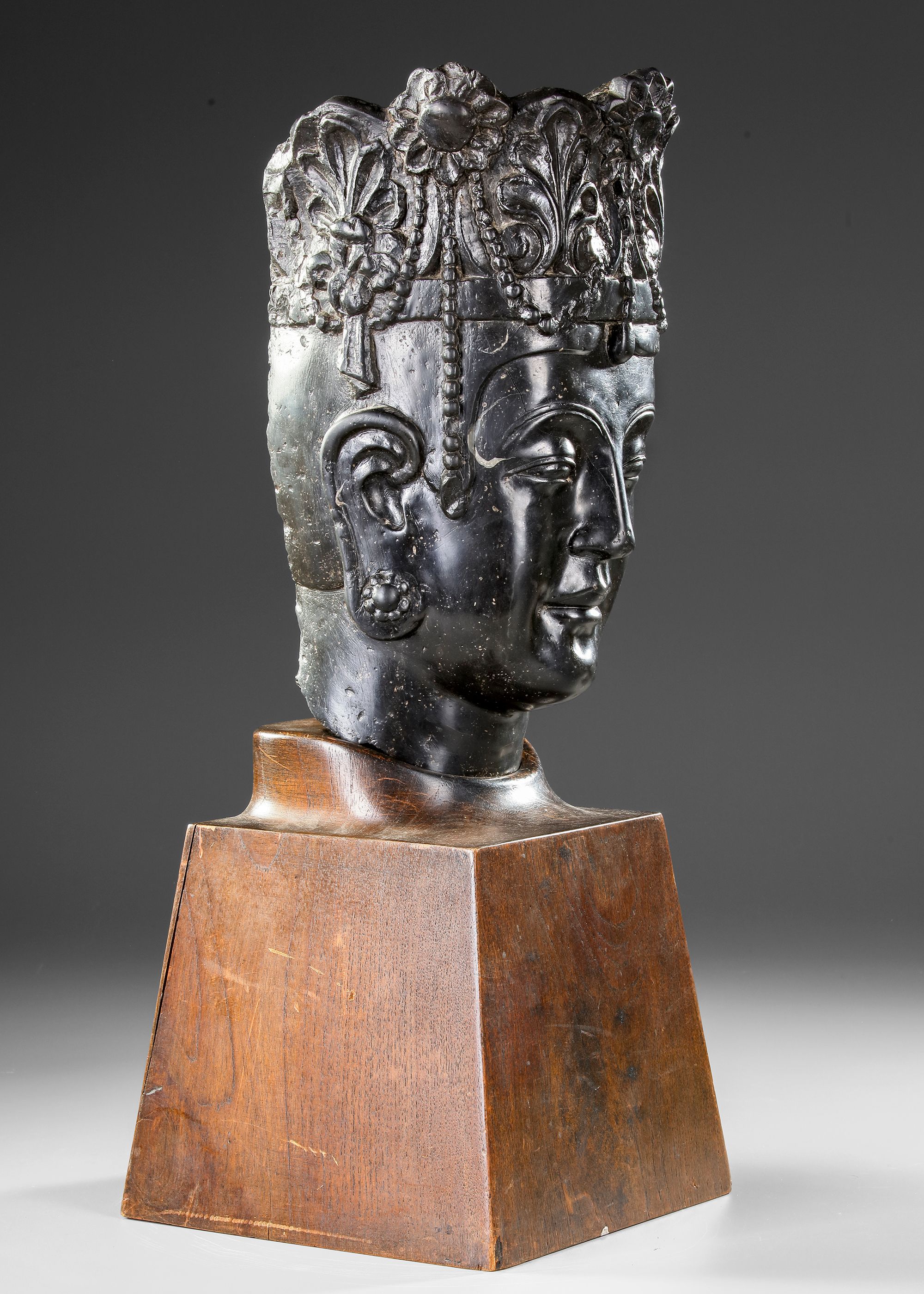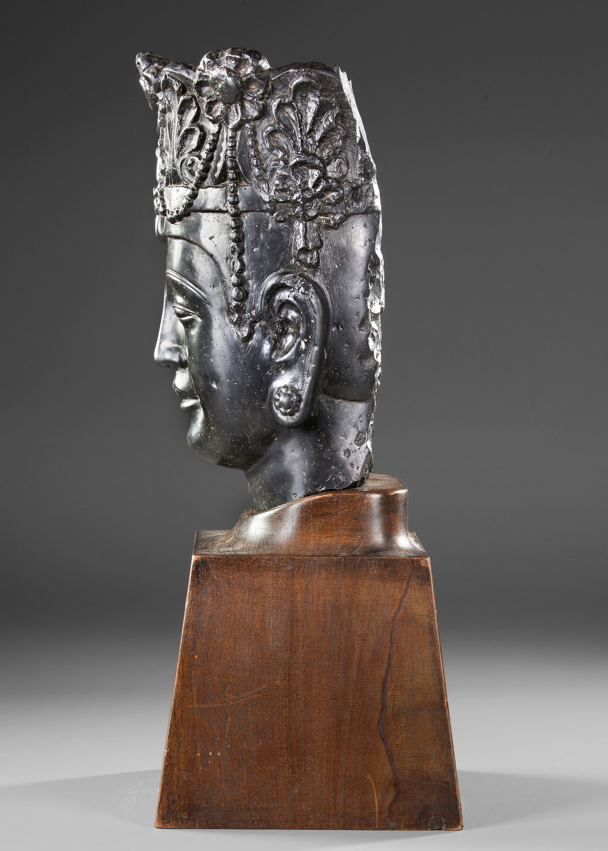 A finely carved stone head of a Bodhisattva, depicting a serene expression with downcast eyes and a gentle smile. The figure wears an elaborate floral crown adorned with beads and ornaments. The sculpture displays graceful detailing and a calm spiritual presence, mounted on a wooden stand for display.
