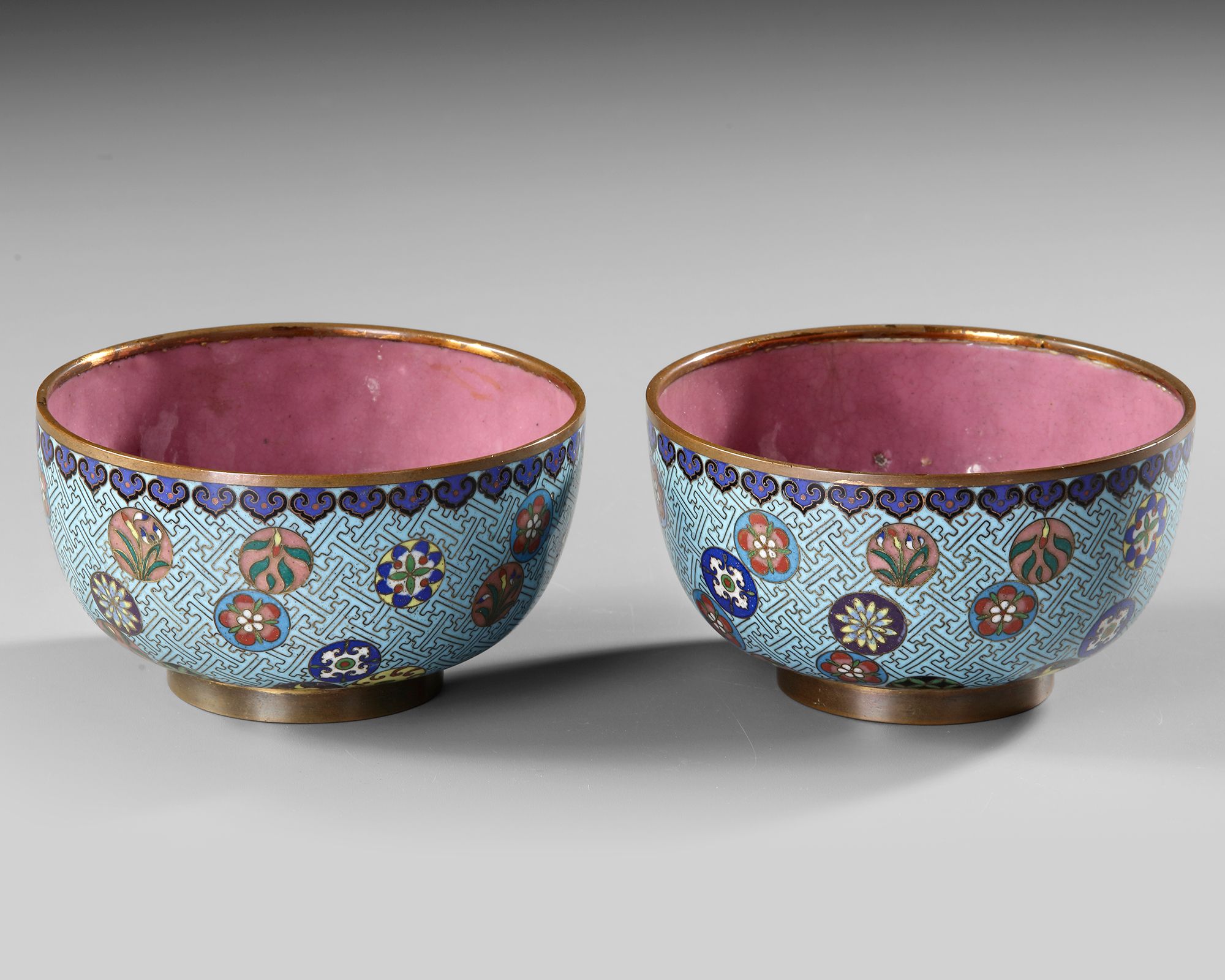 A fine pair of cloisonné bowls decorated with colorful floral roundels on a turquoise geometric ground, the interiors in rich pink enamel and bases in sky blue.
