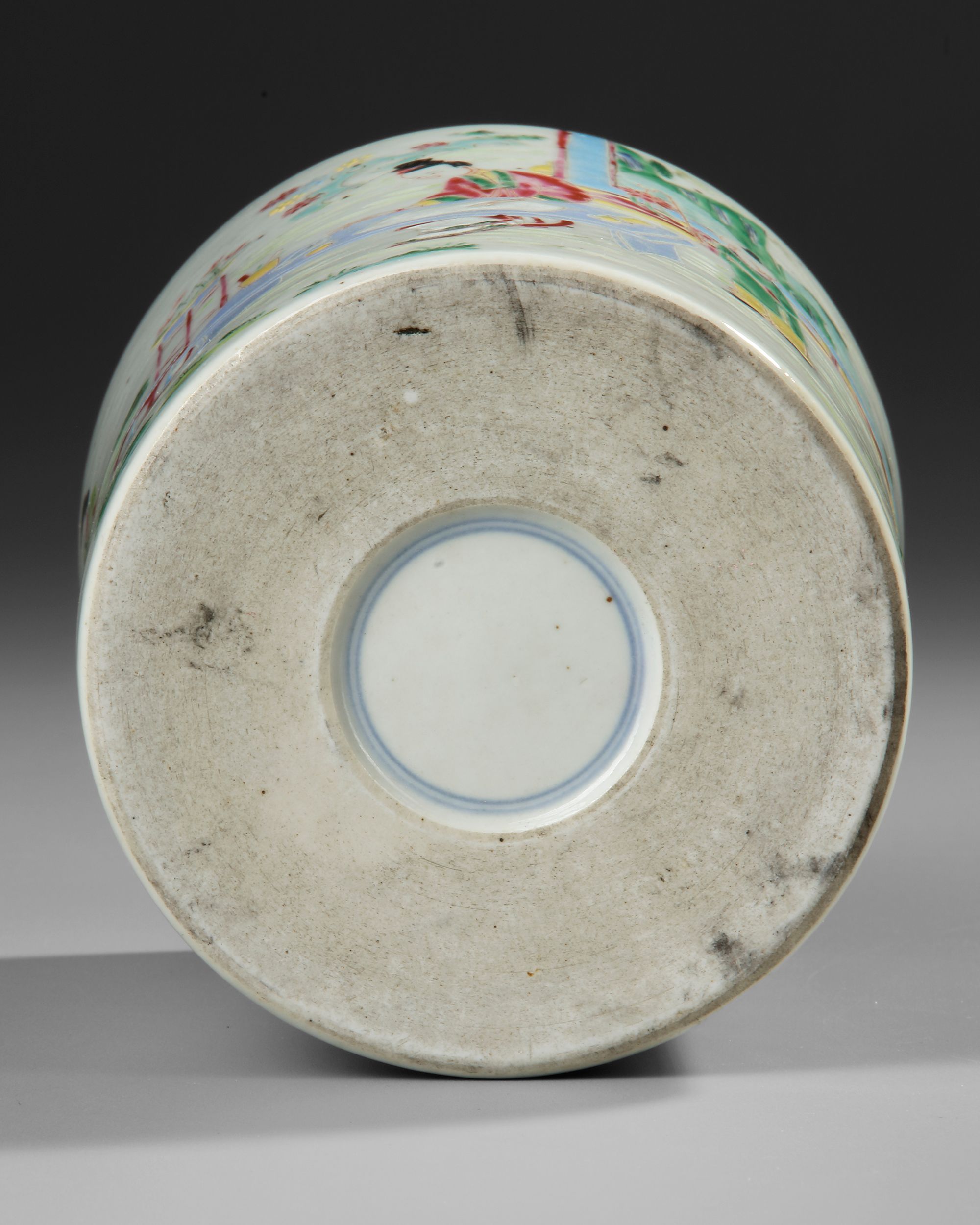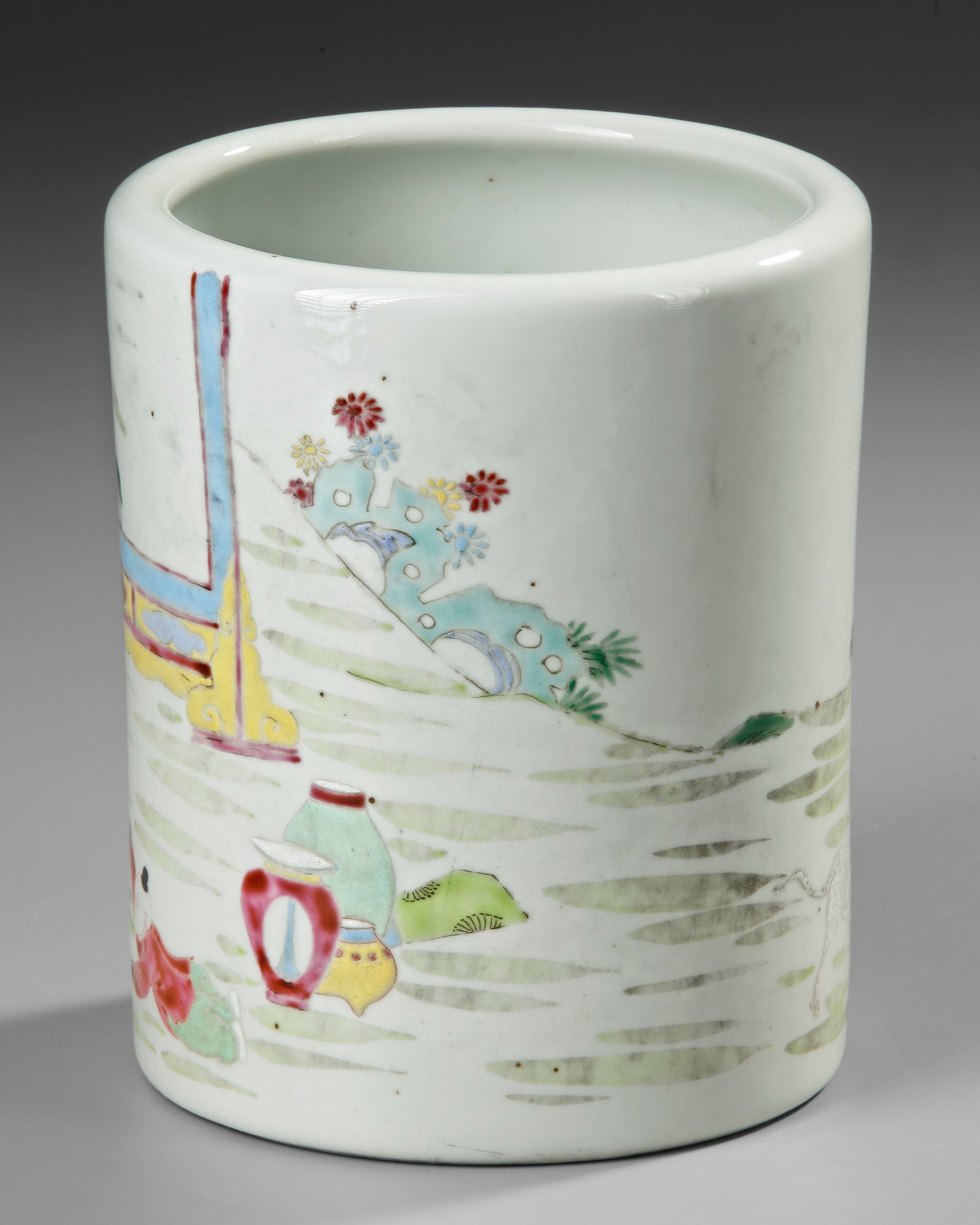 Chinese porcelain brush pot delicately painted in famille rose enamels, depicting a scholar and attendant in a garden pavilion with vases, scrolls, and blossoming flowers.