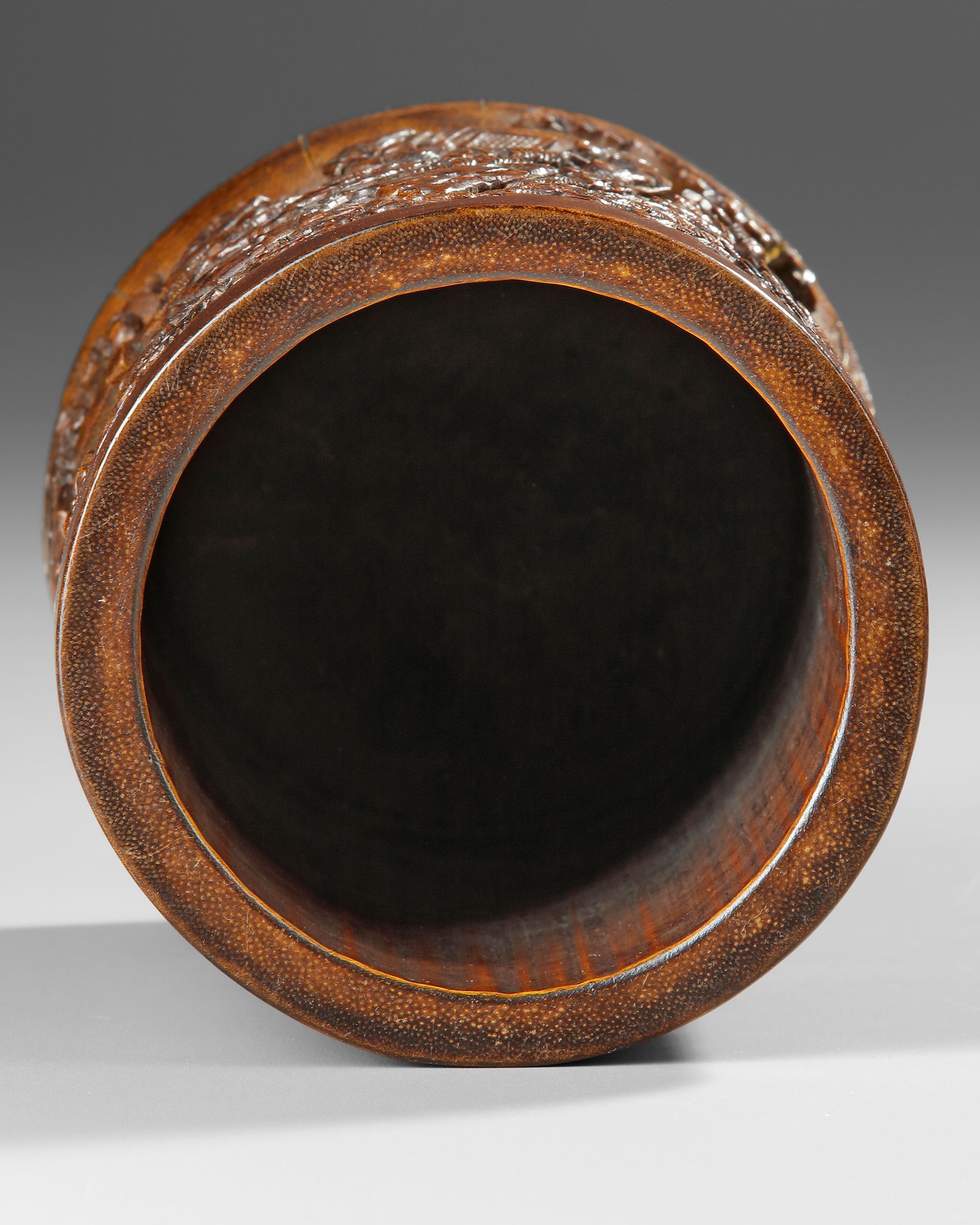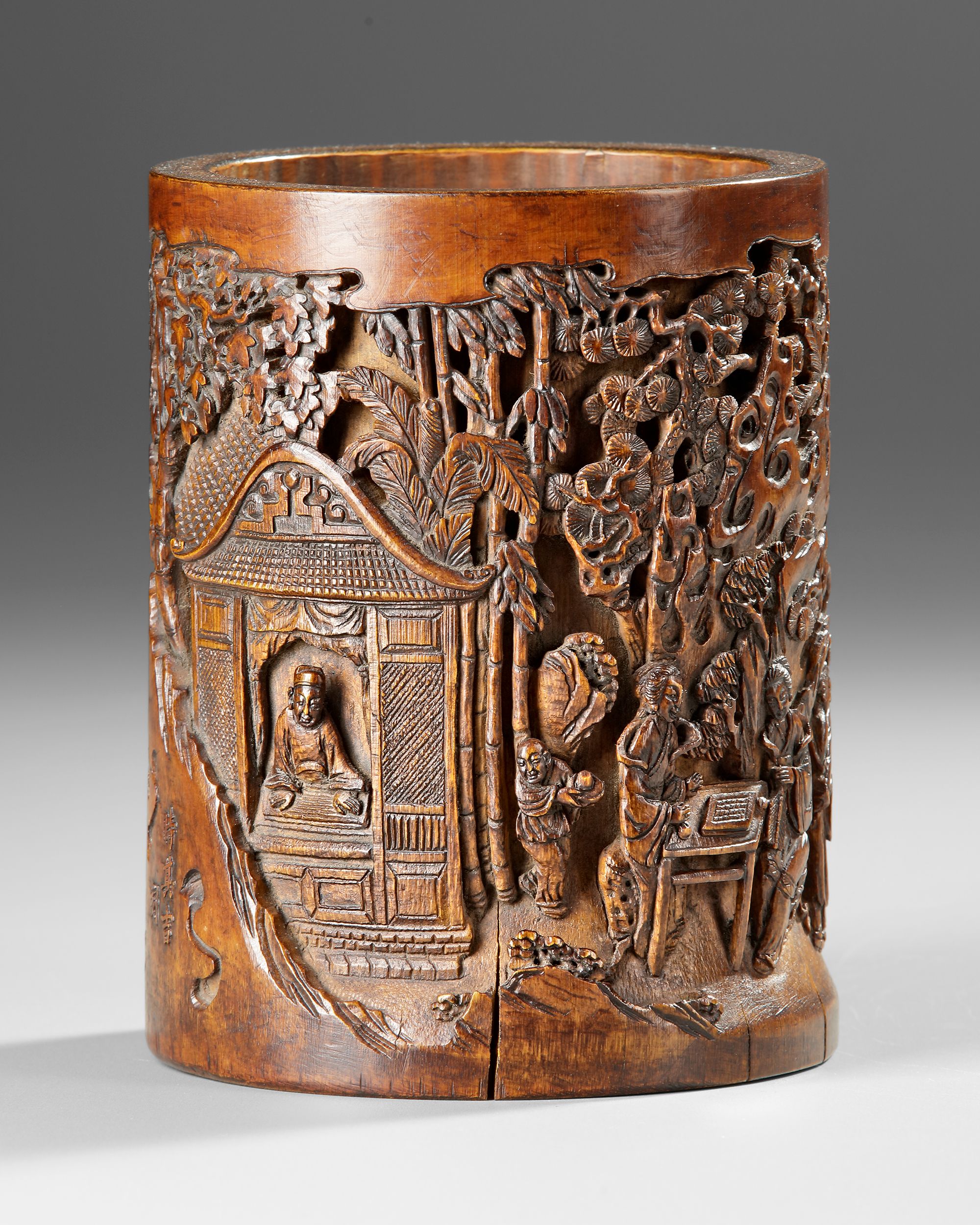 An intricately carved Chinese bamboo brush pot (bitong) depicting scholars in a garden pavilion, surrounded by pine, bamboo, and rockwork—symbols of endurance and virtue. The deep relief carving shows exceptional craftsmanship and attention to detail,