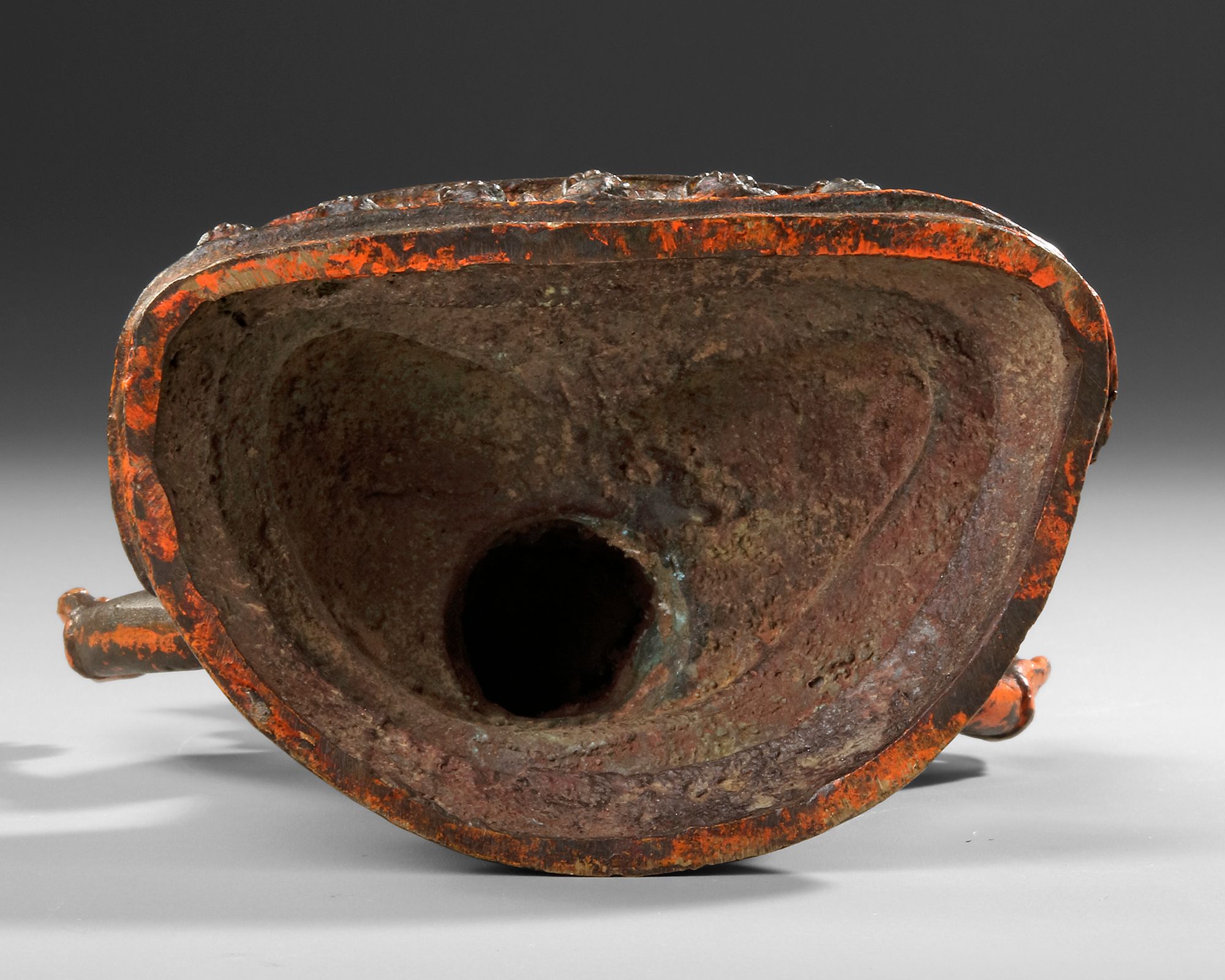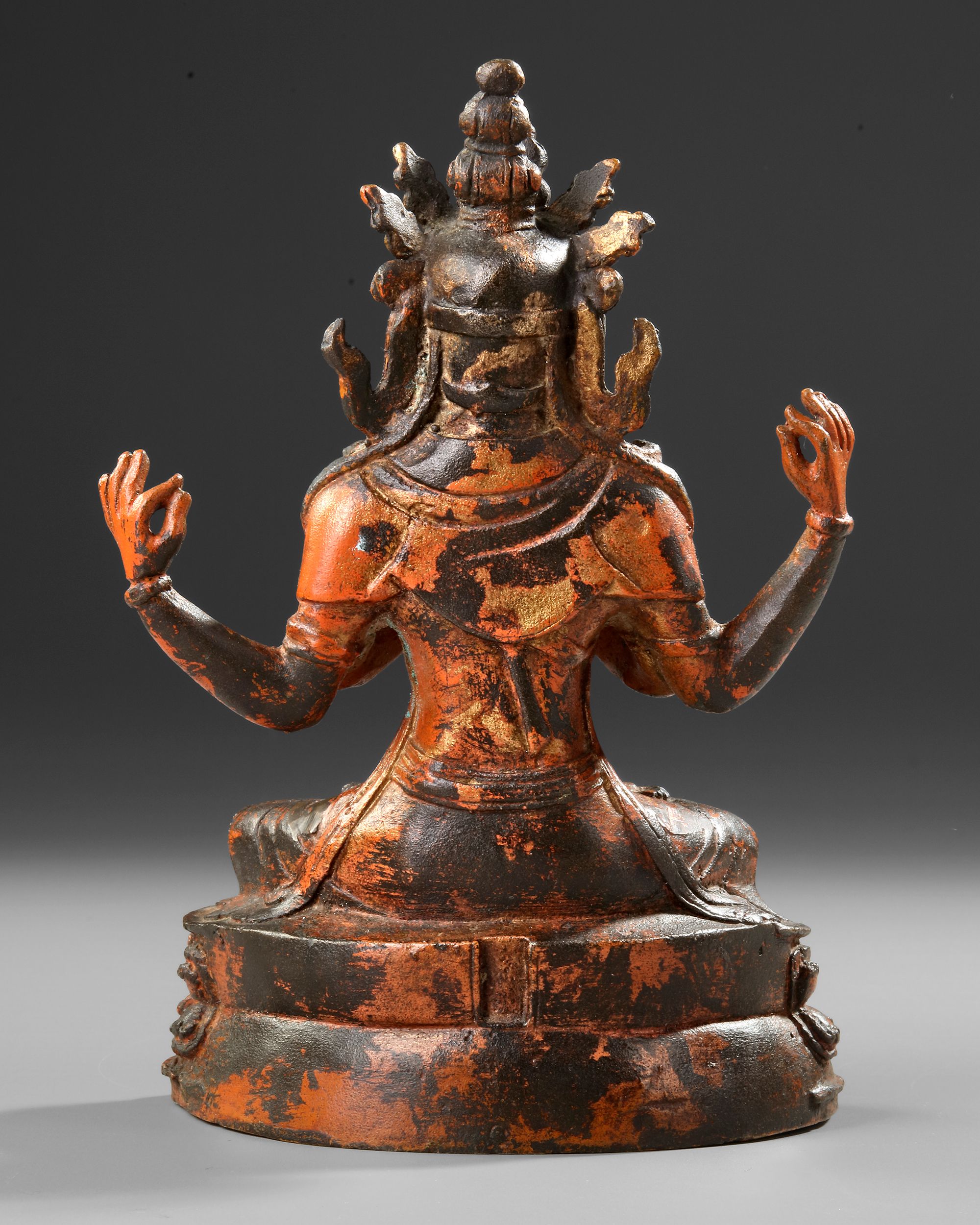 A finely cast Chinese bronze figure depicting Avalokiteshvara (Guanyin) seated in meditation on a double lotus base. The deity is shown with six arms, each performing symbolic mudras of compassion and wisdom. The figure retains traces of gilding and red lacquer, emphasizing its sacred presence. H. 21 cm.