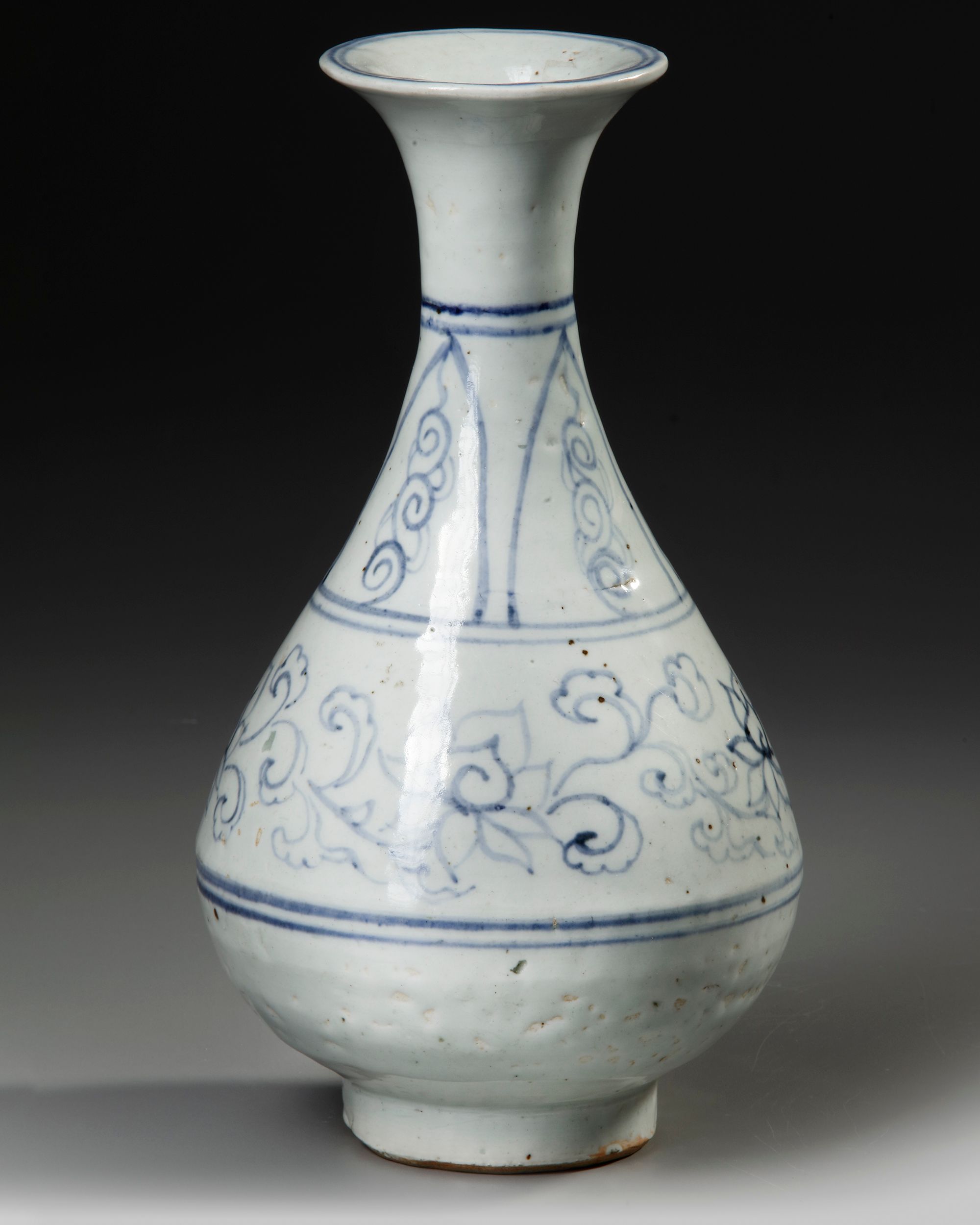 A graceful Yuhuchunping vase finely decorated in underglaze blue with lotus scrolls and stylized motifs. The elegant pear-shaped body rises to a slender neck with flared rim.