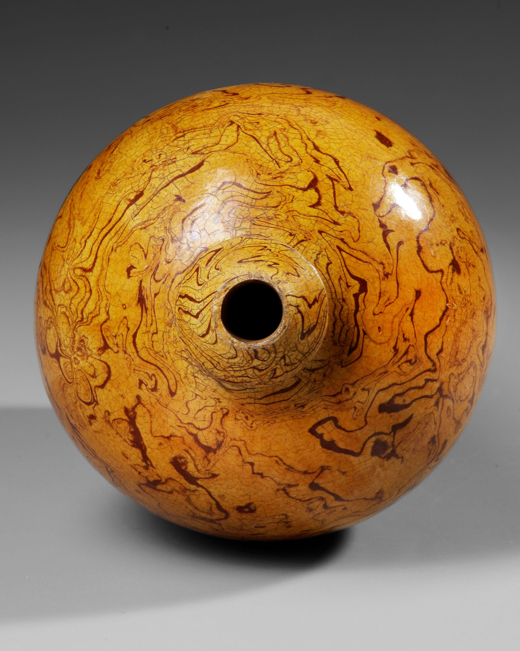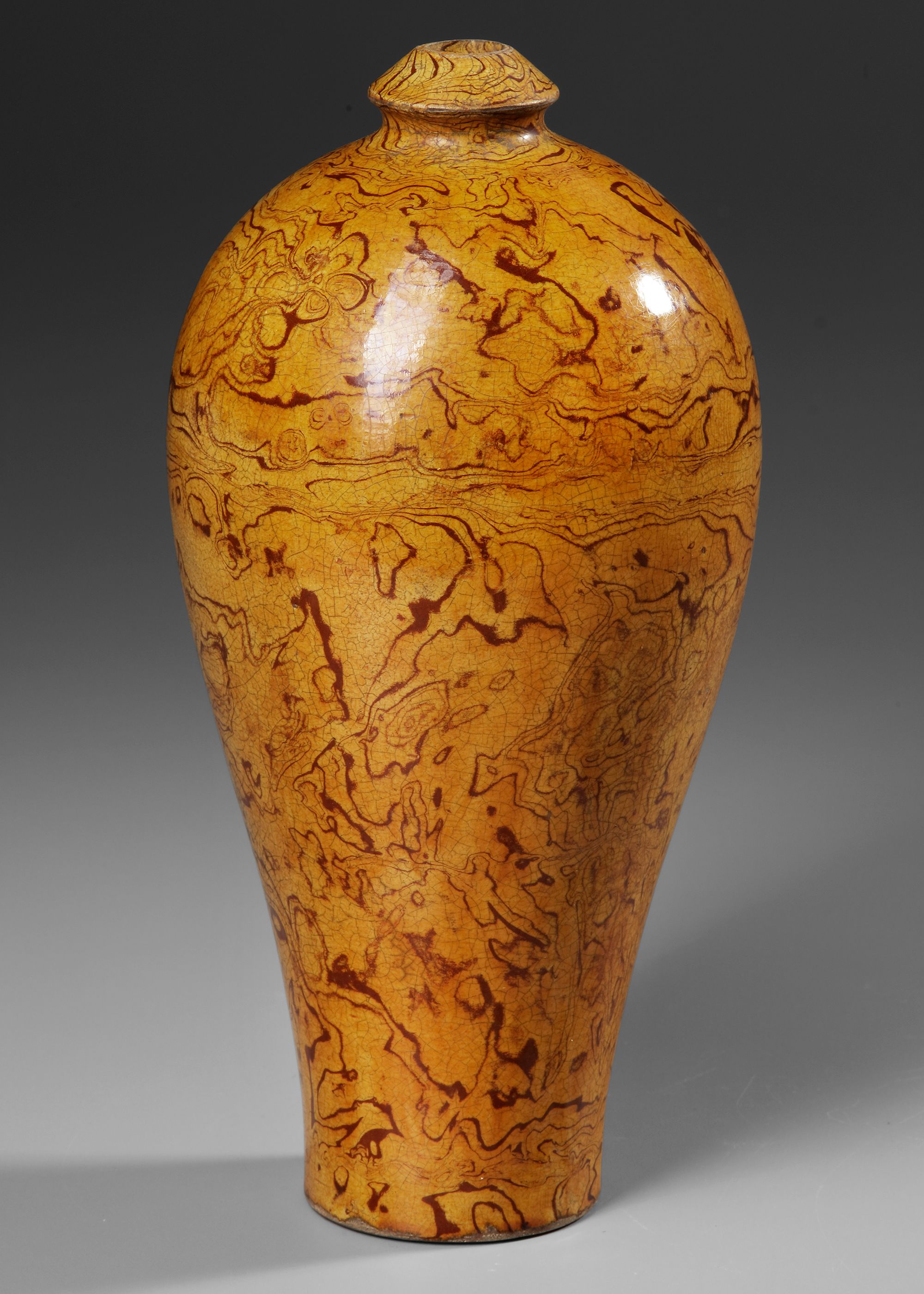 Chinese vase of meiping form, covered in a striking yellow glaze with brown marbled veining reminiscent of tortoiseshell or oil-spot” effects.