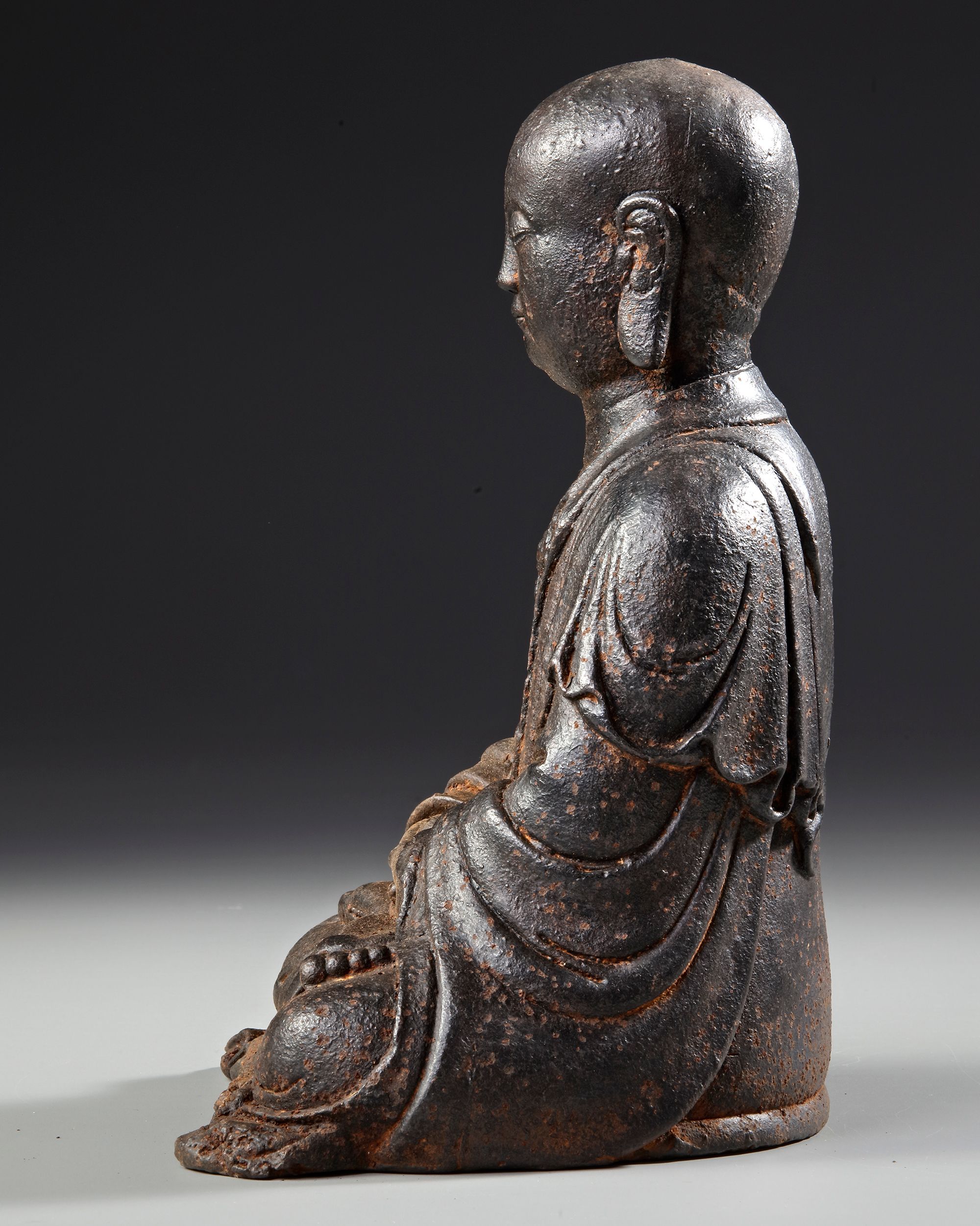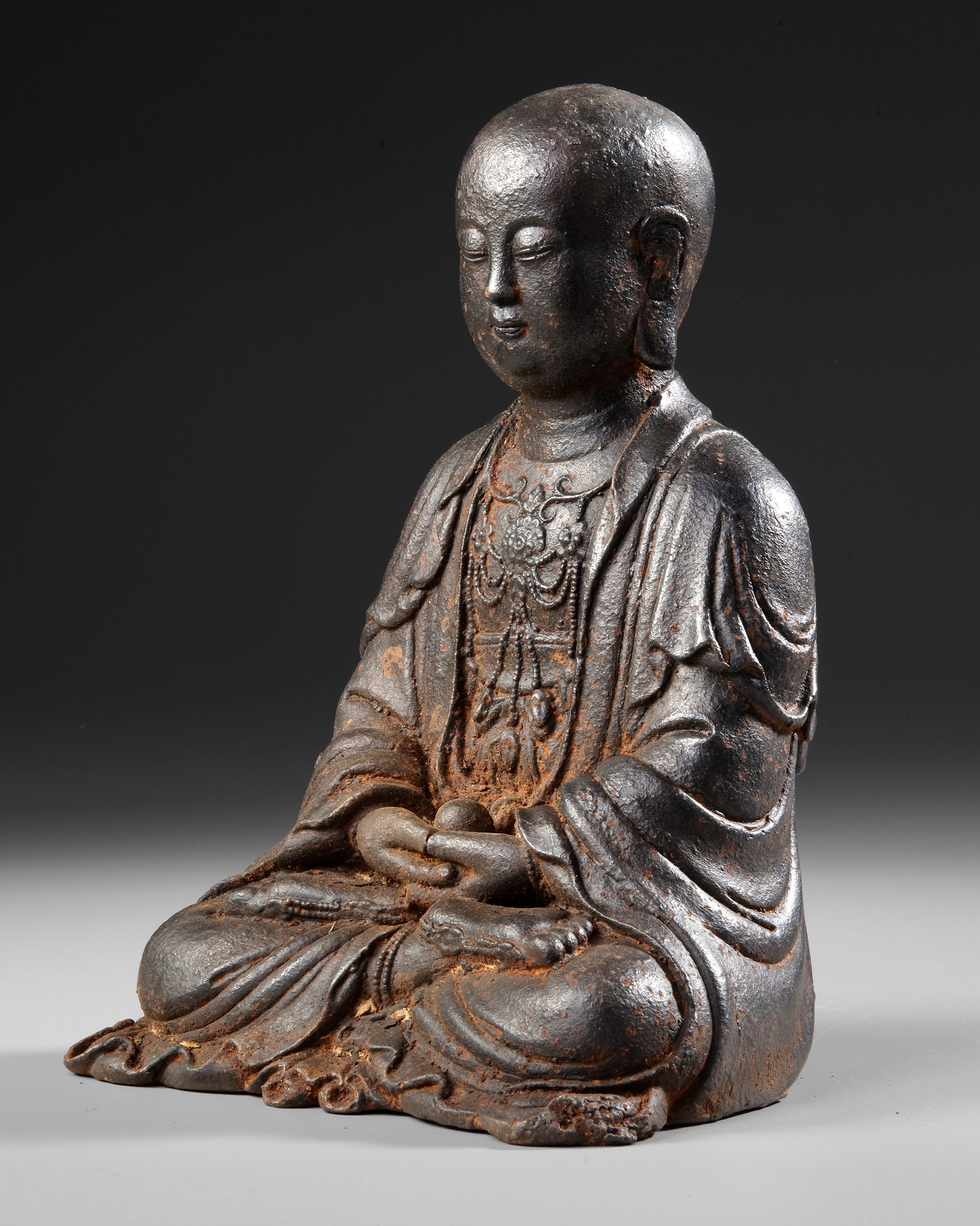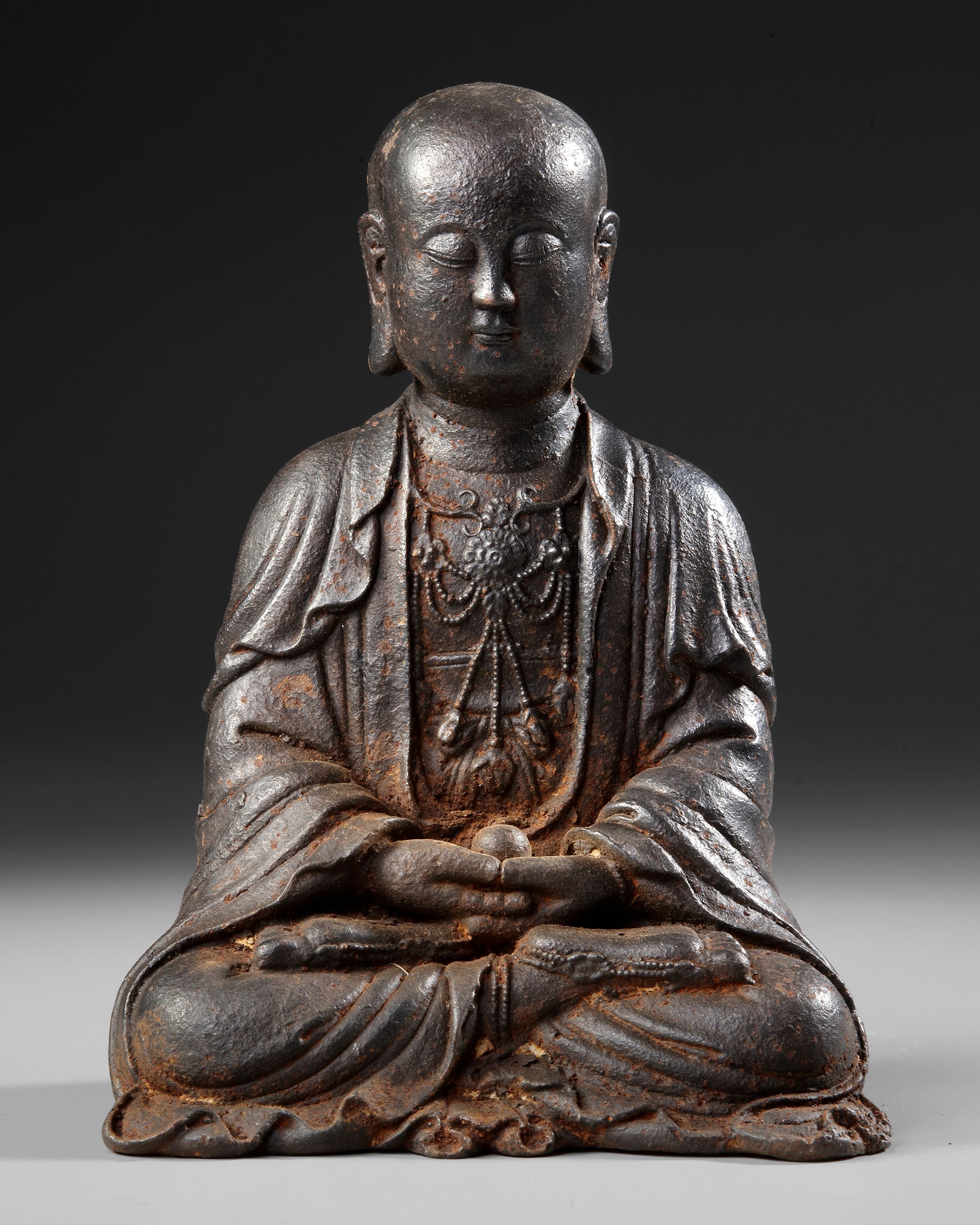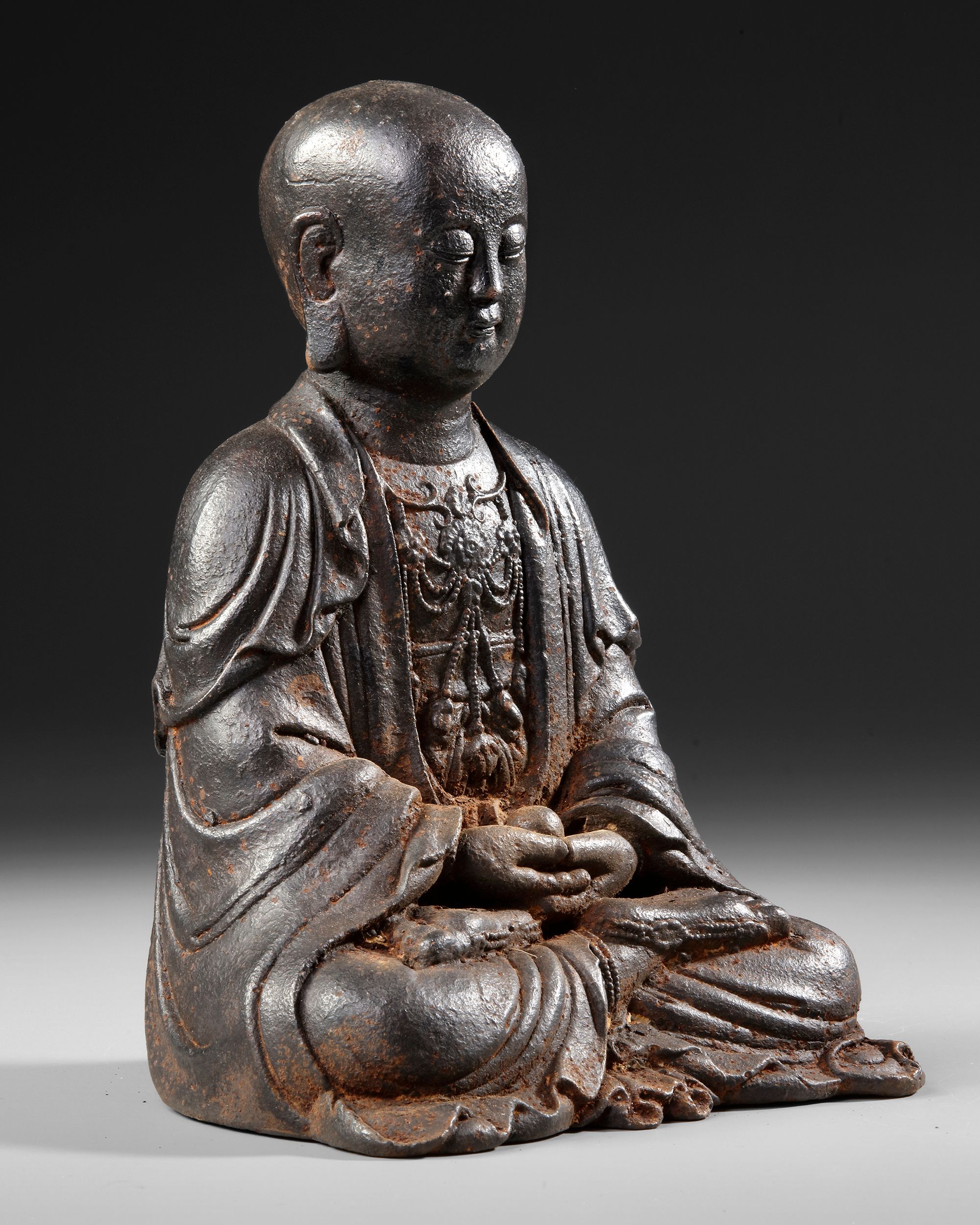 A finely cast Chinese bronze figure depicting a serene seated figure in meditative posture, hands resting in dhyana mudra. H. 26 cm.