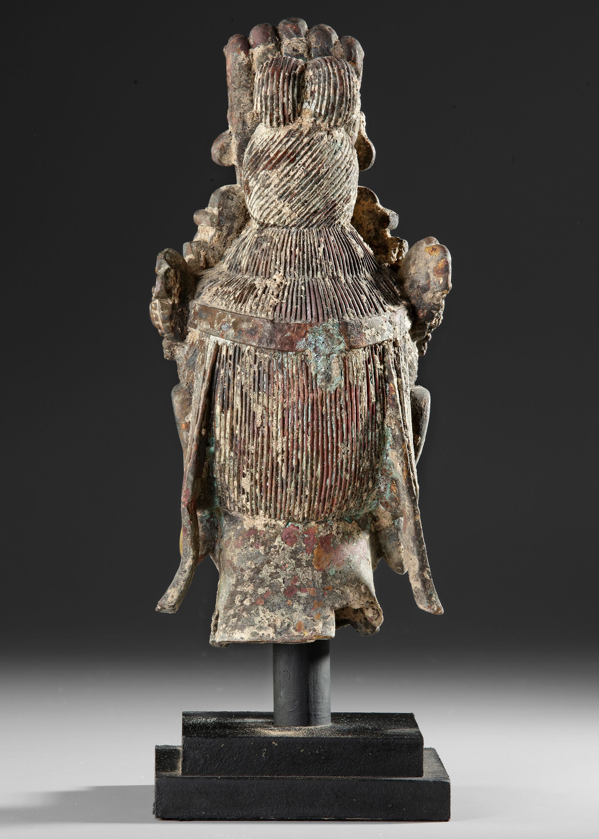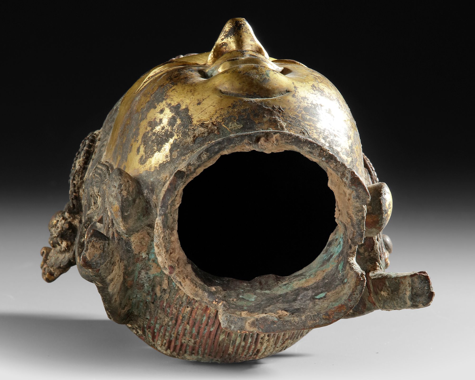 This impressive sculpture represents Guanyin, the Bodhisattva of Compassion, depicted with a serene and benevolent expression. The head is finely cast in bronze and richly gilded, showcasing exquisite detailing in the facial features, crown, and hair. The remains of gilding and patina attest to its antiquity and sacred purpose, while the elaborate headdress, adorned with floral and scrolling motifs. Height 31 cm.