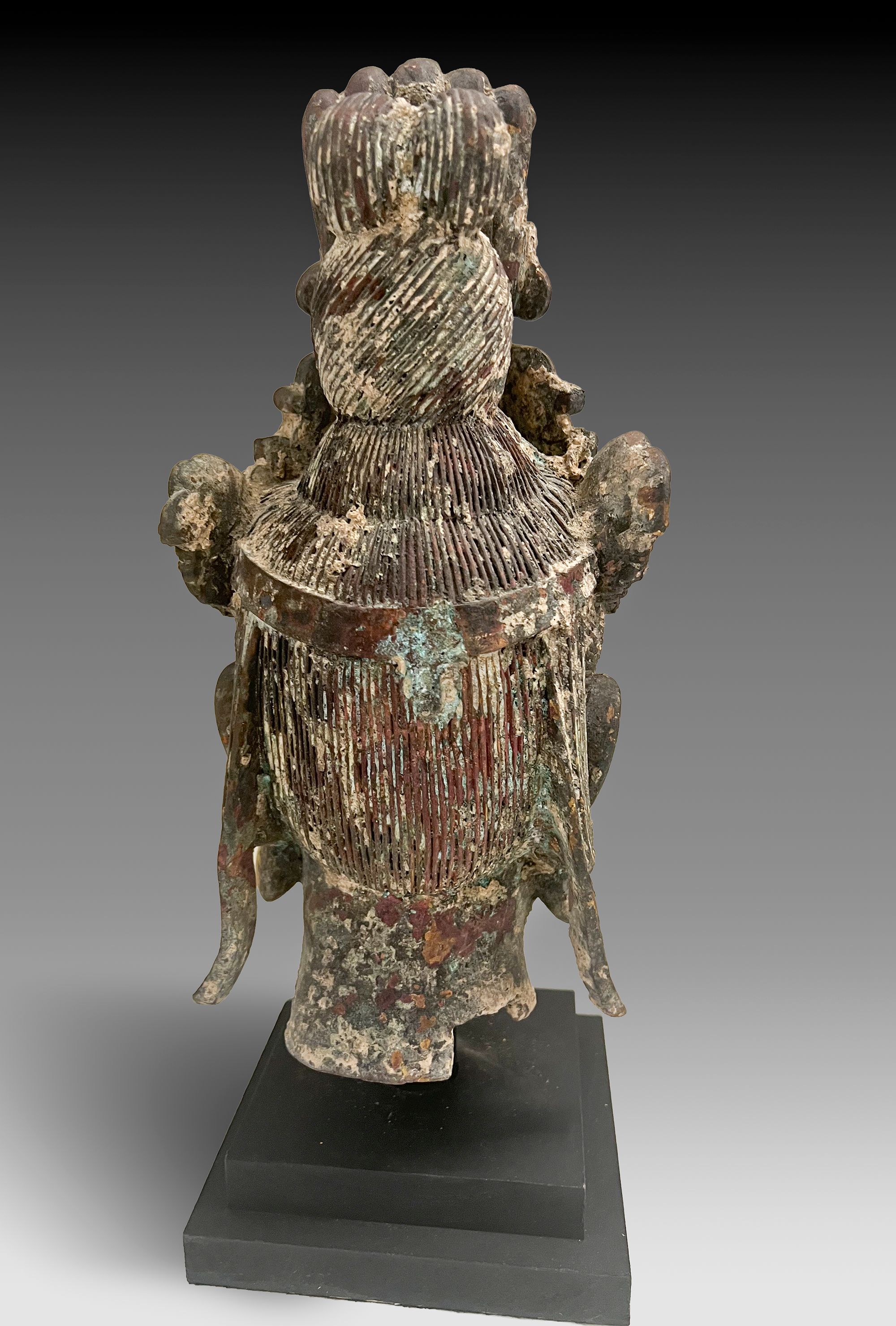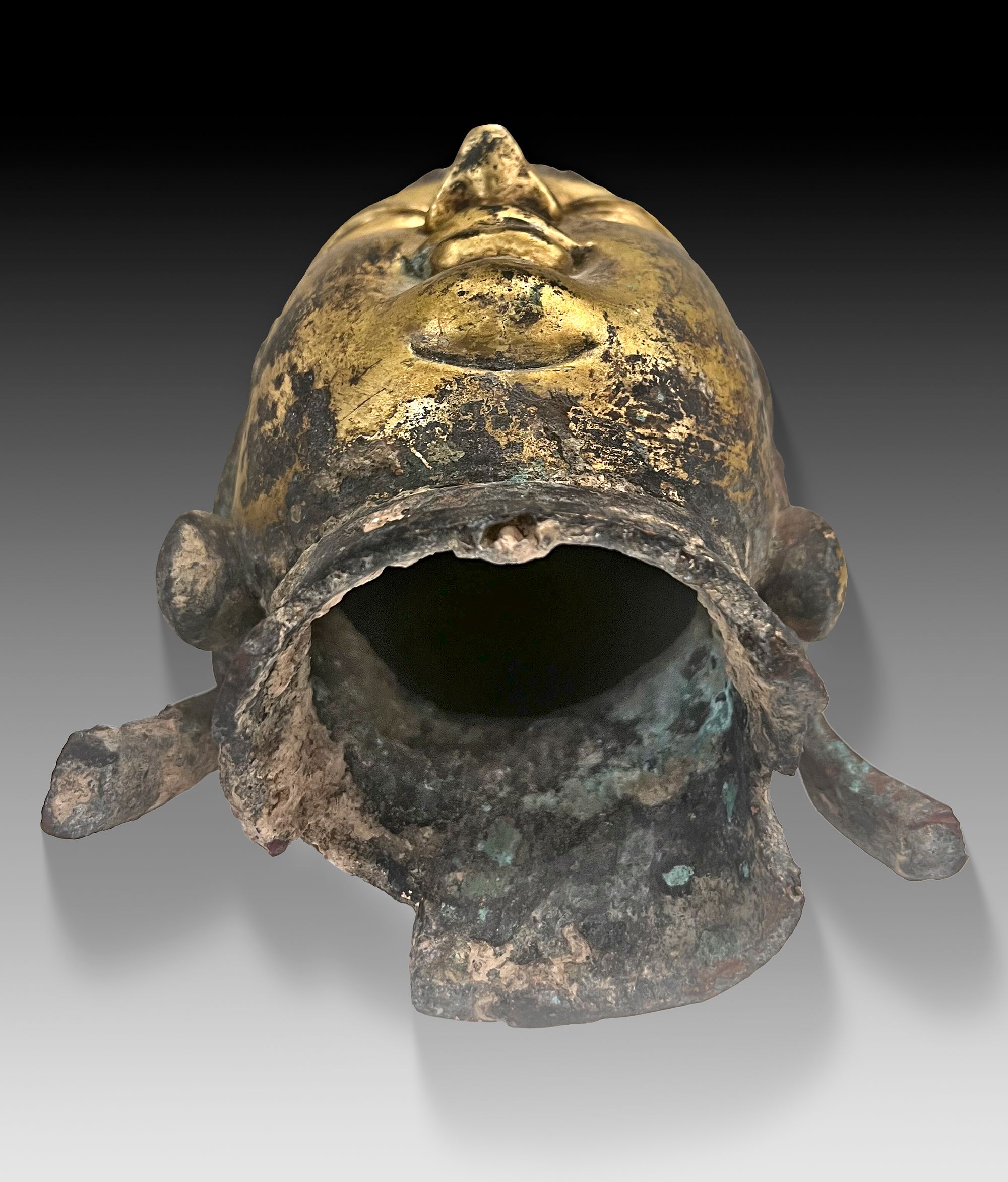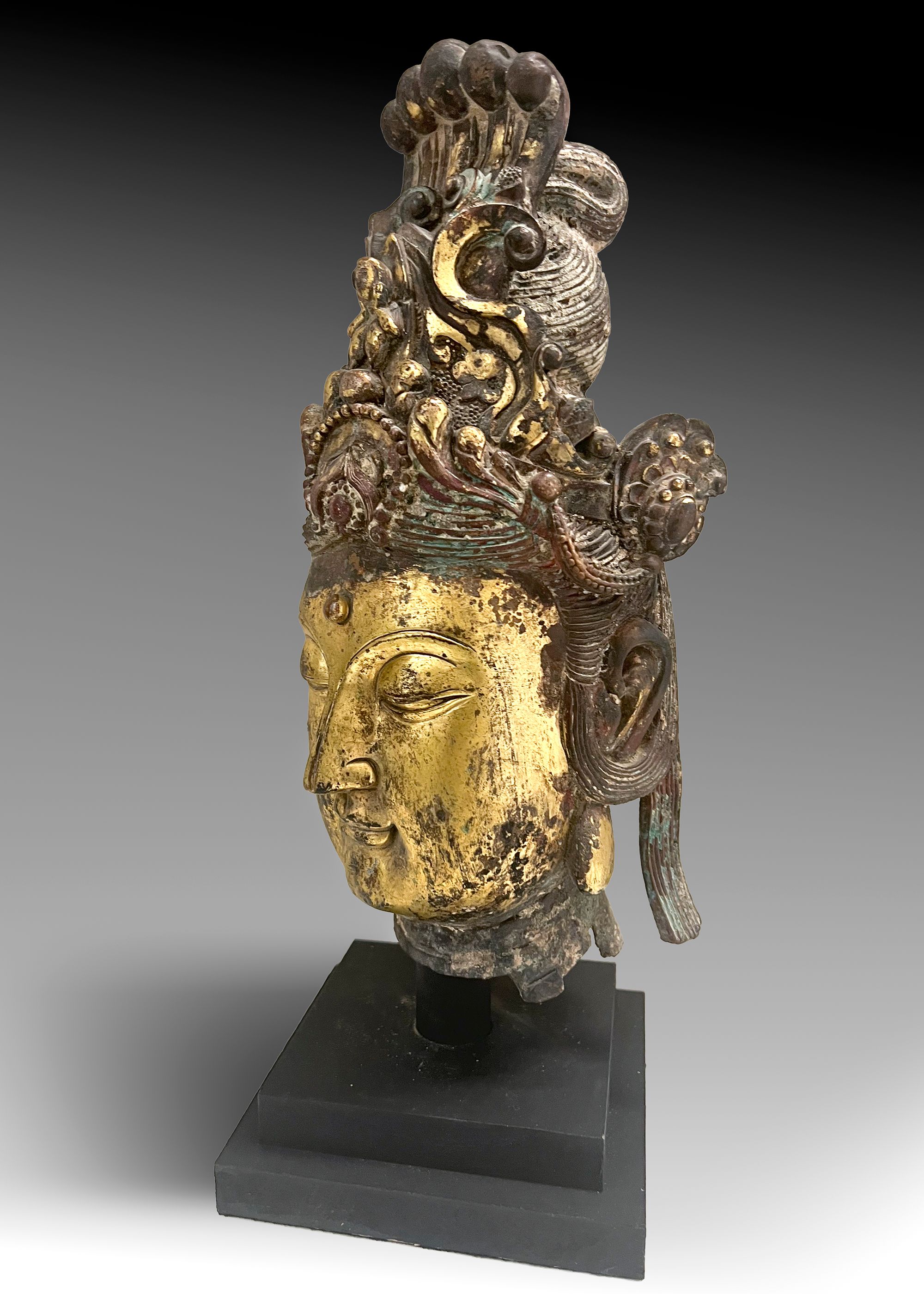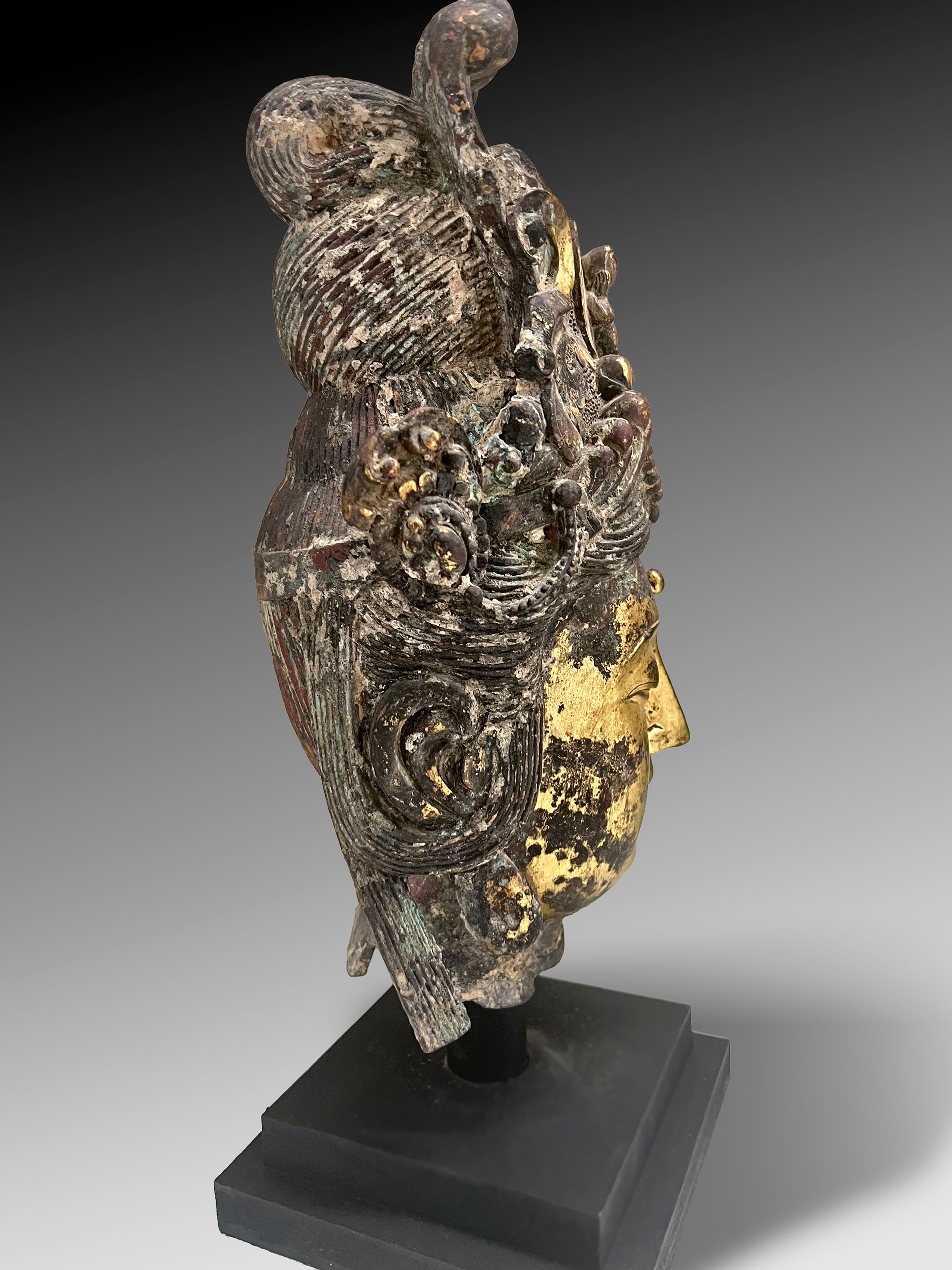 This impressive sculpture represents Guanyin, the Bodhisattva of Compassion, depicted with a serene and benevolent expression. The head is finely cast in bronze and richly gilded, showcasing exquisite detailing in the facial features, crown, and hair. The remains of gilding and patina attest to its antiquity and sacred purpose, while the elaborate headdress, adorned with floral and scrolling motifs, H. 31 cm.