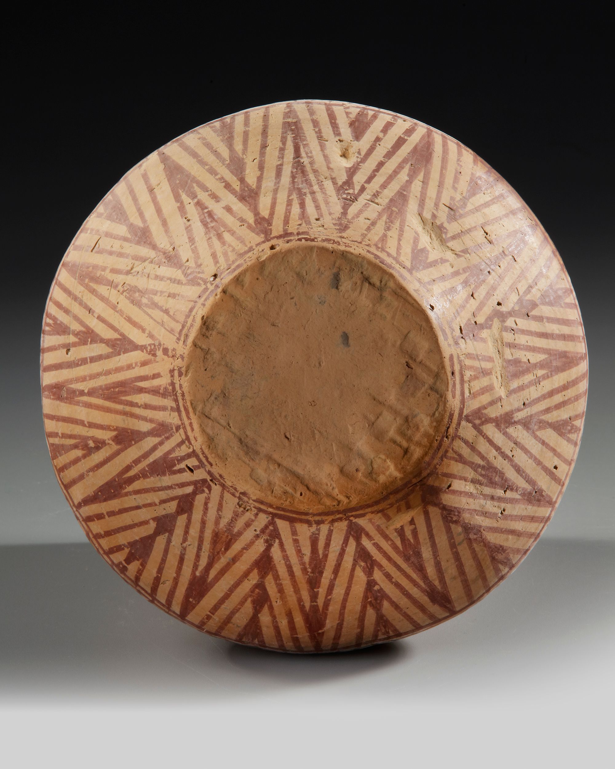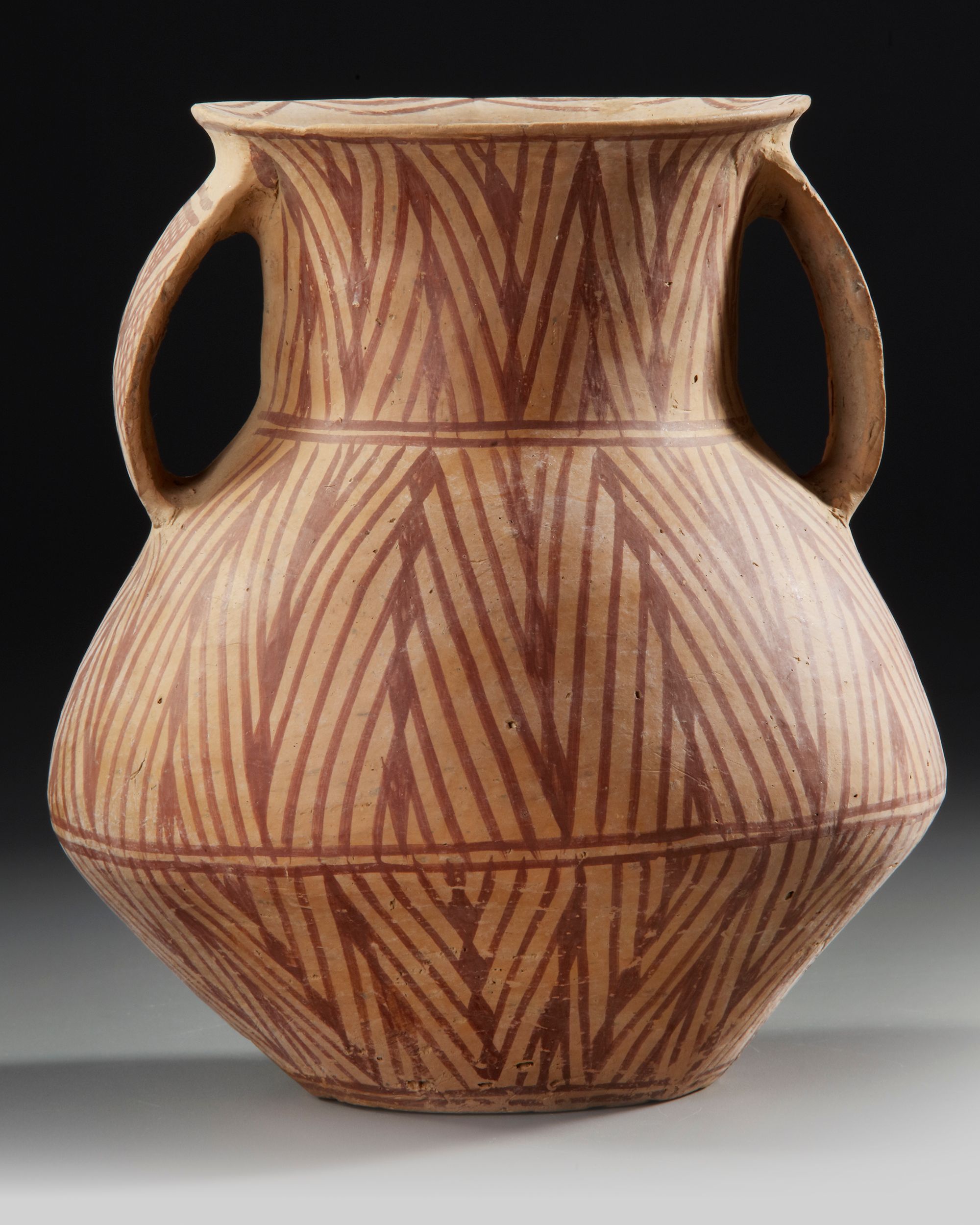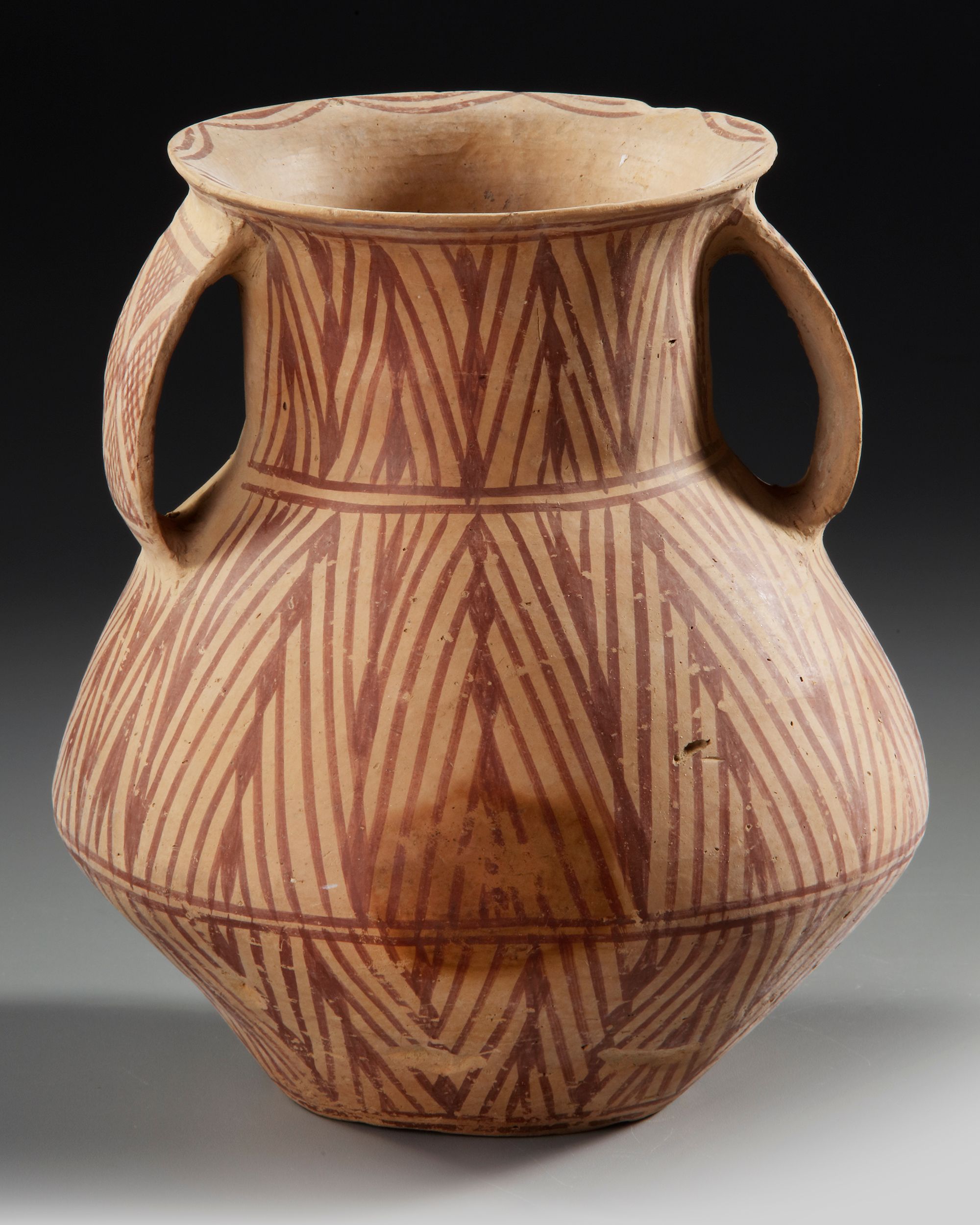A finely crafted Neolithic Ban Shan Culture jar from Gansu Province, 3rd millennium BC. Decorated with bold red linear geometric patterns across its rounded body and flaring neck.