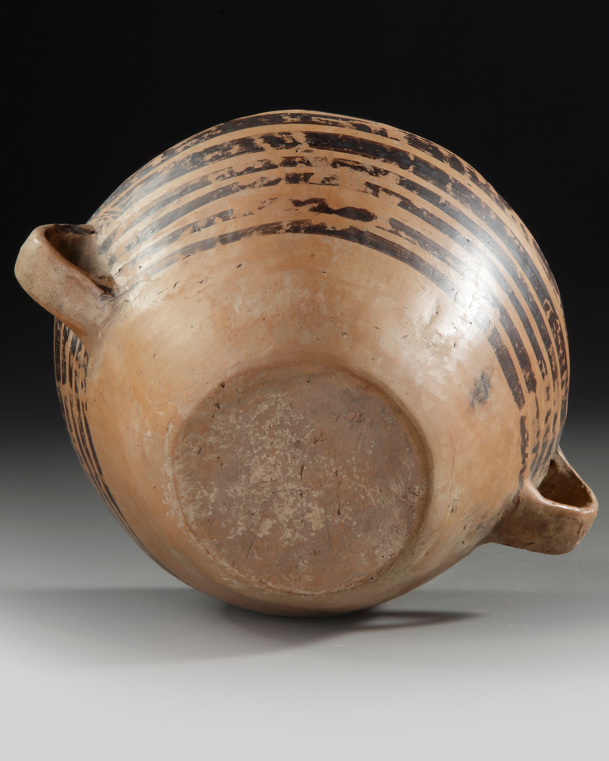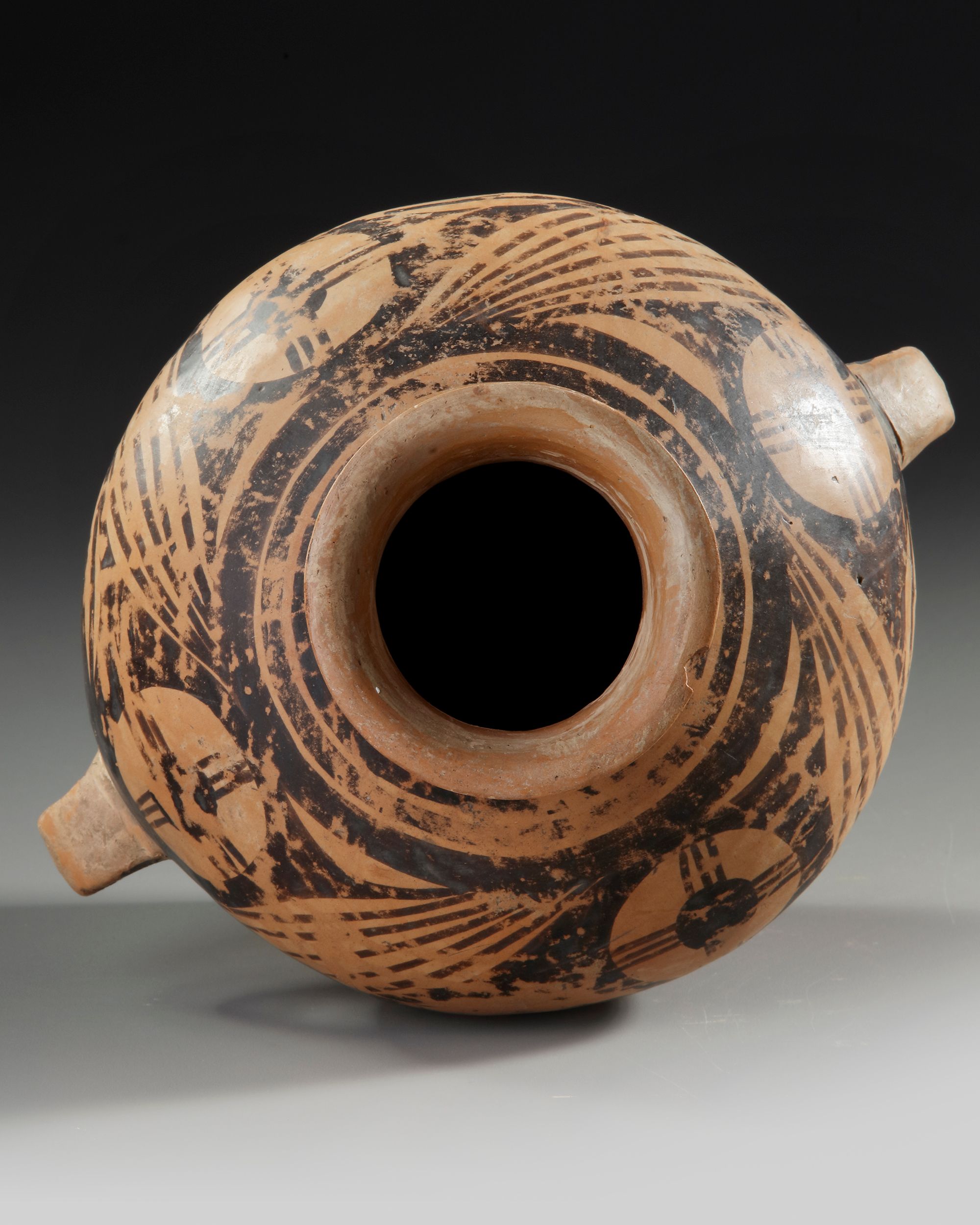 A classic Ban Shan Culture pottery vessel from Gansu Province, dating to the 3rd millennium BC or later. This jar features a tall flaring neck and dual side handles, decorated with bold geometric black-painted bands and a central circular motif on the shoulder. height: 21 cm.