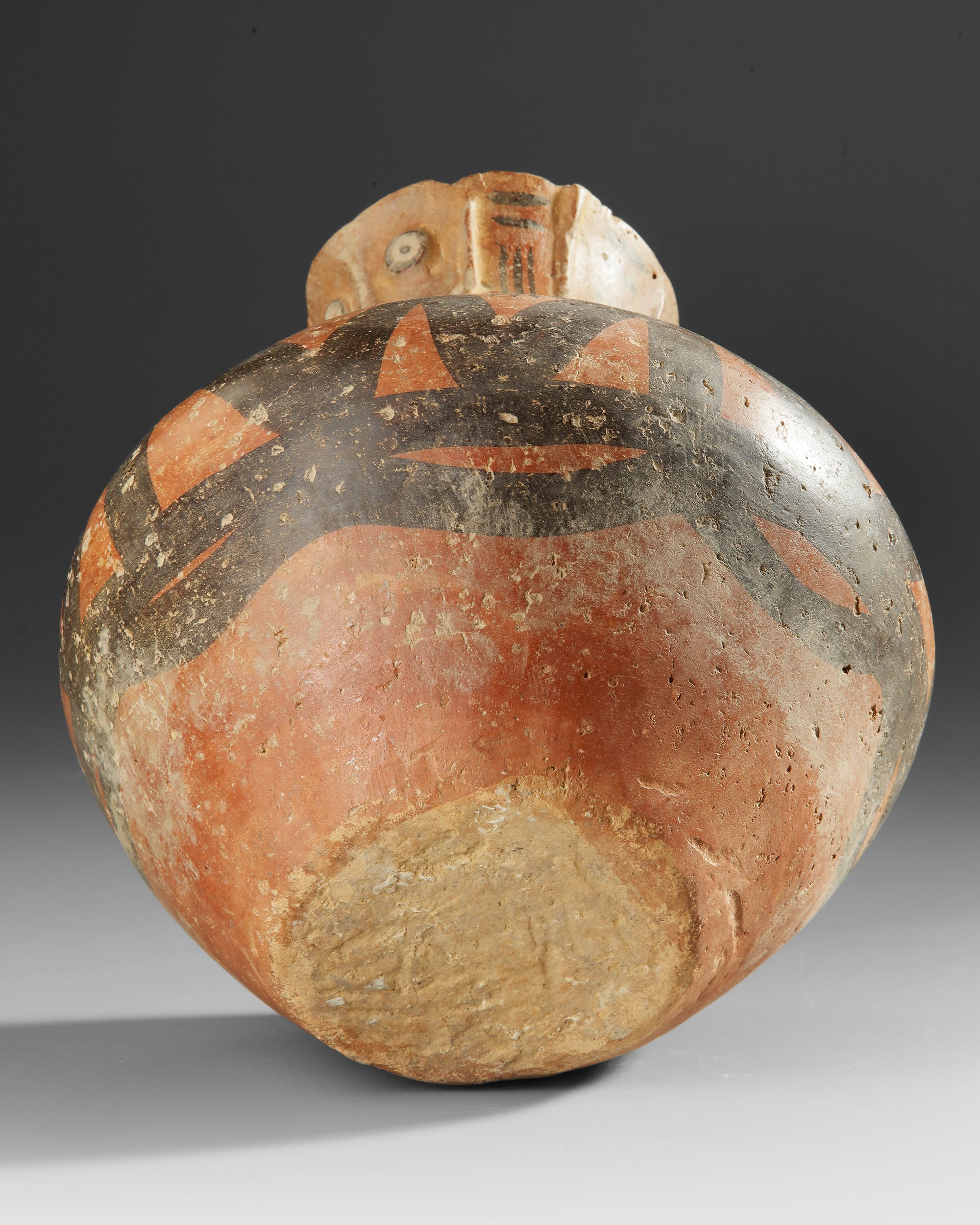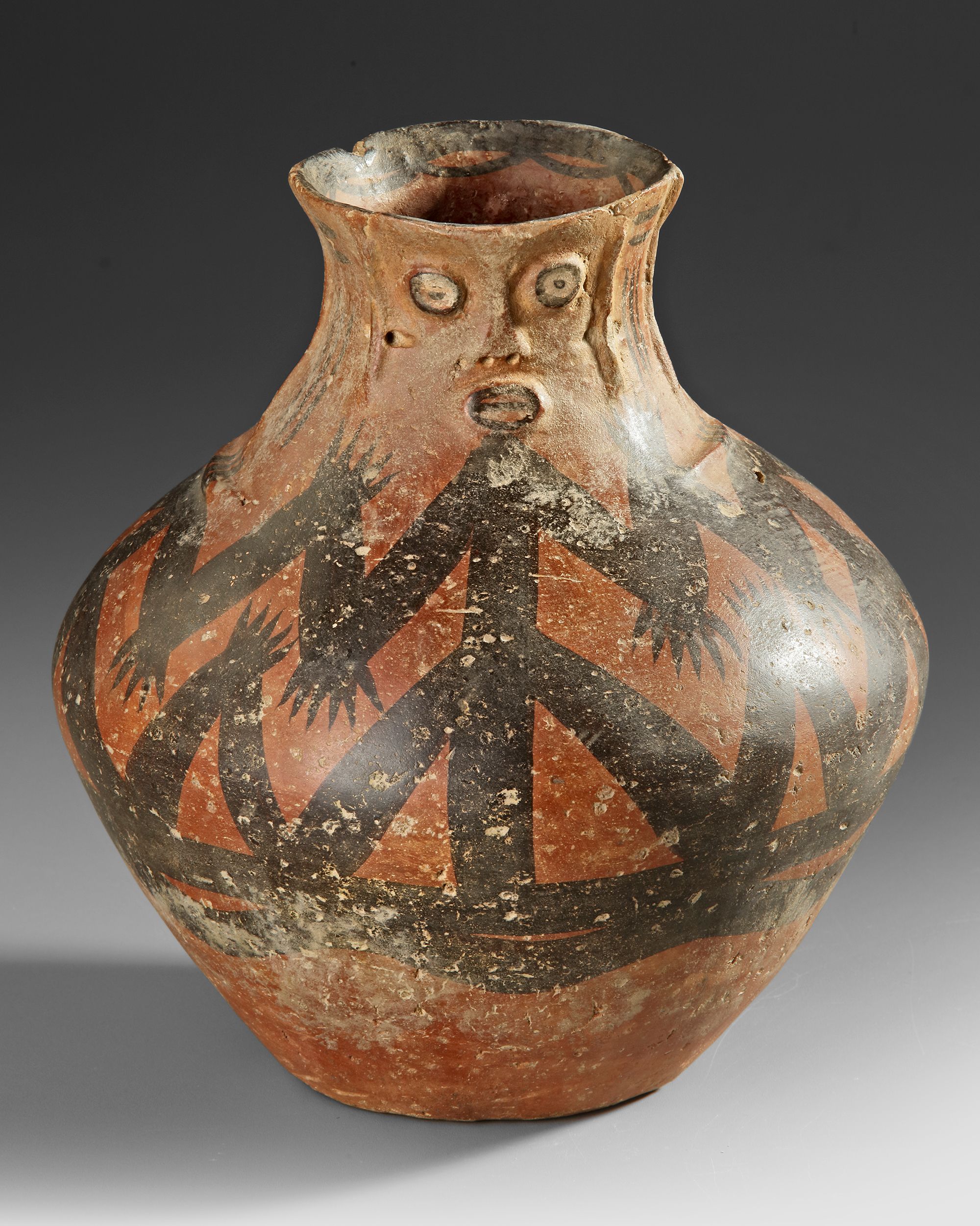 A rare Banshan Culture jar featuring a modeled human face on the neck and bold black–red geometric decoration around the body. Height 21 cm.