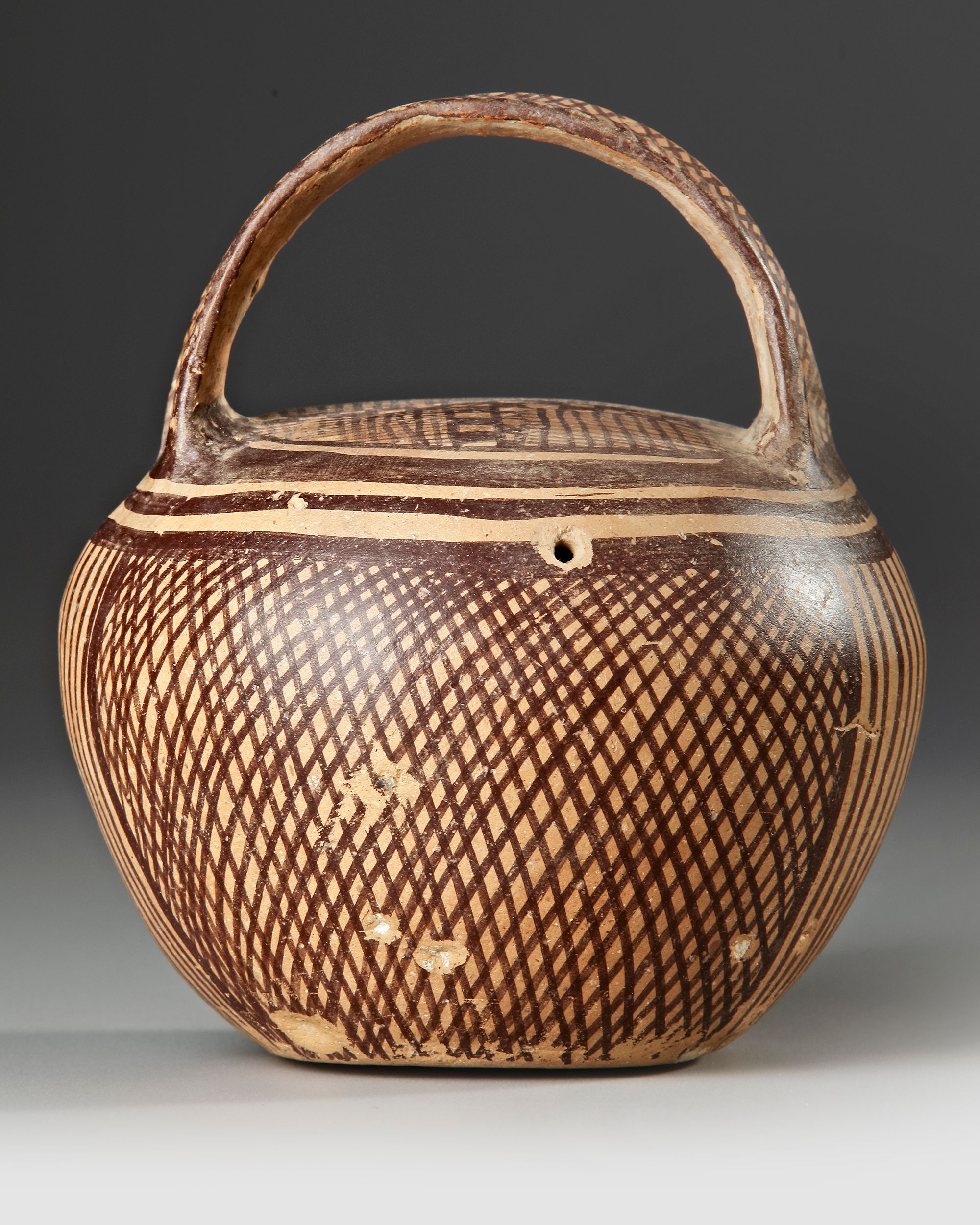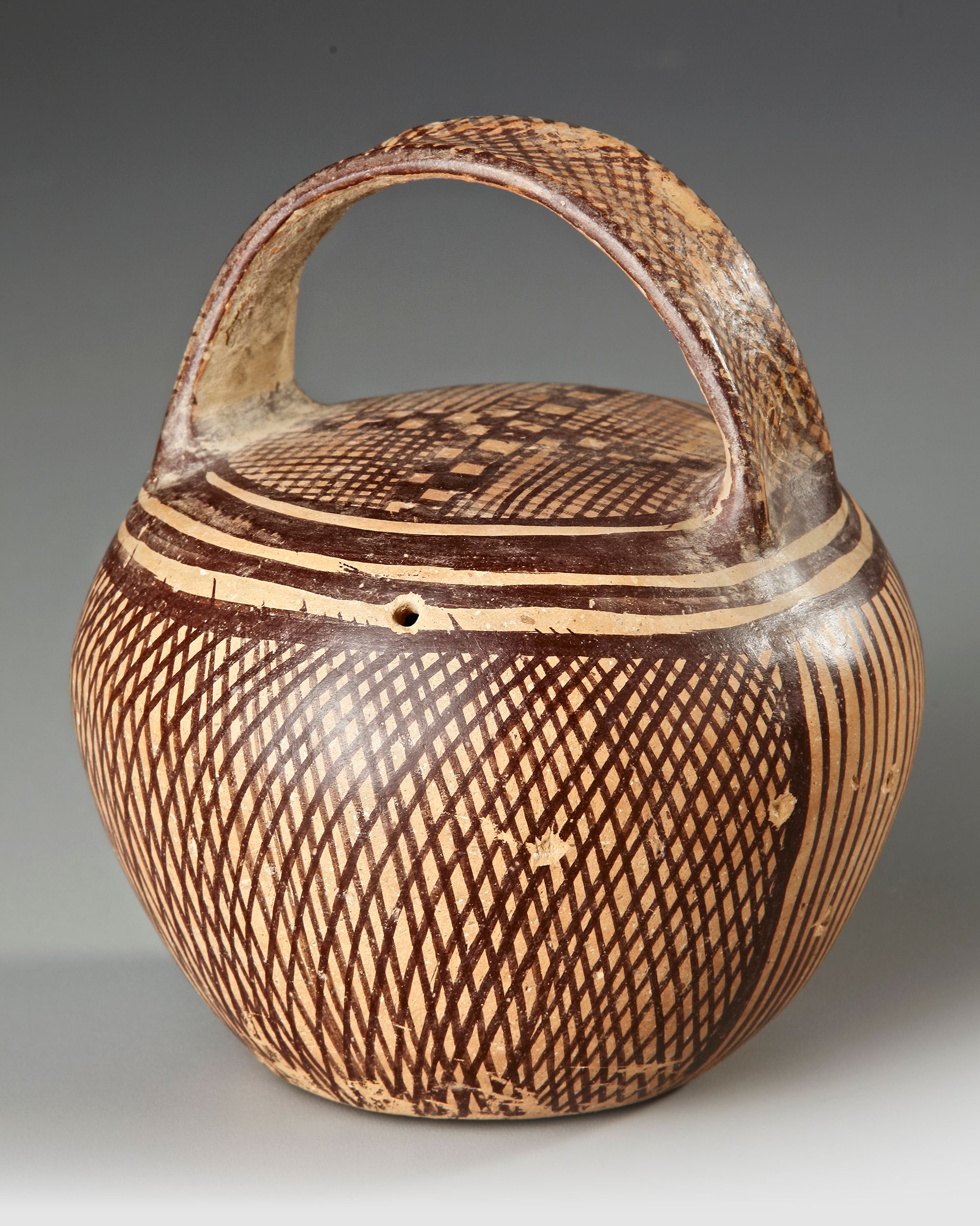 A round-handled Banshan Culture pottery jar decorated with dense crosshatch and geometric painted patterns in dark pigment, dating to the 3rd millennium BC.