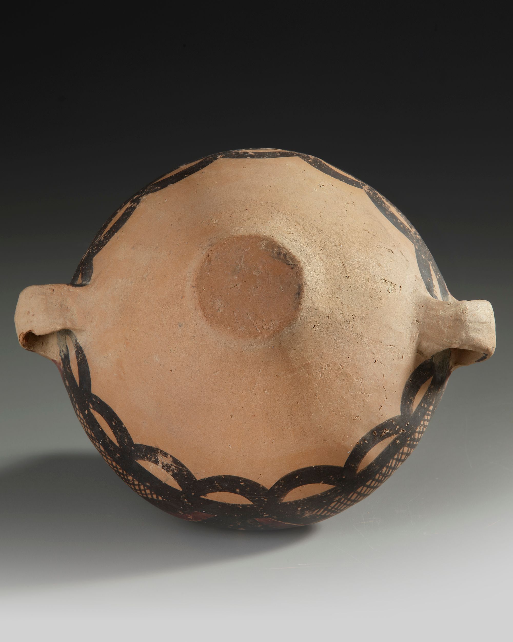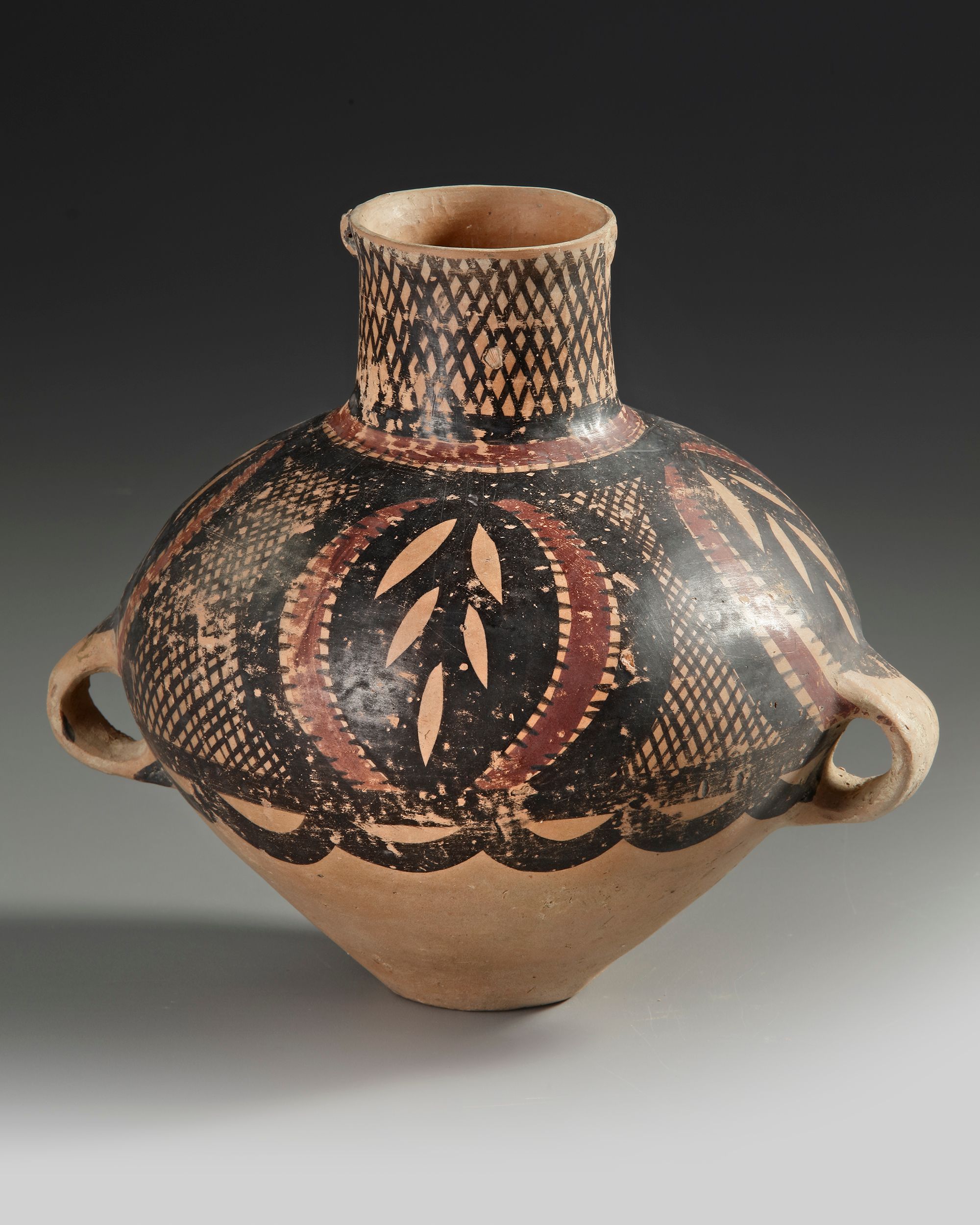 A classic Banshan Culture pottery jar with twin handles and bold geometric painted motifs in black and red, dating to the 3rd millennium BC or later.