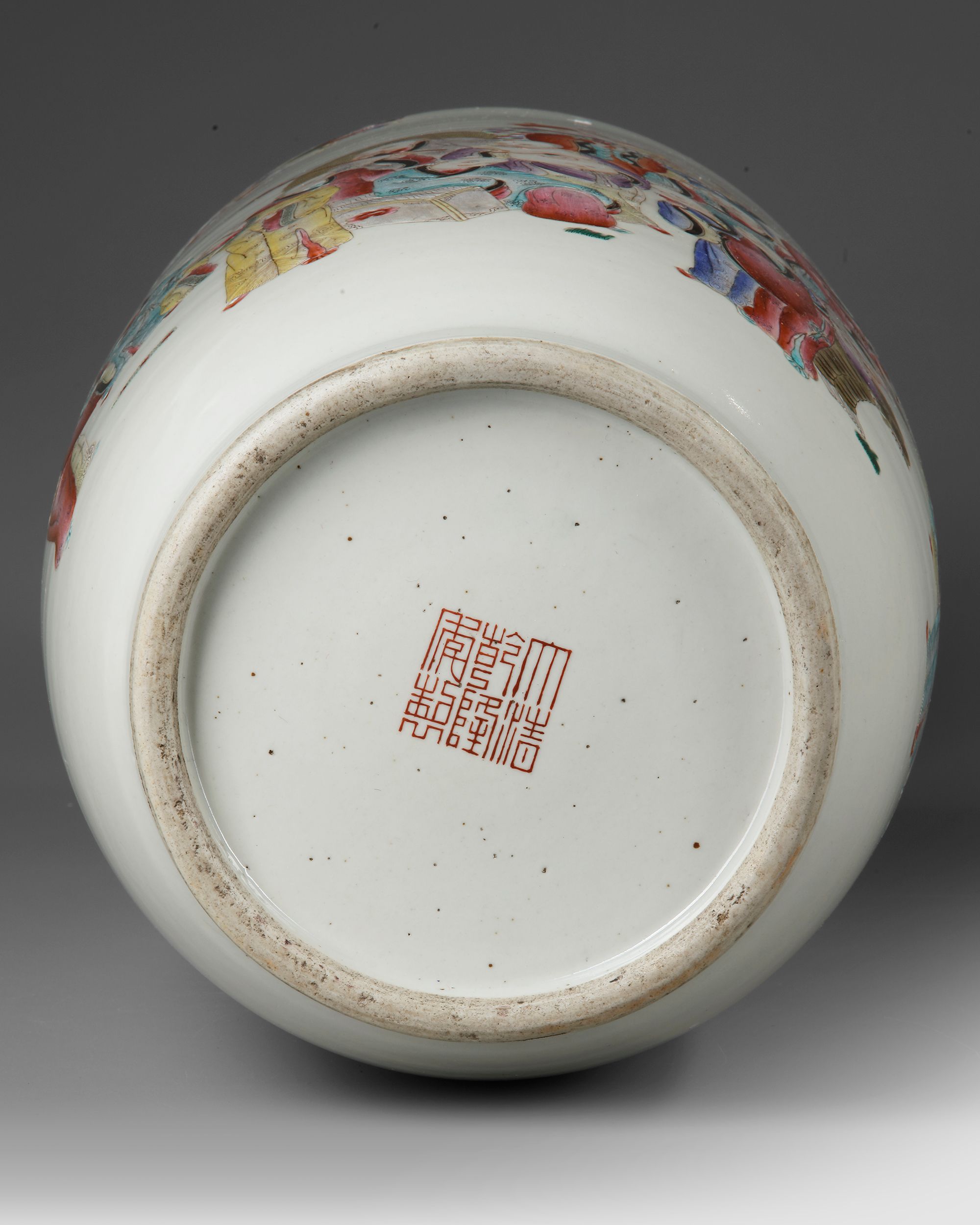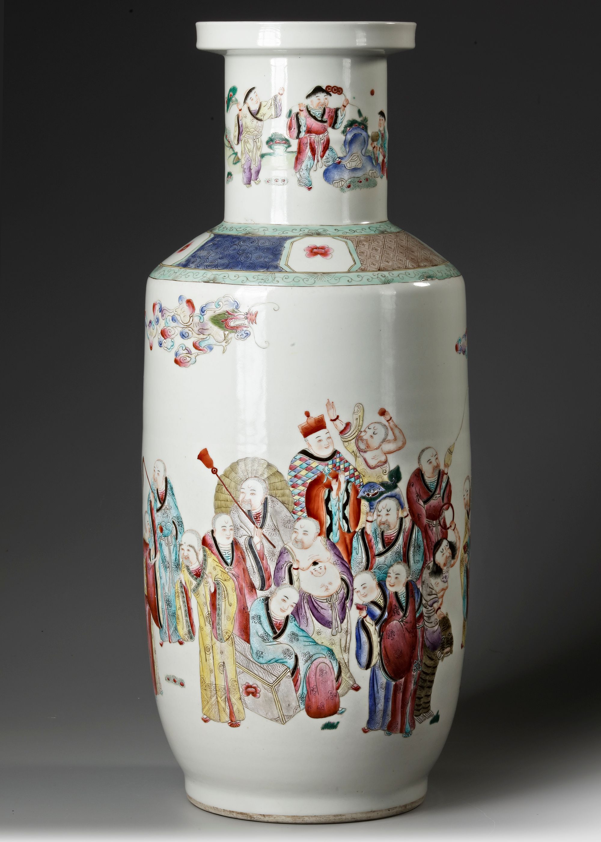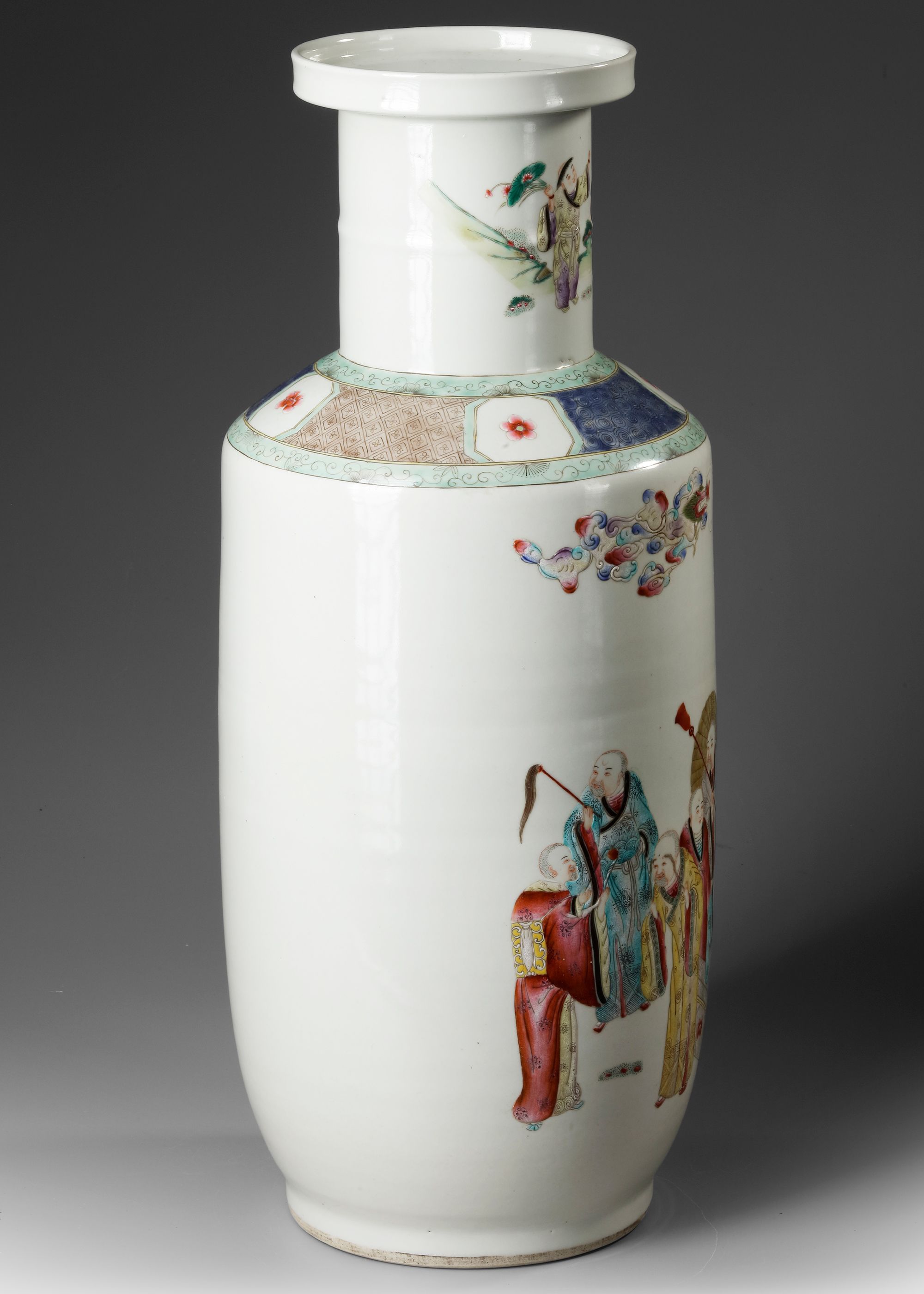 This impressive 19th-century famille rose vase features a tall cylindrical body rising to a wide, straight neck, beautifully adorned with finely detailed enamel decoration. The main register depicts a lively gathering of figures—scholars, attendants, and immortals—rendered in vibrant pinks, greens, yellows, and blues typical of famille rose palette. Each figure is carefully outlined and shaded, bringing expressive movement and narrative depth to the scene.
