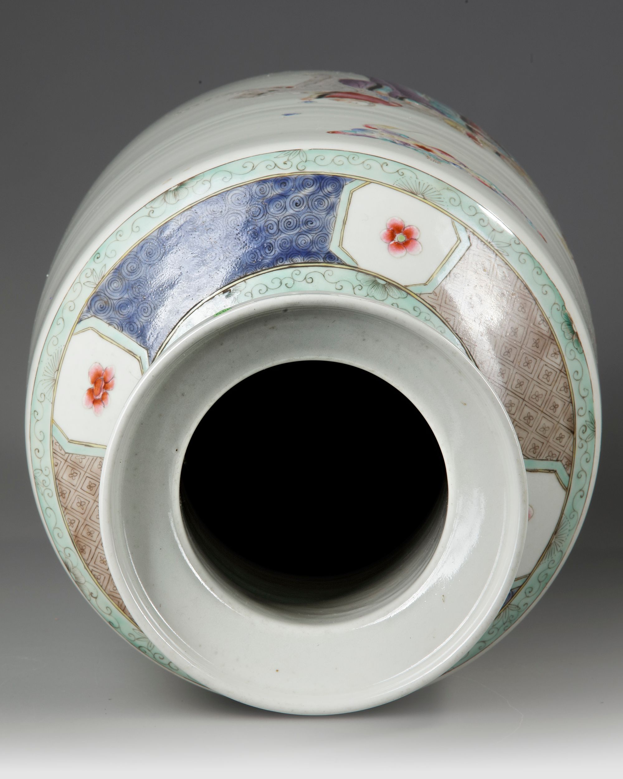 Around the shoulder, a band of hexagonal panels contains alternating floral motifs and geometric patterns, delicately executed with soft enamel tones. The neck continues the storytelling theme with smaller figures engaged in scholarly and celebratory activities, adding harmony between upper and lower sections.